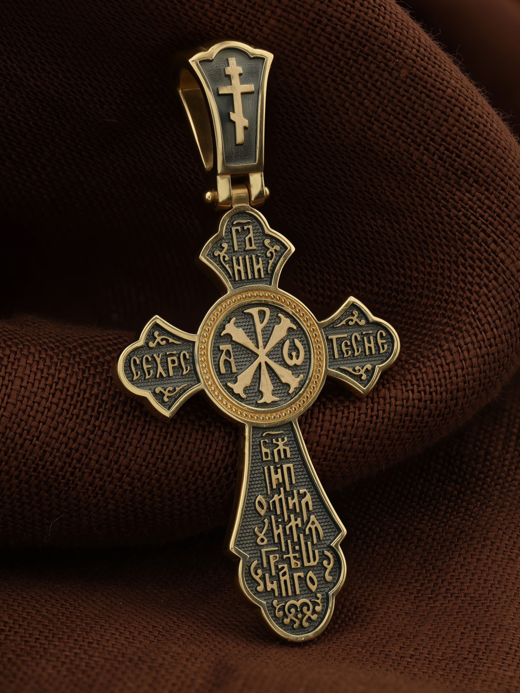 На боковых оконечностях креста размещены инициалы святого имени Христа «ИС ХС». В верхней оконечности креста имеется монограмма «Царь Славы», а в нижней оконечности  — надпись «НИКА» (Победитель).