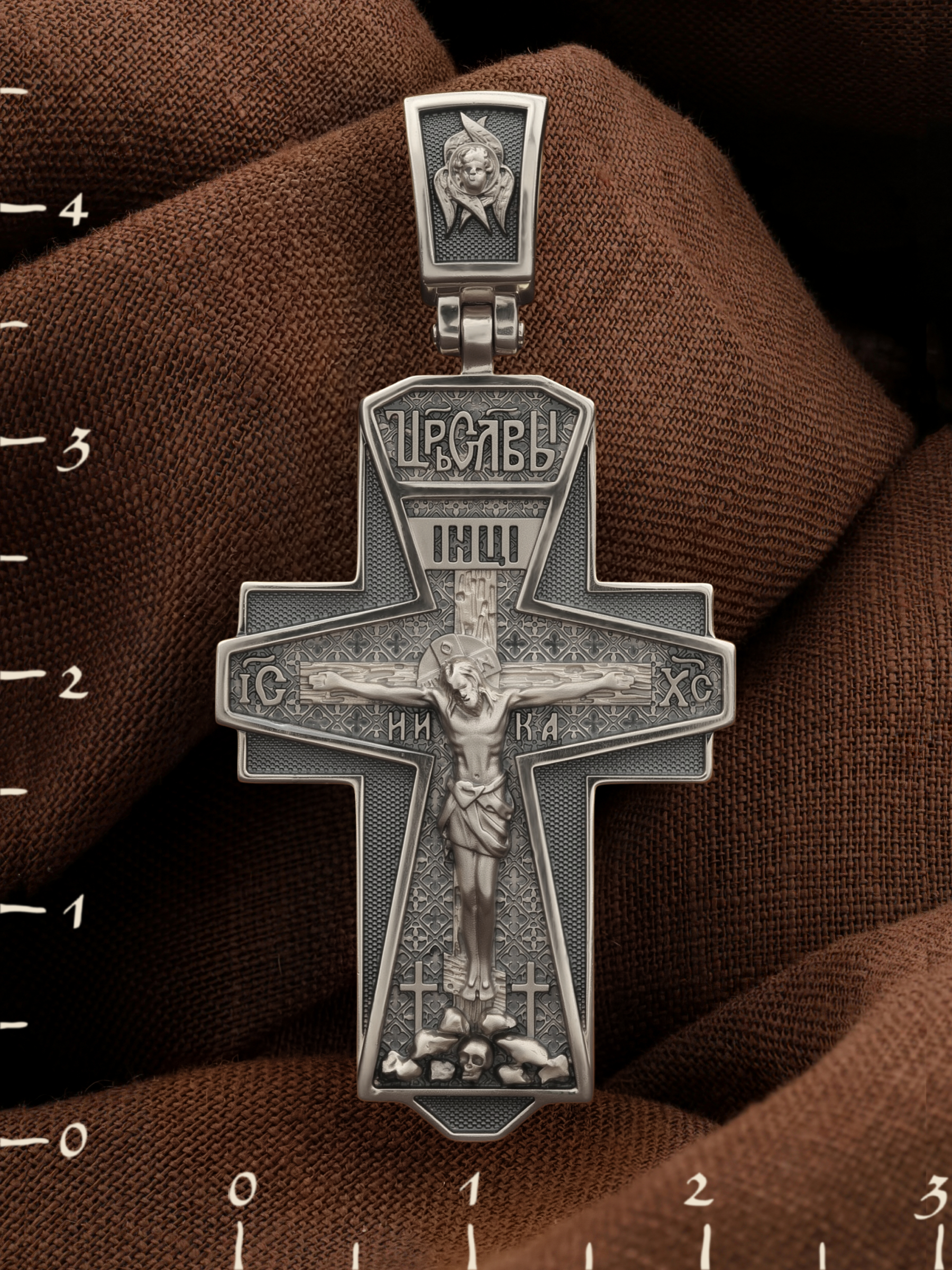 На лицевой стороне креста изображено Распятие, потому что это орудие казни Иисус Христос сделал орудием победы над грехом и смертью. Своими страданиями Он искупил грехи человечества, умерев и сошествовав во ад, победил сатану, освободил души праведников от вечной смерти и открыл им небесные врата рая. Жертва Христа сделала возможным спасение для каждого человека. На православном кресте Христос не умирает, а свободно простирает руки, ладони Иисуса открыты, будто он хочет обнять все человечество, даря им свою любовь и открывая путь к вечной жизни.