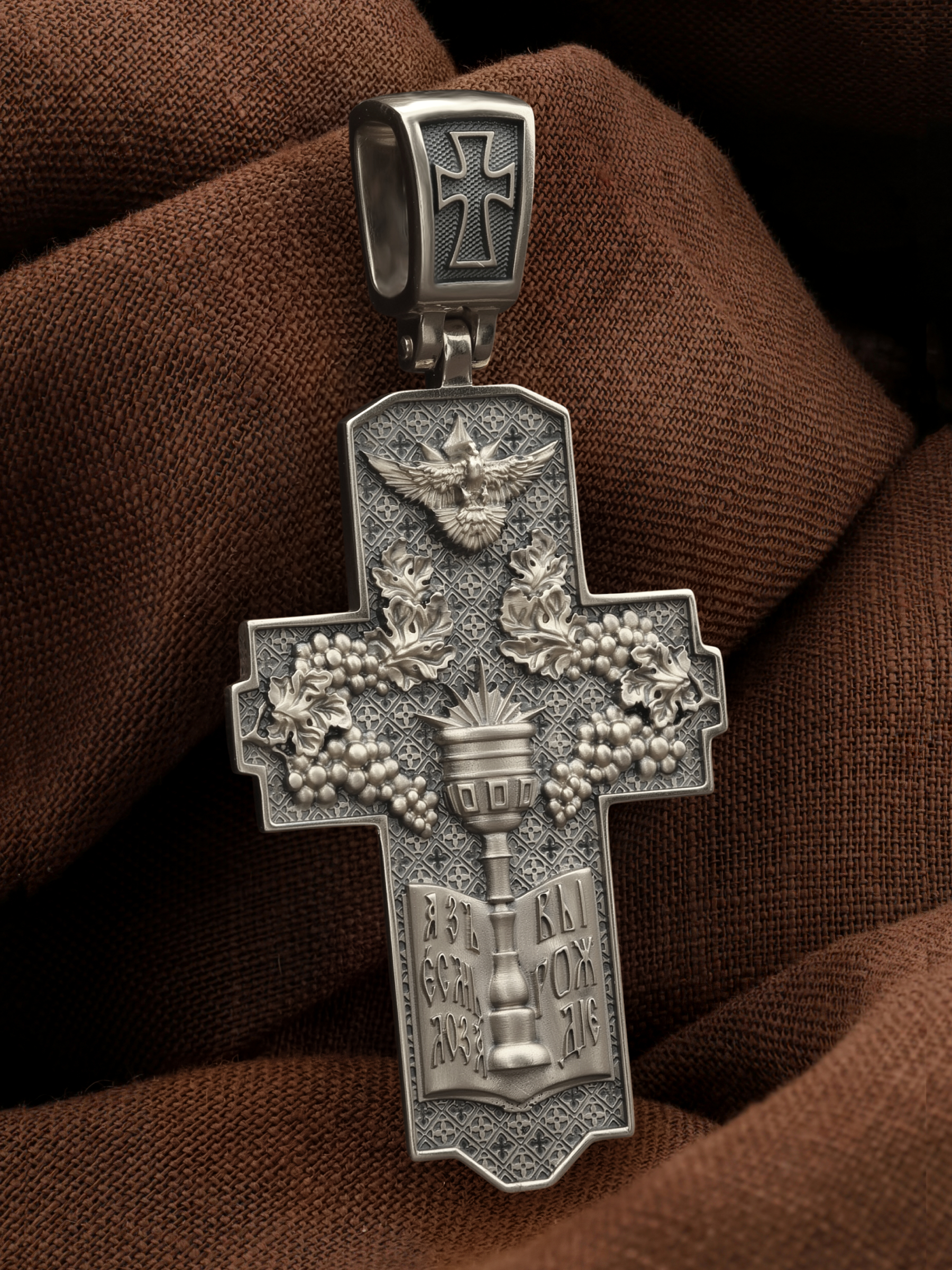 На обороте креста изображение голубя — символ Духа Святого, гроздья винограда — символы церкви и евхаристии, чаша и дискос — символ Таинства Причащения. «Я есмь лоза, — говорил Иисус Христос Своим ученикам, — а вы ветви; кто пребывает во Мне, и Я в нем, тот приносит много плода» (Ин. 15, 5), «Я есмь истинная виноградная лоза, а Отец Мой — виноградарь».