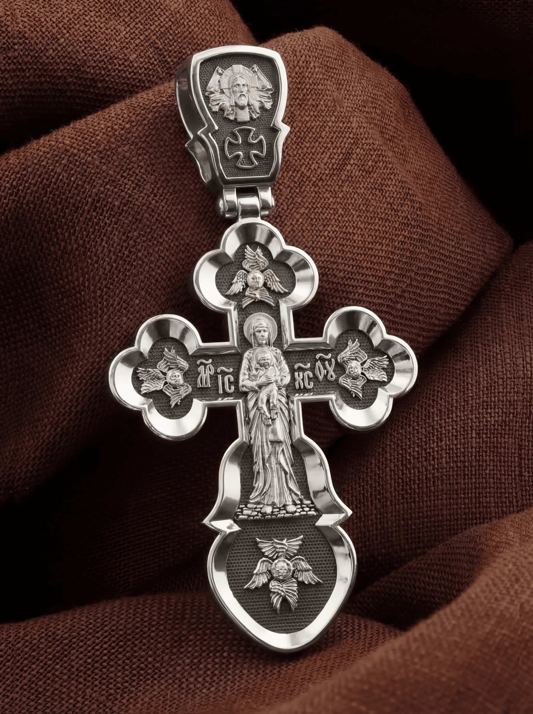 Распятие сопровождается иконографическими надписями, прославляющими Господа Иисуса Христа. На боковых оконечностях размещены инициалы святого имени Спасителя «IС ХС» и надпись «Сын Божий», обозначающая Его божественную природу. На подножии Креста можно прочитать надпись «НИКА» (Победитель) — символ победы Господа над смертью. Венчает лицевую сторону образ Святого Духа в виде голубя.