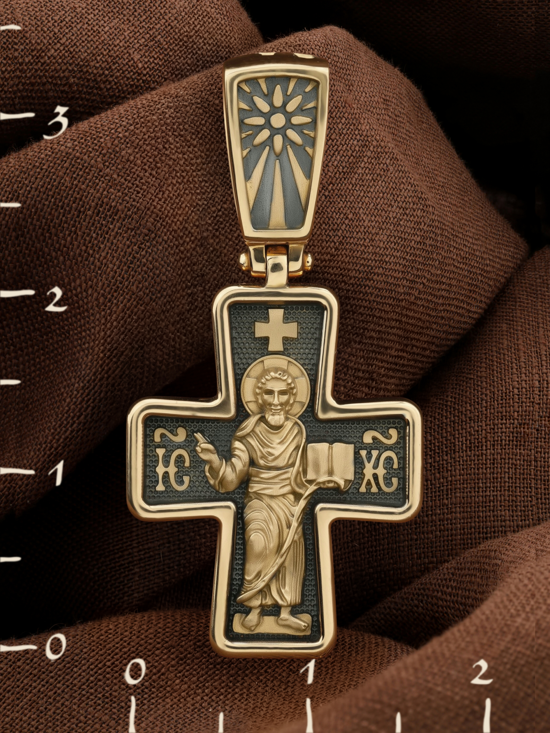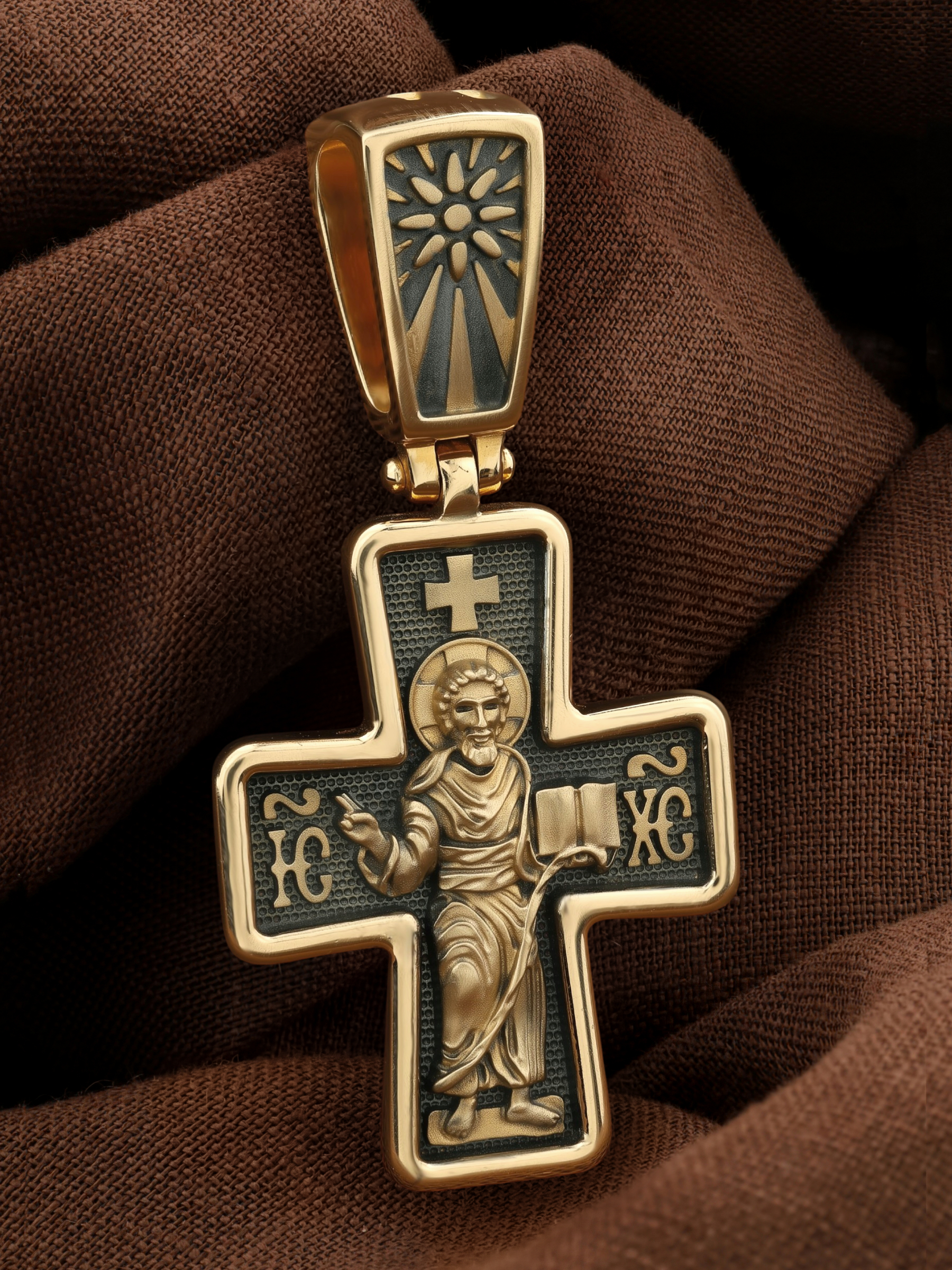 На лицевой стороне креста изображена икона Господа и Спасителя нашего Иисуса Христа  — Господь Вседержитель или Пантократор. Он представлен как Царь Небесный и будущий Судия мира. Именование Иисуса «Вседержителем» указывает, с одной стороны, на Его Божественную природу: «Аз есмь Альфа и Омега, начало и конец, говорит Господь, Который есть и был и грядет, Вседержитель» (Откр. 1: 8). С другой стороны, такое именование связано и с человеческой природой Христа, искупившего крестной жертвой людские грехи и обновившего тем самым человеческую природу. Правой рукой Он благословляет, а левой держит Книгу. Она символизирует Евангелие — благую весть, принесенную Христом всему миру. Указывая на раскрытое Евангелие и одновременно благословляя, Иисус недвусмысленно указывает нам путь к спасению души.