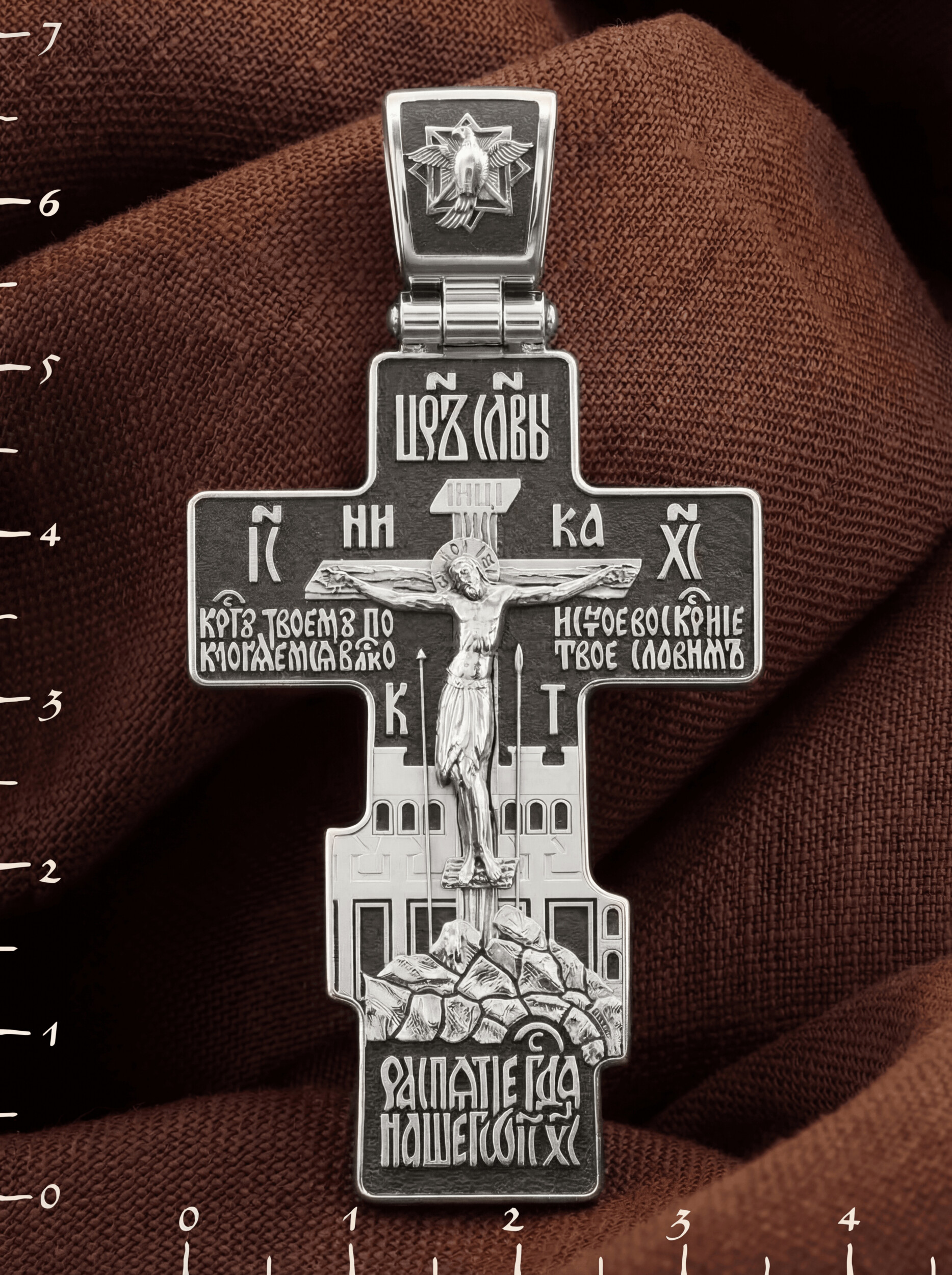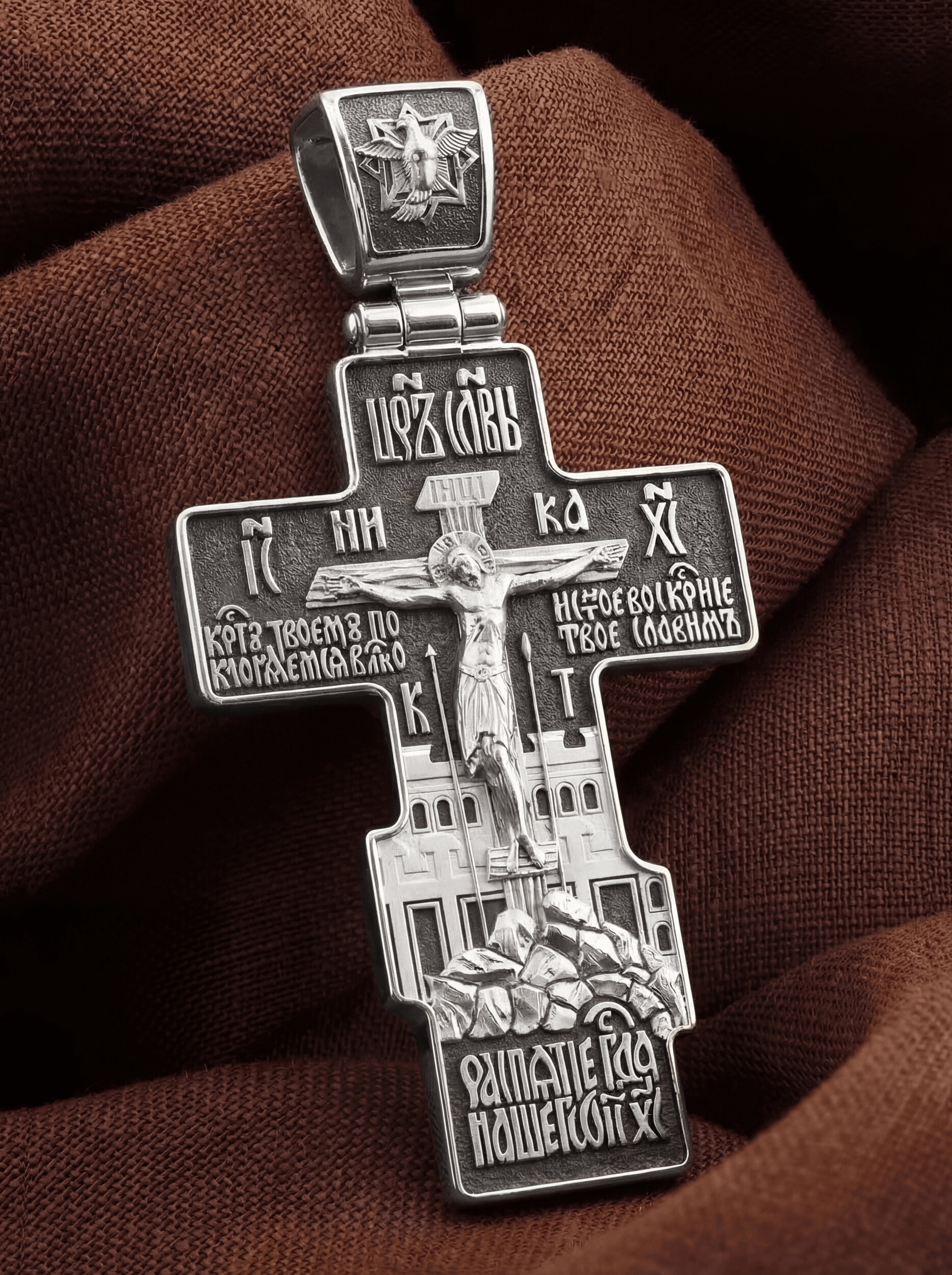 На лицевой стороне креста изображено Распятие, потому что это орудие казни Иисус Христос сделал орудием победы над грехом и смертью. Своими страданиями Он искупил грехи человечества, умерев и сошествовав во ад, победил сатану, освободил души праведников от вечной смерти и открыл им небесные врата рая. Жертва Христа сделала возможным спасение для каждого человека. На православном кресте Христос не умирает, а свободно простирает руки, ладони Иисуса открыты, будто он хочет обнять все человечество, даря им свою любовь и открывая путь к вечной жизни. Над титлом видим слова «ЦРЬ СЛВЫ» — Царь Славы. Верхняя перекладина символизирует собой табличку с надписью «IHЦI» — Иисус Назарянин Царь Иудейский. Над перекладиной пишется слово «НИКА» (греч. — Победитель), рядом добавляется имя Спасителя «IC XC» — Иисус Христос. Возвышение, на котором стоит Крест, символизирует гору Голгофу, на которой произошло Распятие. У подножия Креста изображают прах Адама, обозначенный черепом. Позади — Иерусалимская стена. Крест сопровождают слова: «Распятие Господа нашего Иисуса Христа. Кресту Твоему поклоняемся, Владыко. И святое Воскресение Твое славим».