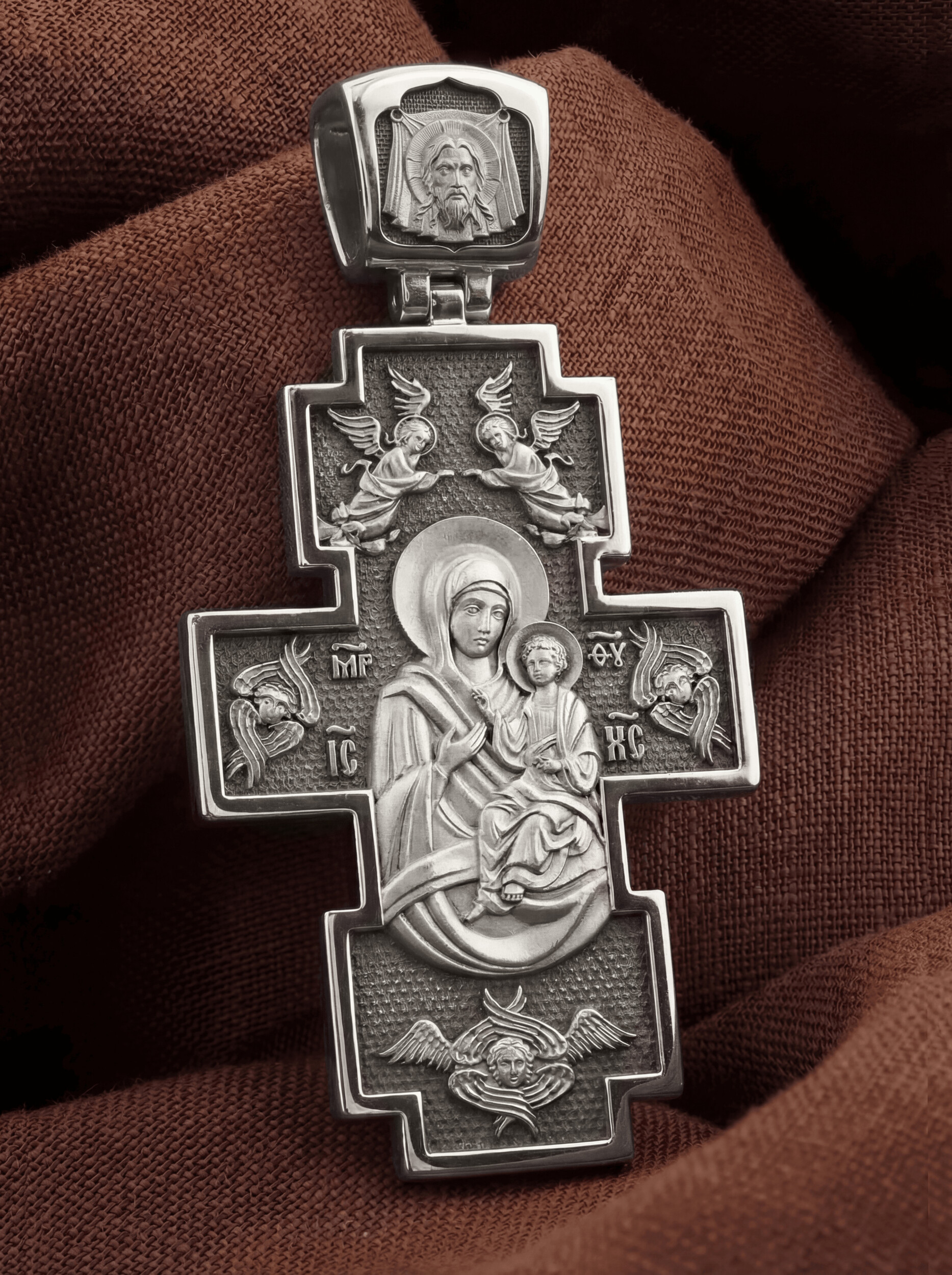 На лицевой стороне креста изображено Распятие Христово — величественный, торжественный образ христианства, знак победы над смертью. Христос, принеся Себя в Жертву на Кресте, искупил грехи всего мира и дал людям возможность обрести спасение. Слева и справа от Креста стоят Богоматерь и апостол Иоанн Богослов. По преданию, именно они до последнего не оставляли Спасителя в Его страданиях, были с Ним до самой смерти. Во главе образка изображен парящий голубь — символ Святого Духа и Его благодати. Сверху над Распятием парят Ангелы. Они изображены летящими с Небес вниз, к Кресту. Ангелы словно поддерживают табличку над головой Спасителя, на которой написано IНЦИ — «Иисус Назарянин Царь Иудейский». Эта табличка — титло — была приколочена римскими палачами как указание на «вину» Христа, то, за что Он был казнен.