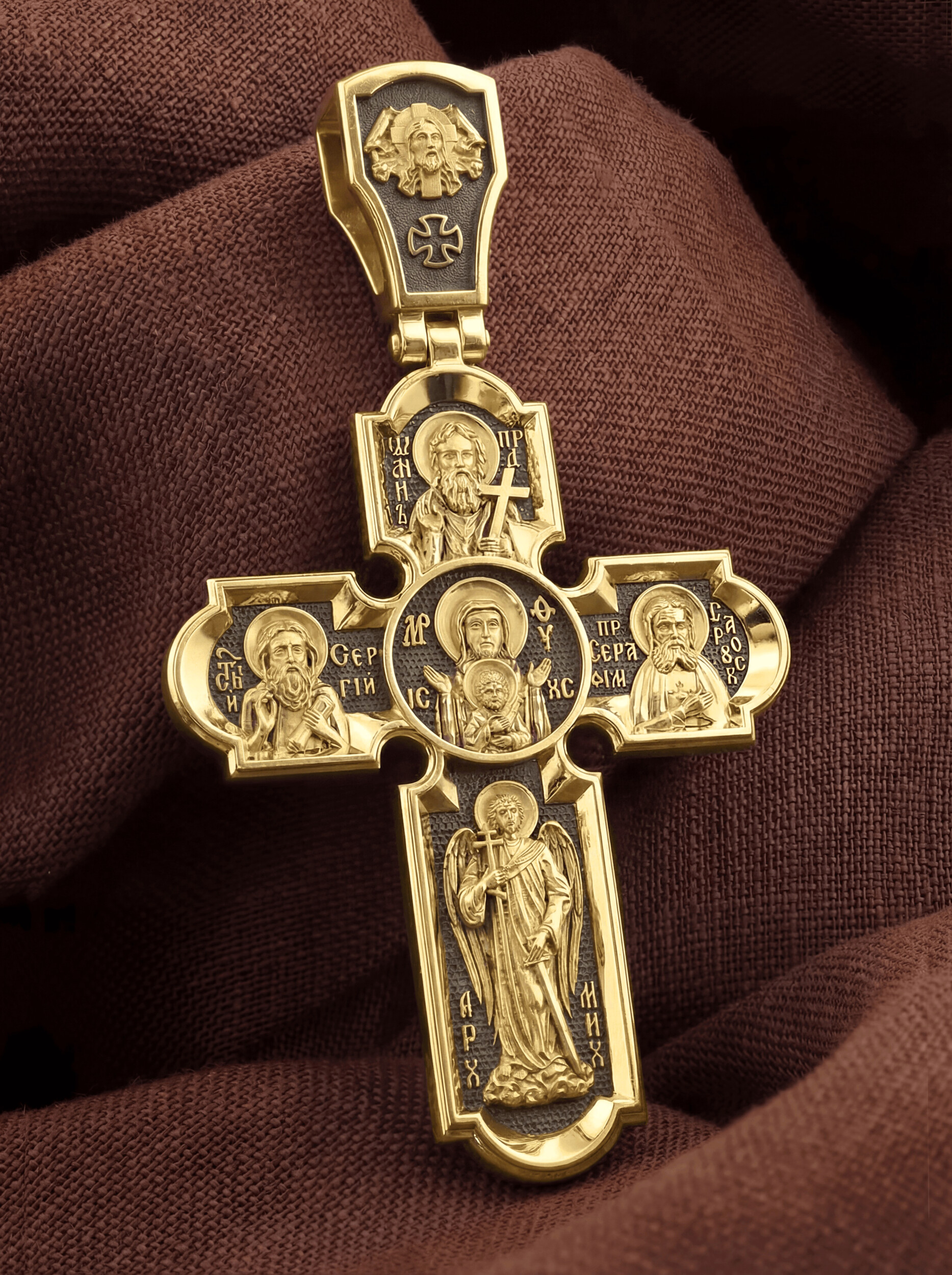 Центральную часть оборота креста украшает икона Божией Матери «Знамение». Икона «Знамение» написана по пророчеству пророка Исайи, предрекшего, что Господь Иисус Христос родится от Девы. На кресте внизу изображен Архангел Михаил, слева — прп. Сергий Радонежский, справа — образ Преподобного Серафима Саровского, вверху — последний пророк, почитающийся в христианстве, Предтеча Господень Иоанн Креститель. На кулонном кольце помещено изображение Спаса Нерукотворного — образ Спасителя, который Он запечатлел на плате и передал для исцеления больному проказой царю Эдессы. Ему придается победное и защитное значение.