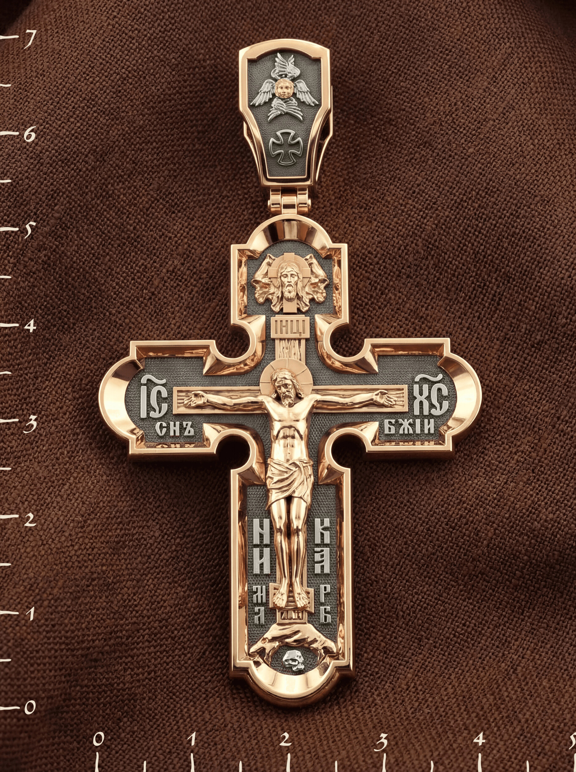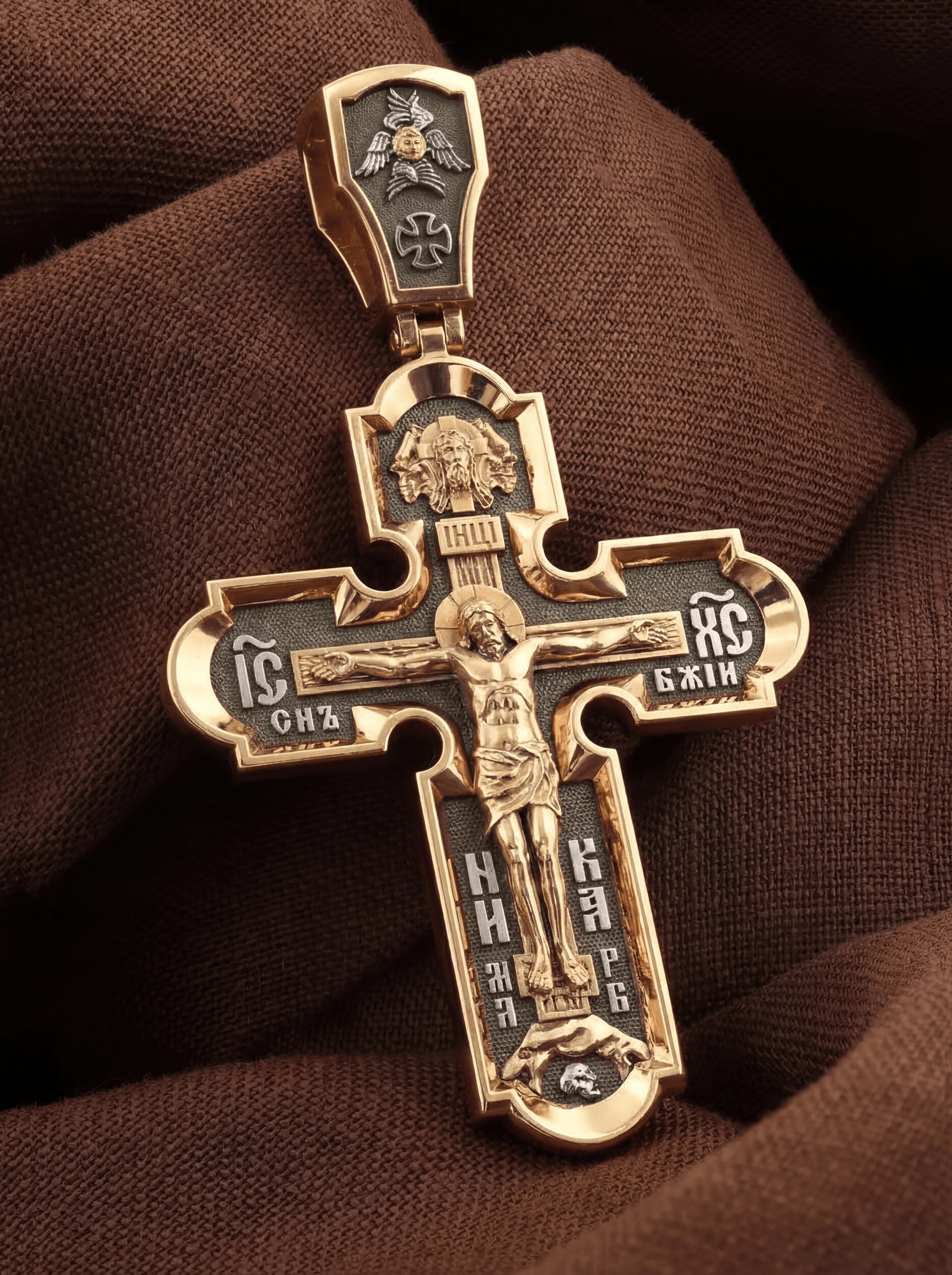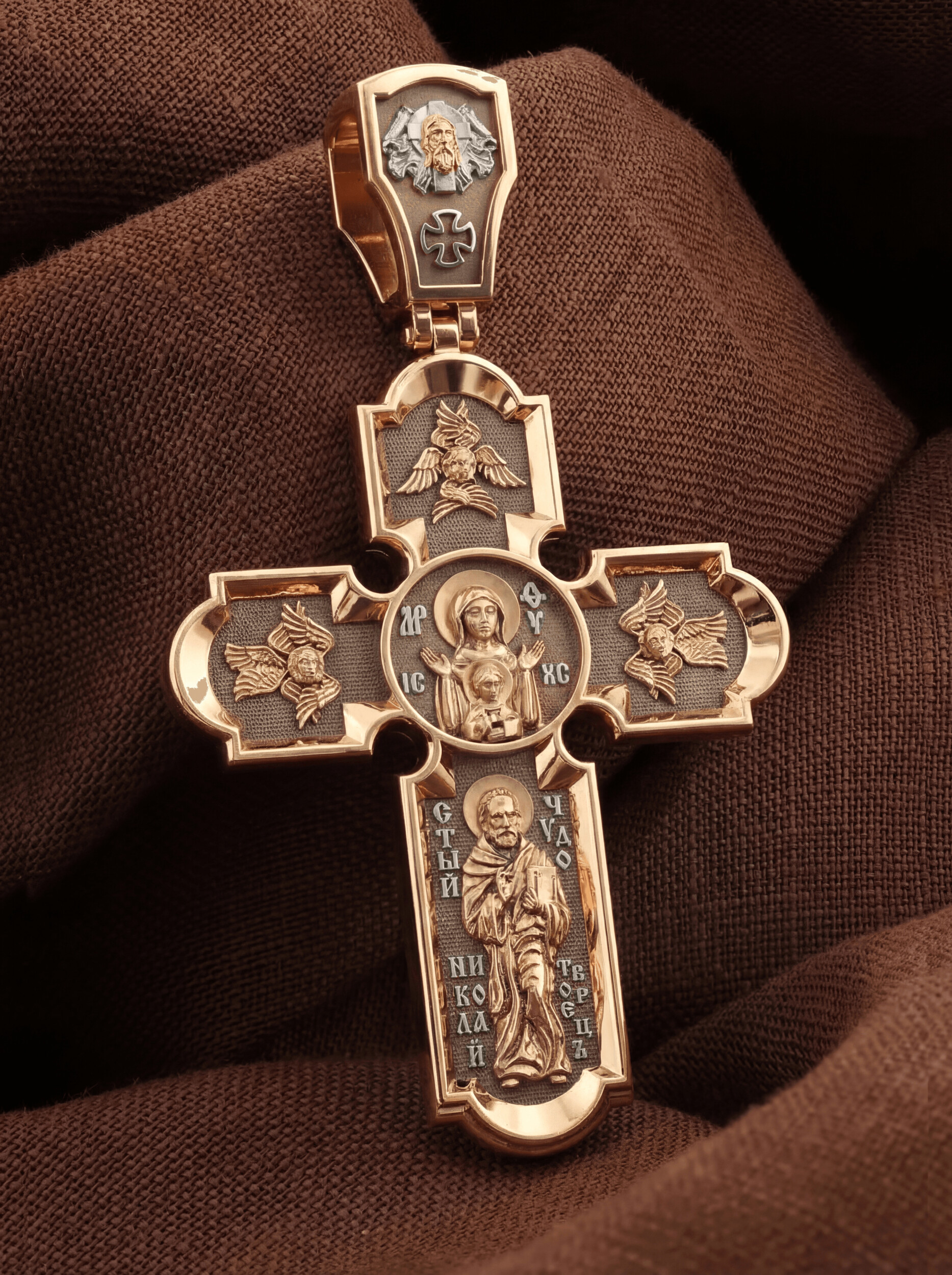 На лицевой стороне нательного креста по традиции изображено Распятие Господа нашего Иисуса Христа. Крест Господень стоит на небольшом каменистом возвышении, символизирующем гору Голгофу, которая обозначена буквами МЛРБ (Место Лобное Рай Бысть). Над головой Господа на поперечной перекладине написано «ИНЦИ», что символизирует табличку, которая была прибита к Кресту, с надписью «Иисус Назорей Царь Иудейский». Этим иудеи хотели посмеяться над Христом, не зная, что распинают истинного Царя всех царей. По сторонам основной перекладины расположены позолоченные рельефные инициалы Христа «ИС ХС». Под перекладиной, по сторонам древа, находится надпись «СЫН БОЖИЙ», а в основании креста — надпись «НИКА» (Победитель).