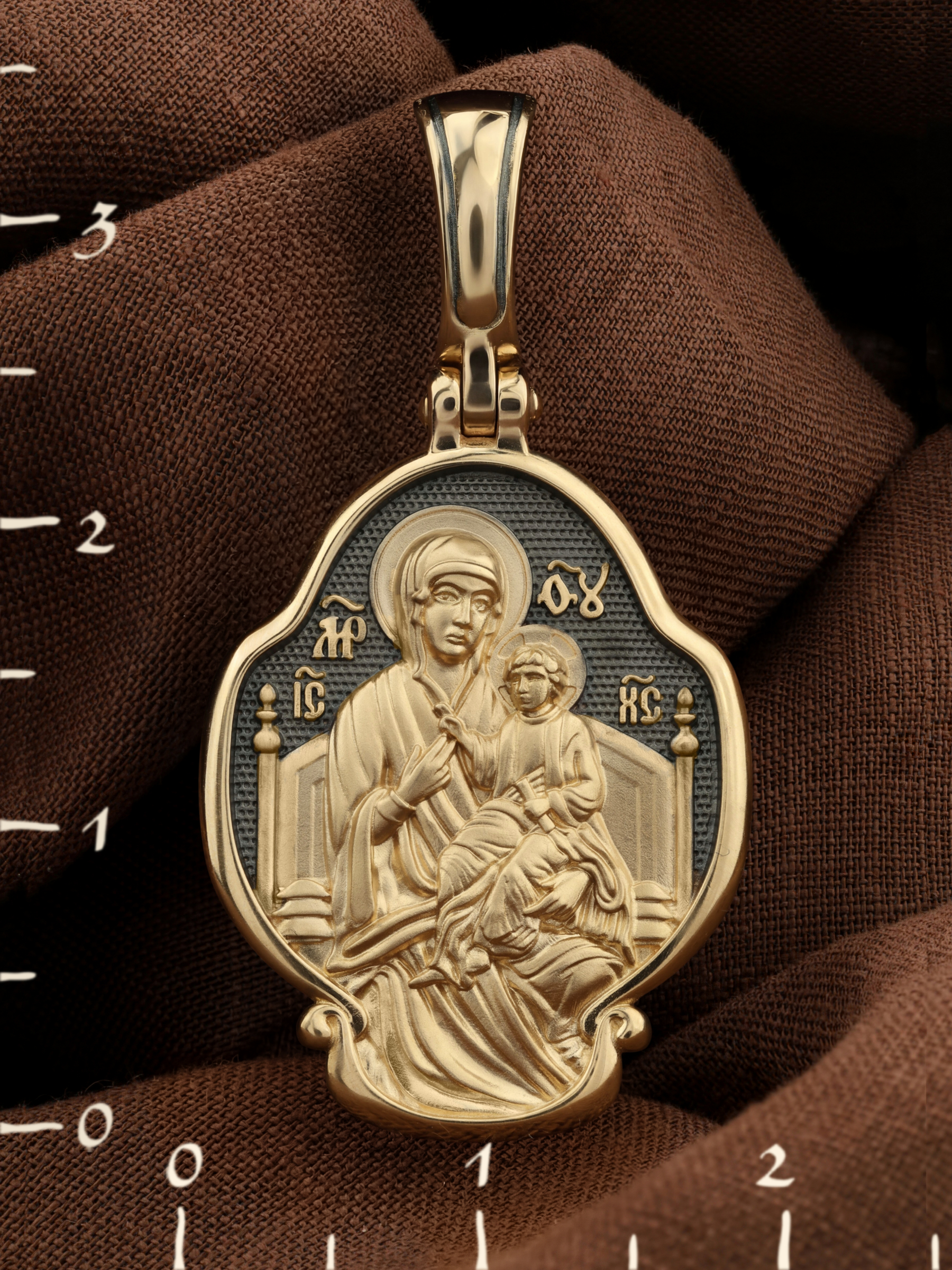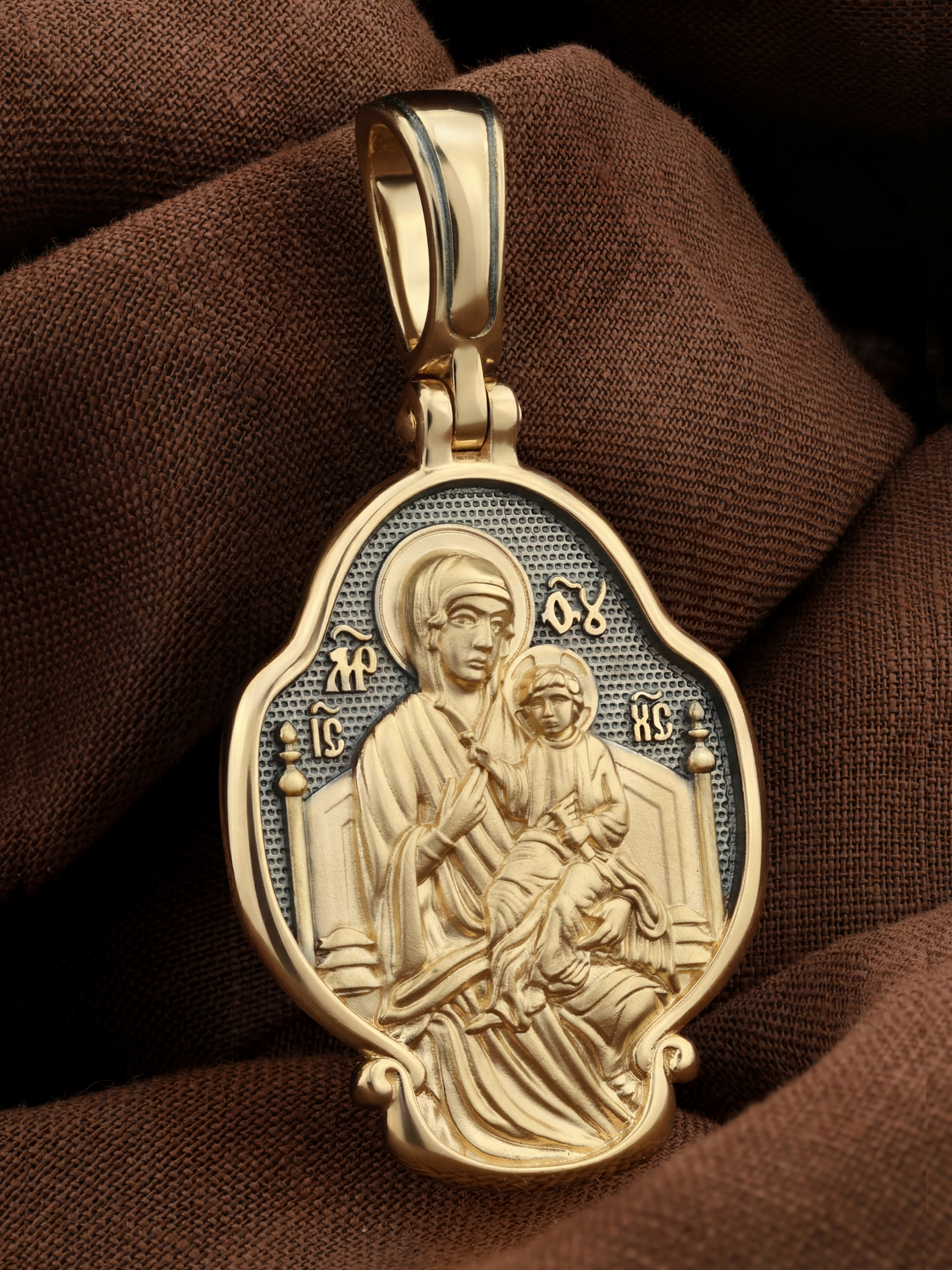 В центр образка помещен образ Божией Матери «Всецарица», восседающая на царском троне. На руках Ее — Богомладенец Иисус Христос со свитком в левой руке. Пальцы Его правой руки сложены в благословляющем жесте.