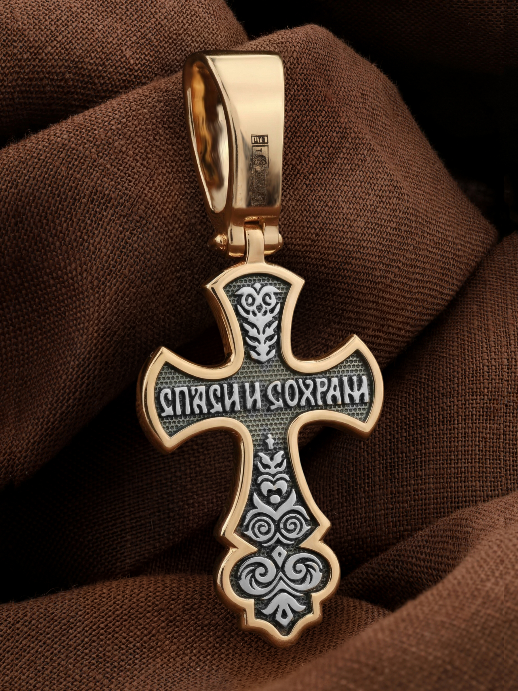 На лицевой стороне креста изображено Распятие, потому что это орудие казни Иисус Христос сделал орудием победы над грехом и смертью. Своими страданиями Он искупил грехи человечества, умерев и сошествовав во ад, победил сатану, освободил души праведников от вечной смерти и открыл им небесные врата рая. Жертва Христа сделала возможным спасение для каждого человека. На православном кресте Христос не умирает, а свободно простирает руки, ладони Иисуса открыты, будто он хочет обнять все человечество, даря им свою любовь и открывая путь к вечной жизни. Над титлом видим буквы «Ц» «С» — Царь Славы. Верхняя перекладина символизирует собой табличку с надписью «IHЦI» — Иисус Назарянин Царь Иудейский. По бокам поперечной перекладины сокращенно написано святое имя Христа «IС ХС». Буквы «Г» и «А» обозначают «Голова Адама». Возвышение, на котором стоит Крест, символизирует гору Голгофу, на которой произошло Распятие. У подножия Креста изображают прах Адама, обозначенный черепом.