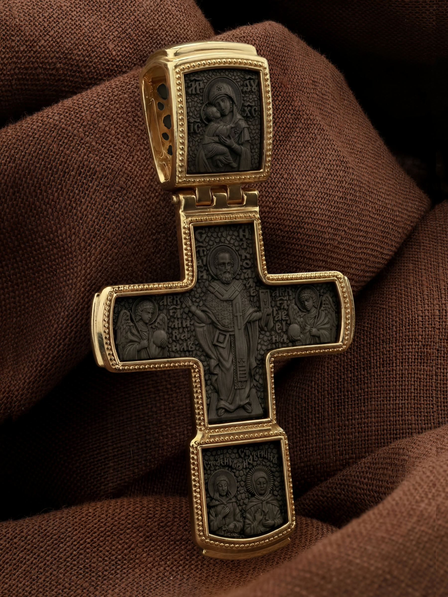 В центре на обороте — самый почитаемый в Православной Церкви святой, Николай Чудотворец, которого еще называют Николай Угодник за то, что он угодил своей жизнью Богу. Ему молятся, отправляясь в путешествие, особенно по морю, просят исцеления в различных недугах, помощи в торговых делах, учебе и поисках достойного супруга. С двух сторон от Николая Чудотворца помещены образы архангелов Михаила и Гавриила. Вверху — Владимирская икона Божией Матери — самая великая русская святыня, многие века бывшая олицетворением нашей земли. Перед ней венчались на царство государи, избирались патриархи. Пречистой Богородице Владимирской клялись в верности Отечеству солдаты и за нее умирали на поле брани. Именно на ее защиту более всего уповала Россия в самые страшные периоды своей истории. В нижнем клейме — иконы двух святых помощниц от всех недугов, блаженных Ксении Петербургской и Матроны Московской.