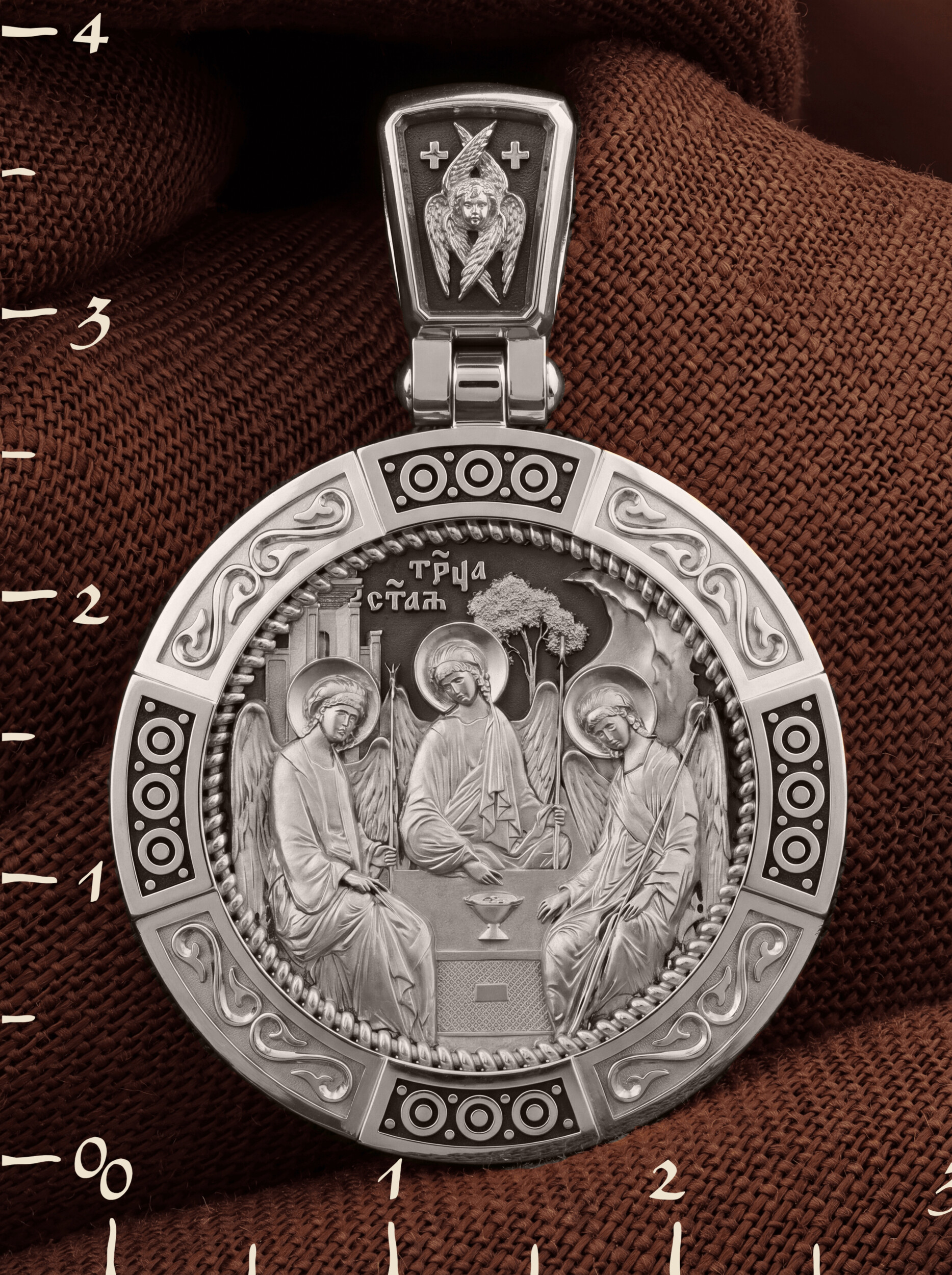 На лицевой стороне изображена икона Святой Троицы. Это образ Триединого Бога явившегося в виде трех Ангелов праотцу Аврааму. Ангелы сидят за трапезным столом вокруг чаши, которая символизирует грядущую жертву Второго Лица Пресвятой Троицы, Бога Сына.