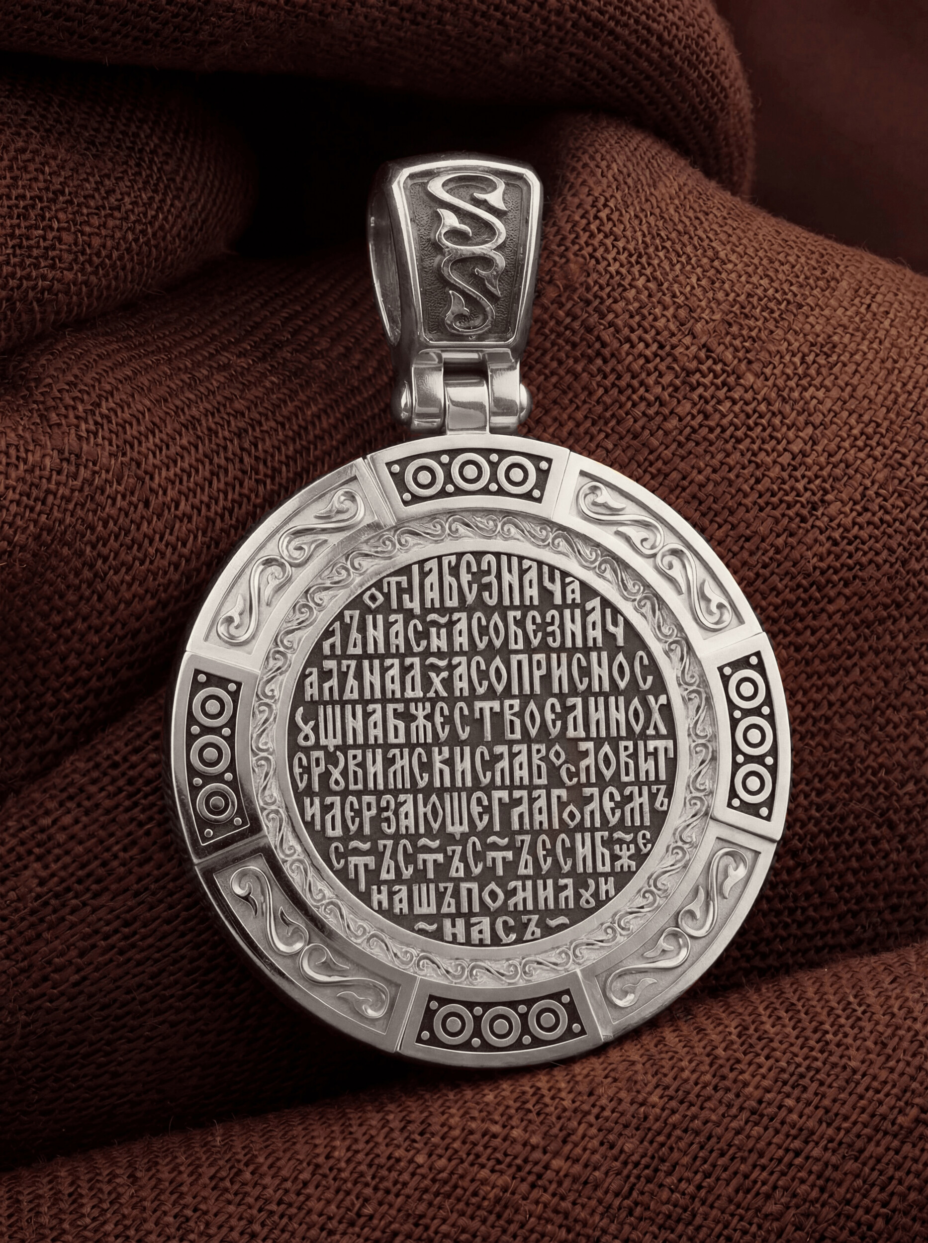 На обороте образка написана молитва: «Отца безначальна, Сына собезначальна, Духа соприсносущна, Божество едино, херувимски славословити дерзающе глаголем: свят, свят, свят еси Боже наш, помилуй нас».