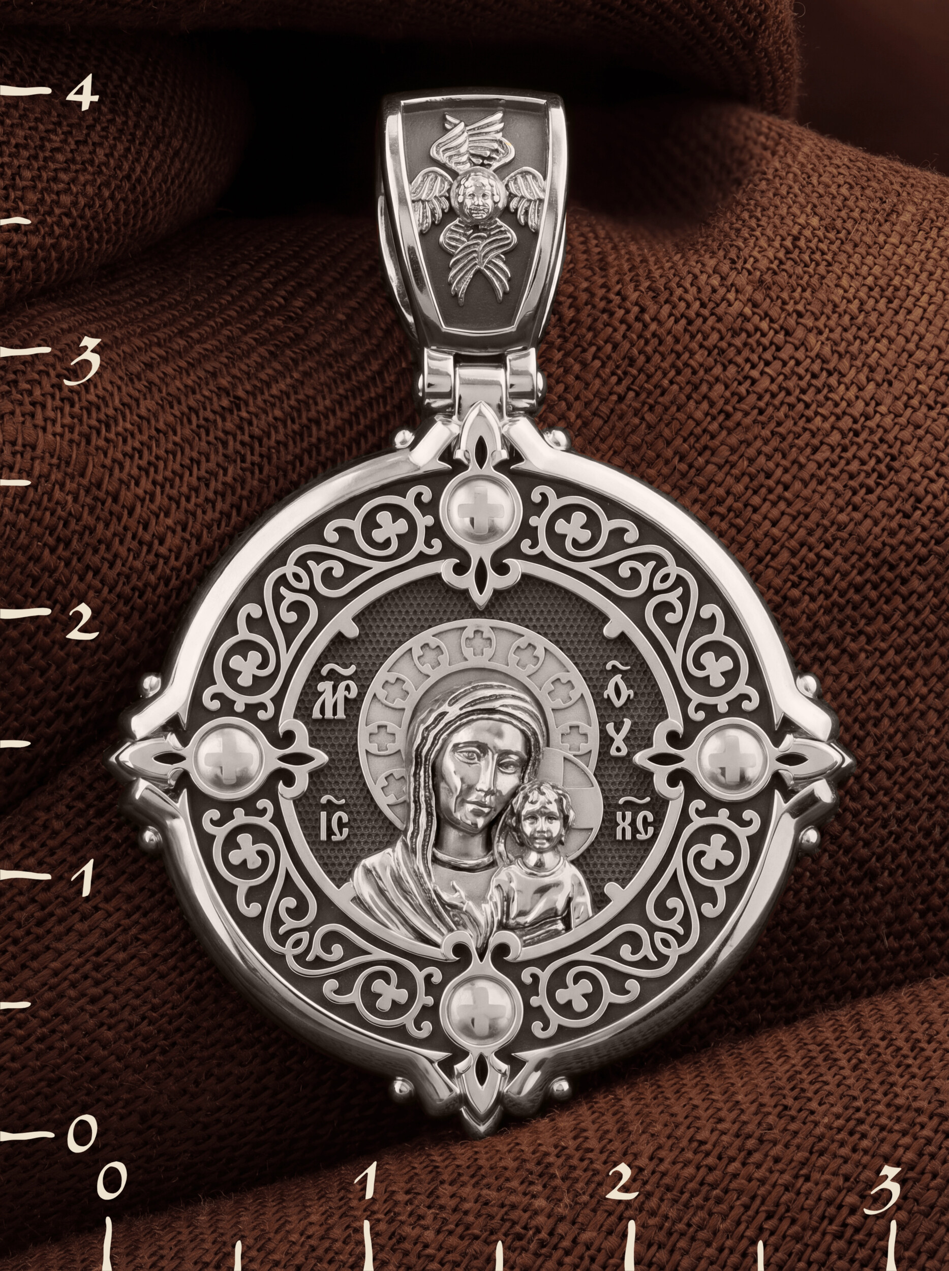 На обороте написана молитва к Богородице: «От всех бед рабы Твоя сохраняй, Благословенная Богородица!». На кулонном кольце изображен Спас Нерукотворный — Символ вочеловечившегося Божества и шестикрылый Серафим — самый приближенный к Господу Ангел.