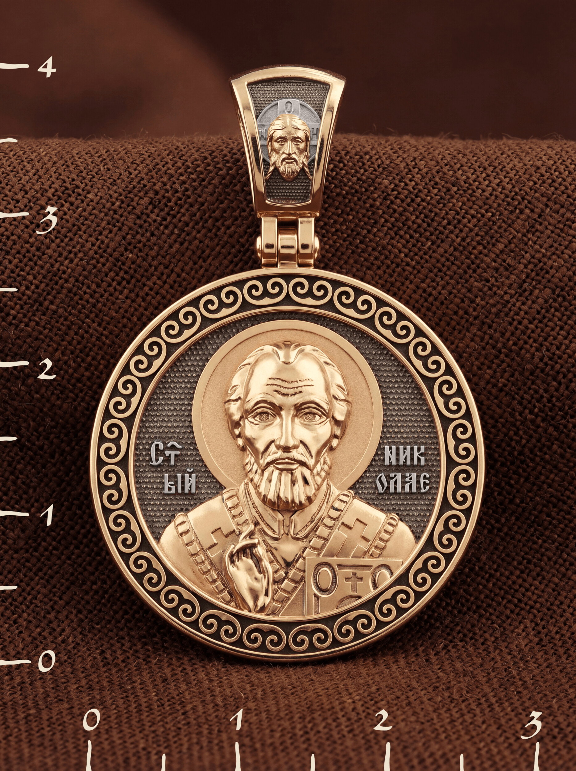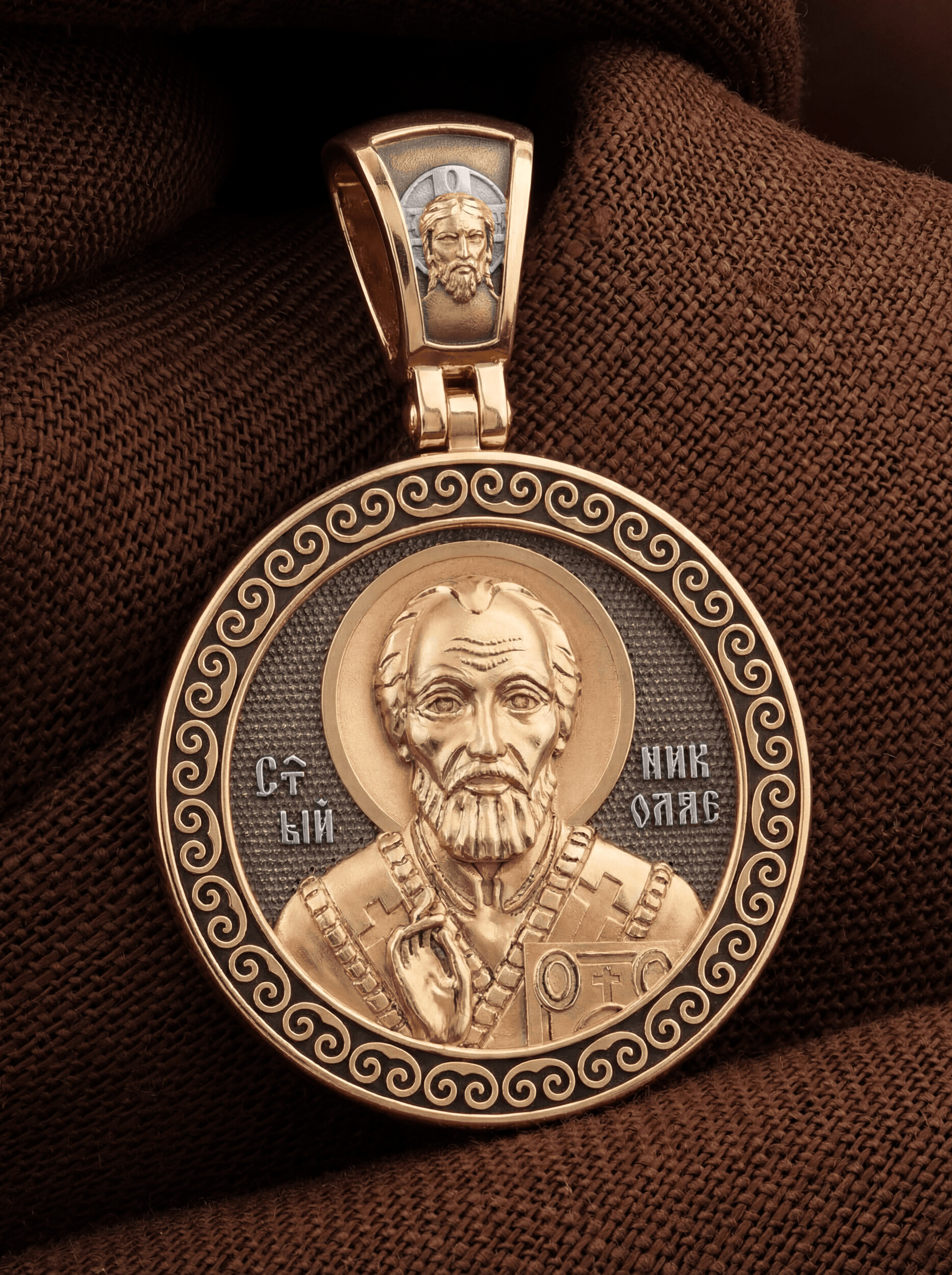 Лицевую сторону возглавляет икона Святителя Николая Чудотворца. Живший в III веке епископ Ликийского города Миры — самый почитаемый святой не только в России, но и во всем мире. Николай Чудотворец, помощник в делах, покровитель учащихся, утешитель обиженных и нуждающихся, целитель самых страшных и тяжелых недугов, предстатель и молитвенник за людей перед Богом. Также Святитель Николай Чудотворец известен своими молитвами за путешественников, когда непрестанный ветер и бушующие волны утихают и корабль заходит в спокойную гавань.