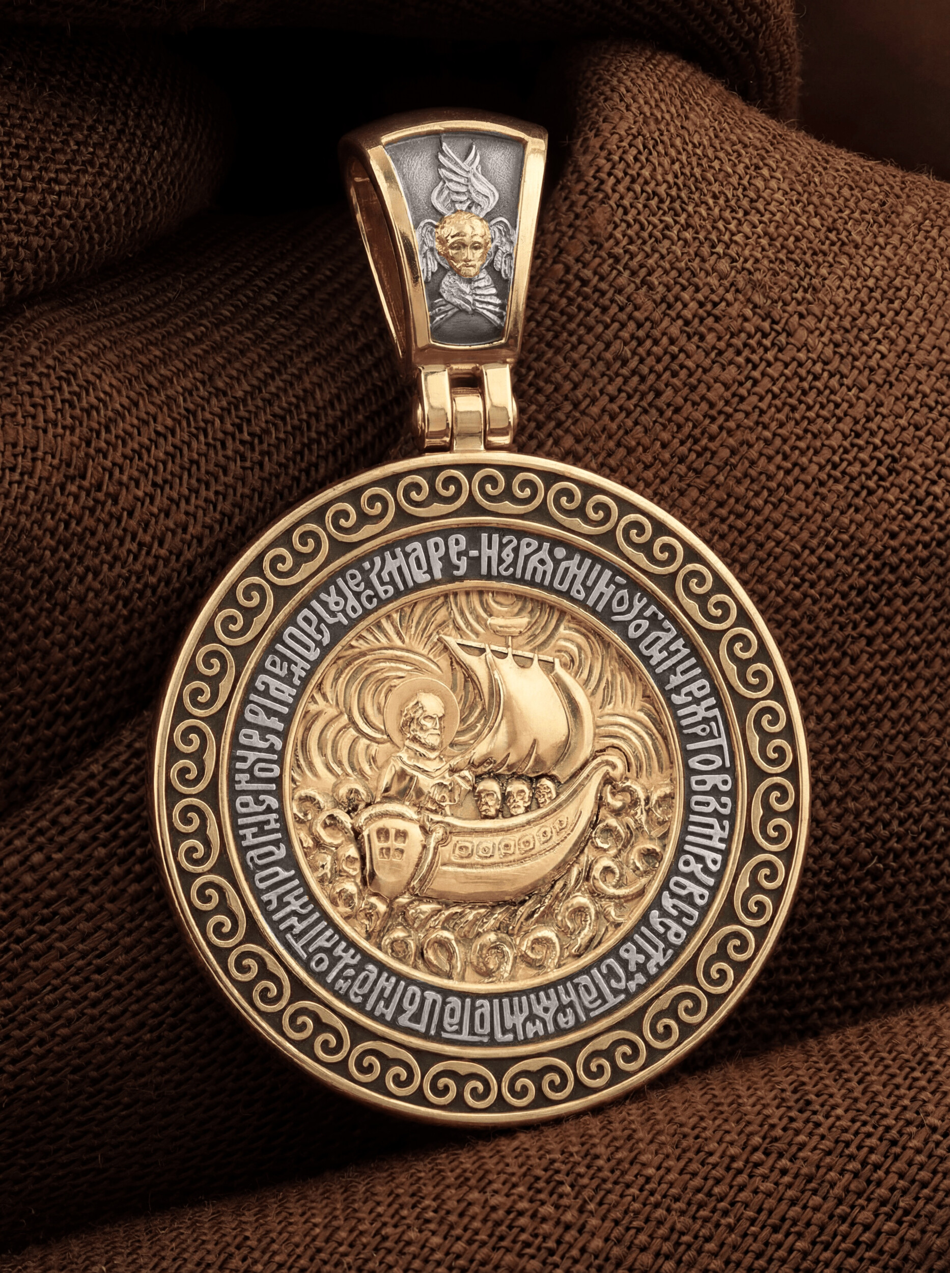 На кулонном кольце изображен Спас Нерукотворный — Символ вочеловечившегося Божества и шестикрылый Серафим — самый приближенный к Господу Ангел.