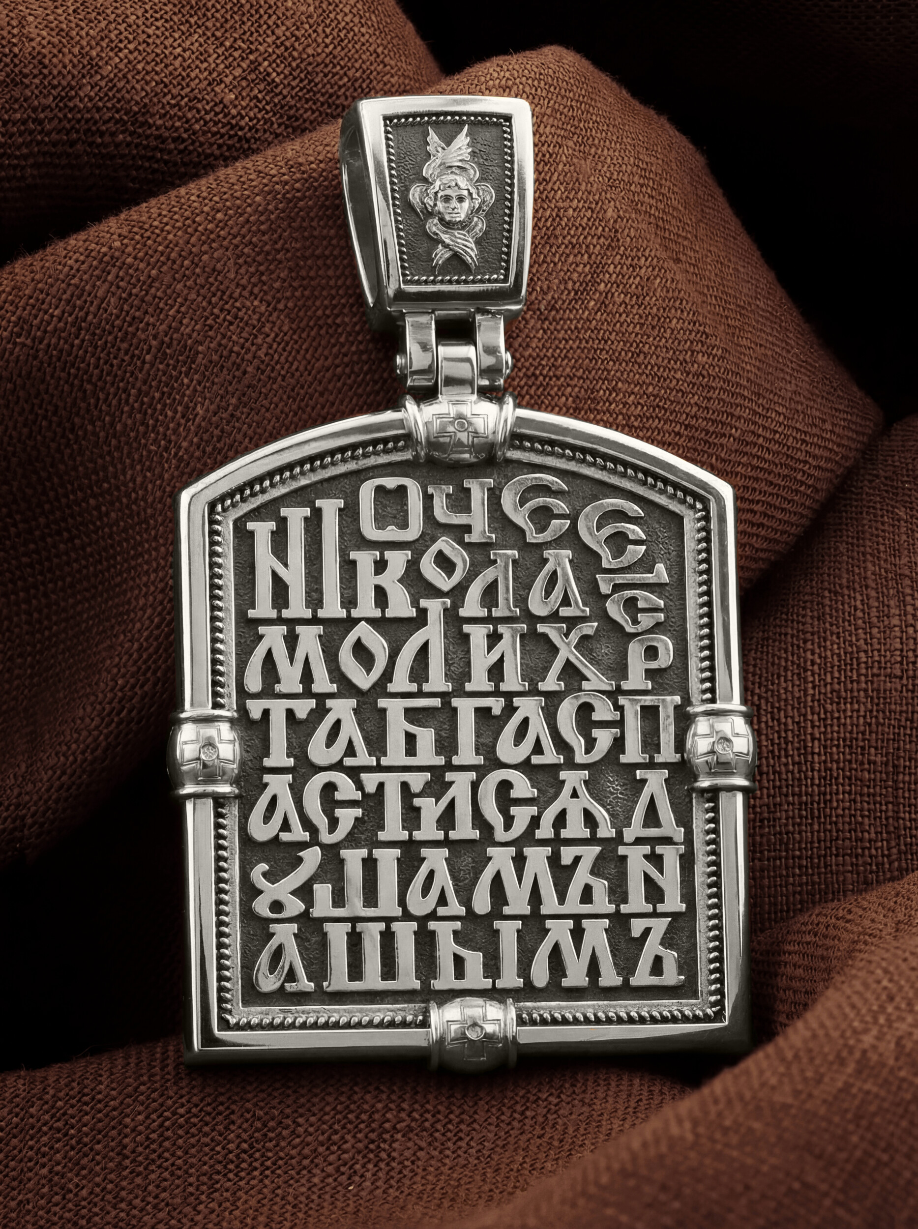На обороте образка написана молитва: «Отче Николае, моли Христа Бога, спастися душам нашим». На кулонном кольце изображен шестикрылый Серафим — самый приближенный к Господу Ангел.