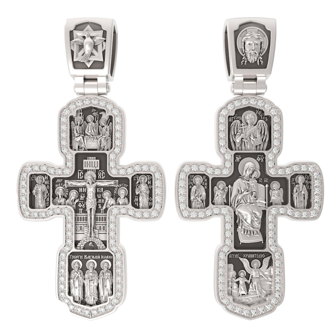 В центральной части оборота креста изображена «Владимирская икона Божией Матери». По преданию, она была написана на доске трапезного стола из дома Иисуса Христа. На Русь икона была привезена в начале XII века и с тех пор почитается как главная святыня нашего Отечества. По бокам изображены прп. Сергий Радонежский и святитель Спиридон Тримифунтский. Сверху и снизу иконы помещены изображения Ангела-Хранителя.