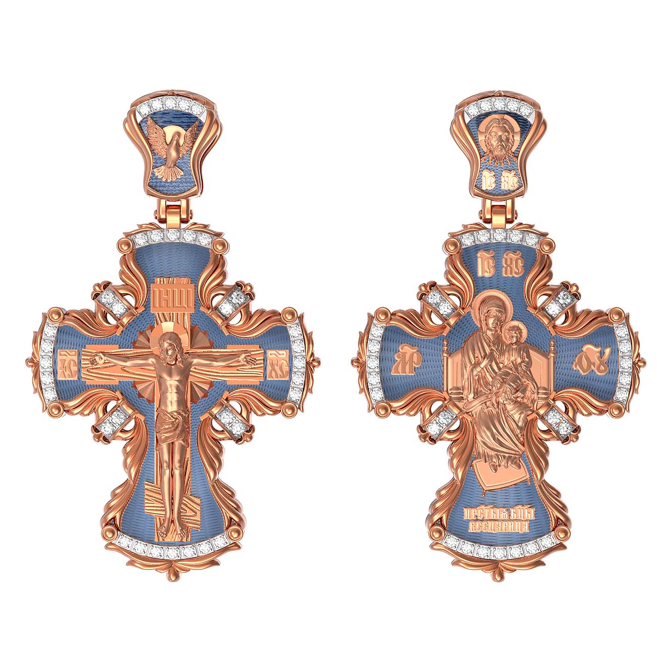 На лицевой стороне креста изображено Распятие Господа и Спасителя нашего Иисуса Христа, отдавшего Себя на смерть, чтобы другие могли жить — жить вечной жизнью, жить с Богом. Своею кровью Господь освятил крест и сделал его проводником Своей благодати, источником освящения верующих. На верхней табличке, выше головы Иисуса, расположена надпись, составленная Понтием Пилатом — «ИНЦИ». Она означает «Иисус Назорей, Царь Иудейский». Надпись «IС ХС» означает Иисус Христос помещается на разных сторонах поперечной (большой) перекладины креста. На кулонном кольце помещено изображение Духа Святого в виде голубя, сходящего с Небес.