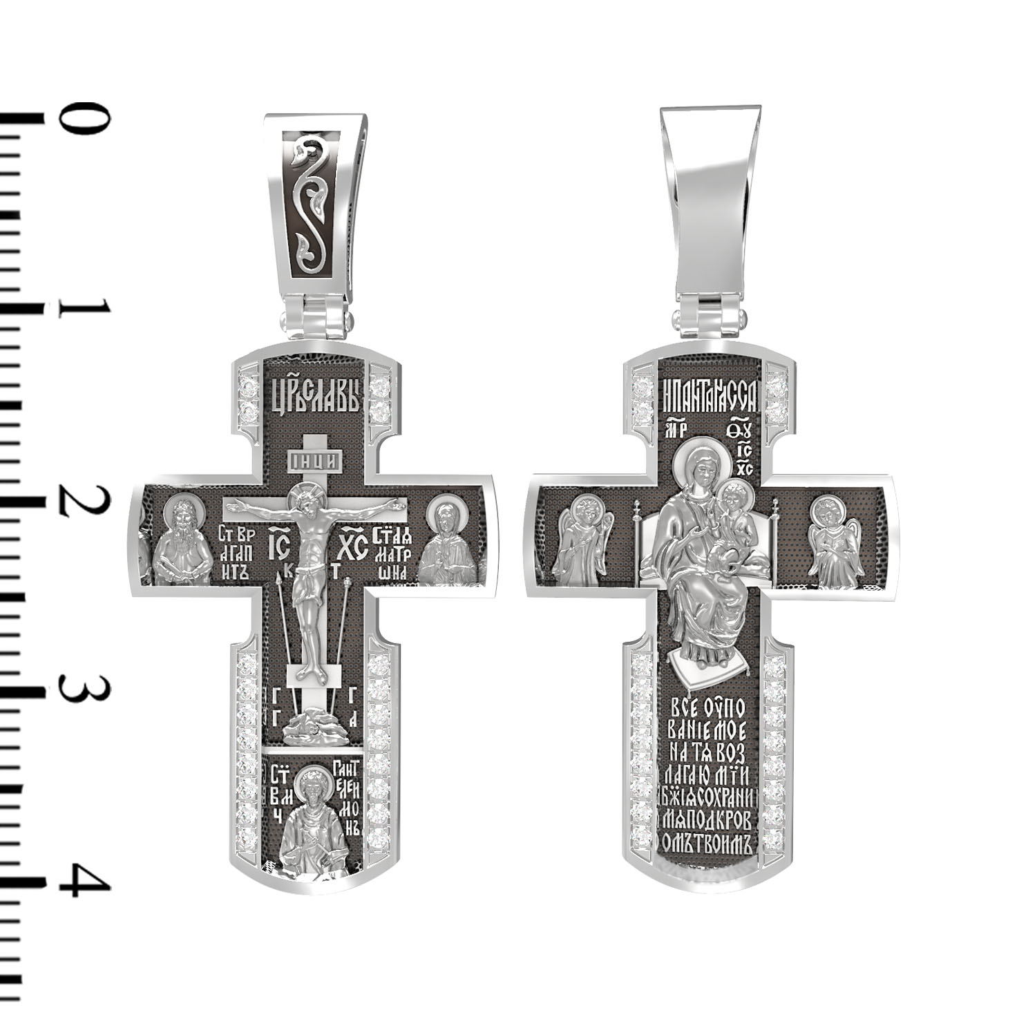 Внизу креста написана молитва обращенная к Божией Матери «Все упование мое на Тя возлагаю, Мати Божия, сохрани мя под кровом Твоим».