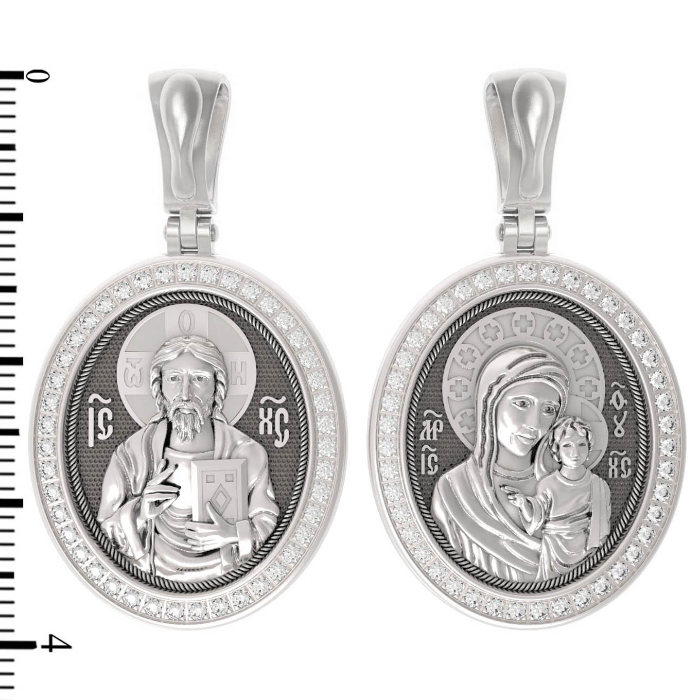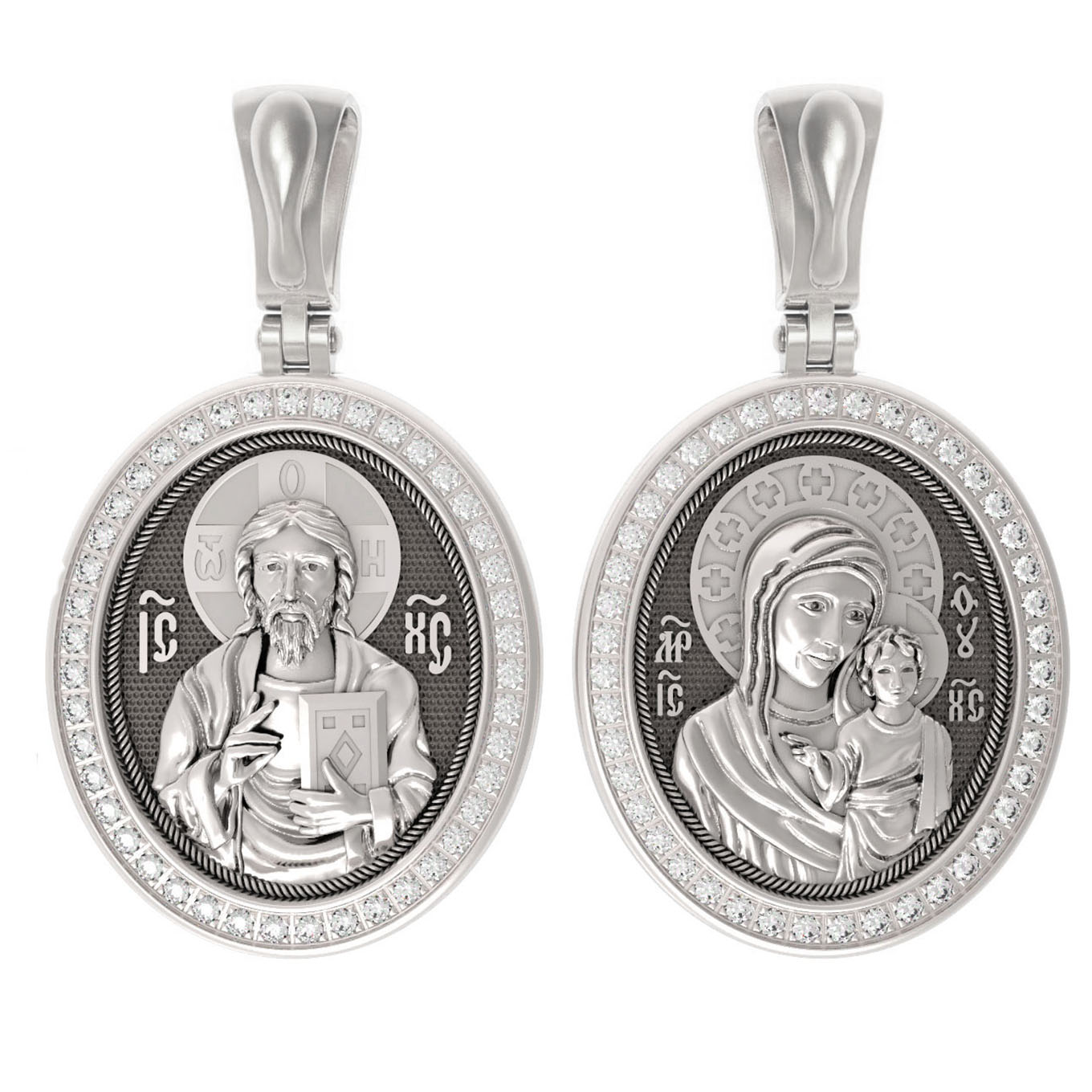На лицевой части образка изображен Спас Вседержитель или Пантократор (от греч. всевластный, всесильный) — центральный образ в иконографии Христа, представляющий Его как Небесного Царя и Судию. Господь правой рукой благословляет, а в левой держит Книгу Жизни, в которой для каждого человека есть своя страница.