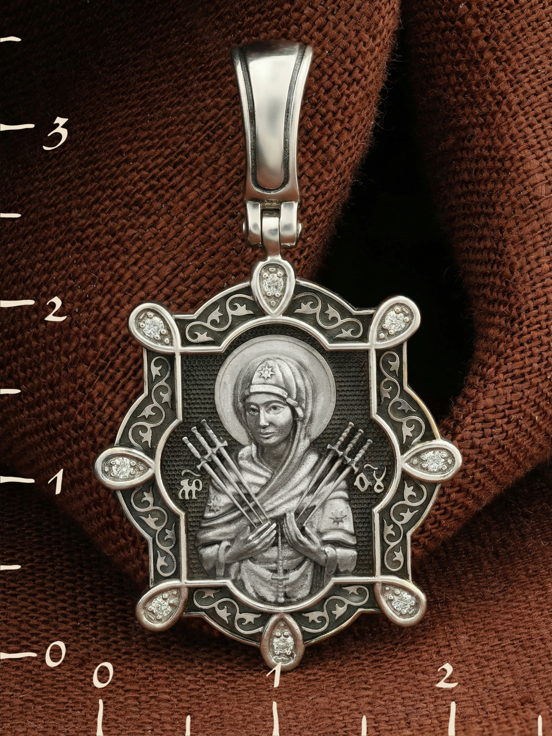 На лицевой стороне образка изображена икона Пресвятой Богородицы «Семистрельная» — одна из самых чудотворных икон на Руси. На протяжении многих веков христиане взывали к Царице Небесной через эту икону, если в стране начинались войны или мятежи.