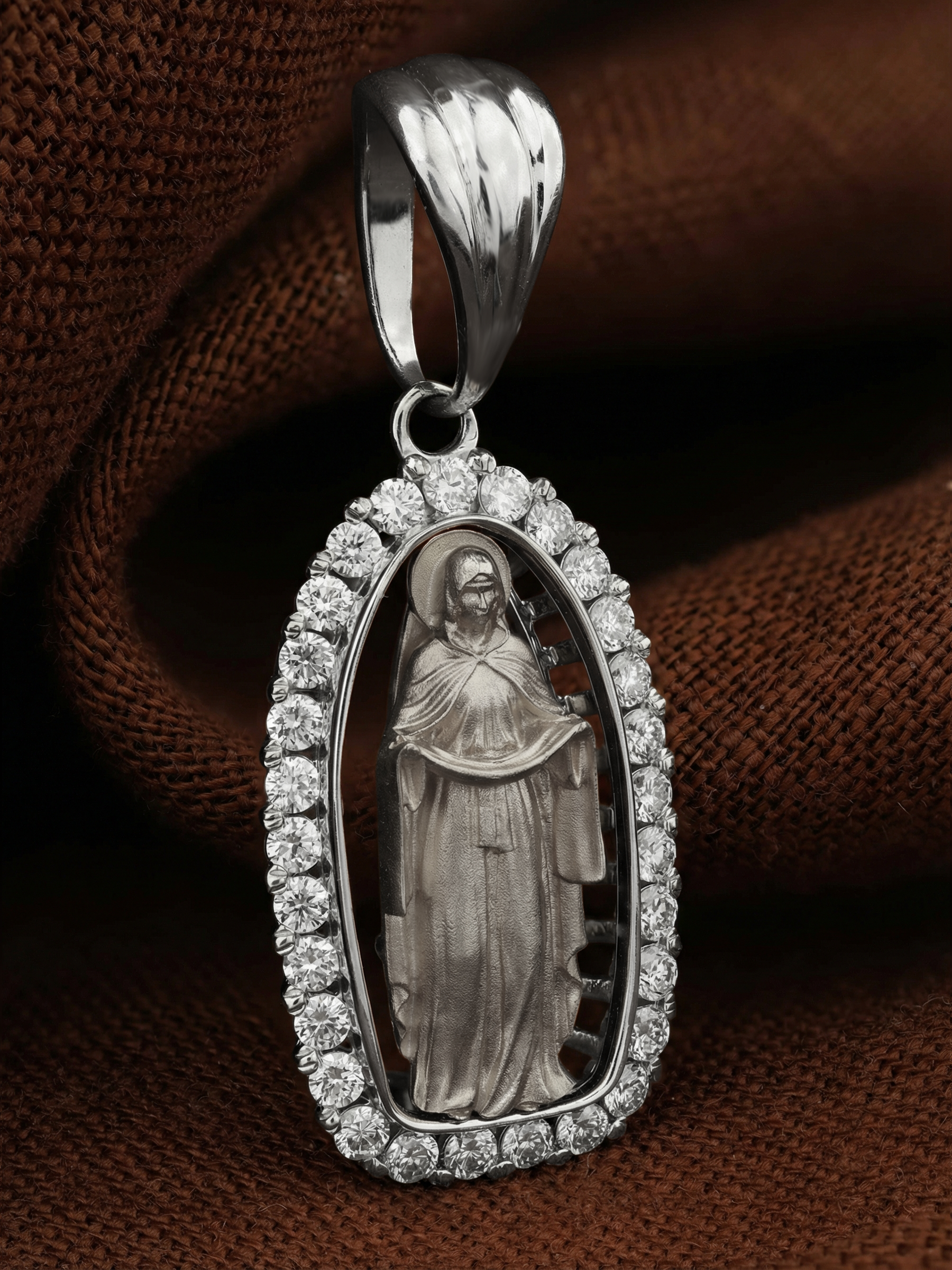 На лицевой части образка изображена икона Покров Пресвятой Богородицы. Праздник Покрова Божией Матери является воспоминанием чуда, которое произошло во Влахнернской церкви 1 (14) октября 910 года: Пресвятая Богородица явилась верующим над алтарем храма и распростерла над ними Свое покрывало. В этот день Божья Матерь открыла людям, что Она является Ходатаицей за них перед Богом. Богородица простирает Свой молитвенный покров над всеми православными христианами и умоляет Сына Своего о даровании вечного спасения каждому человеку.