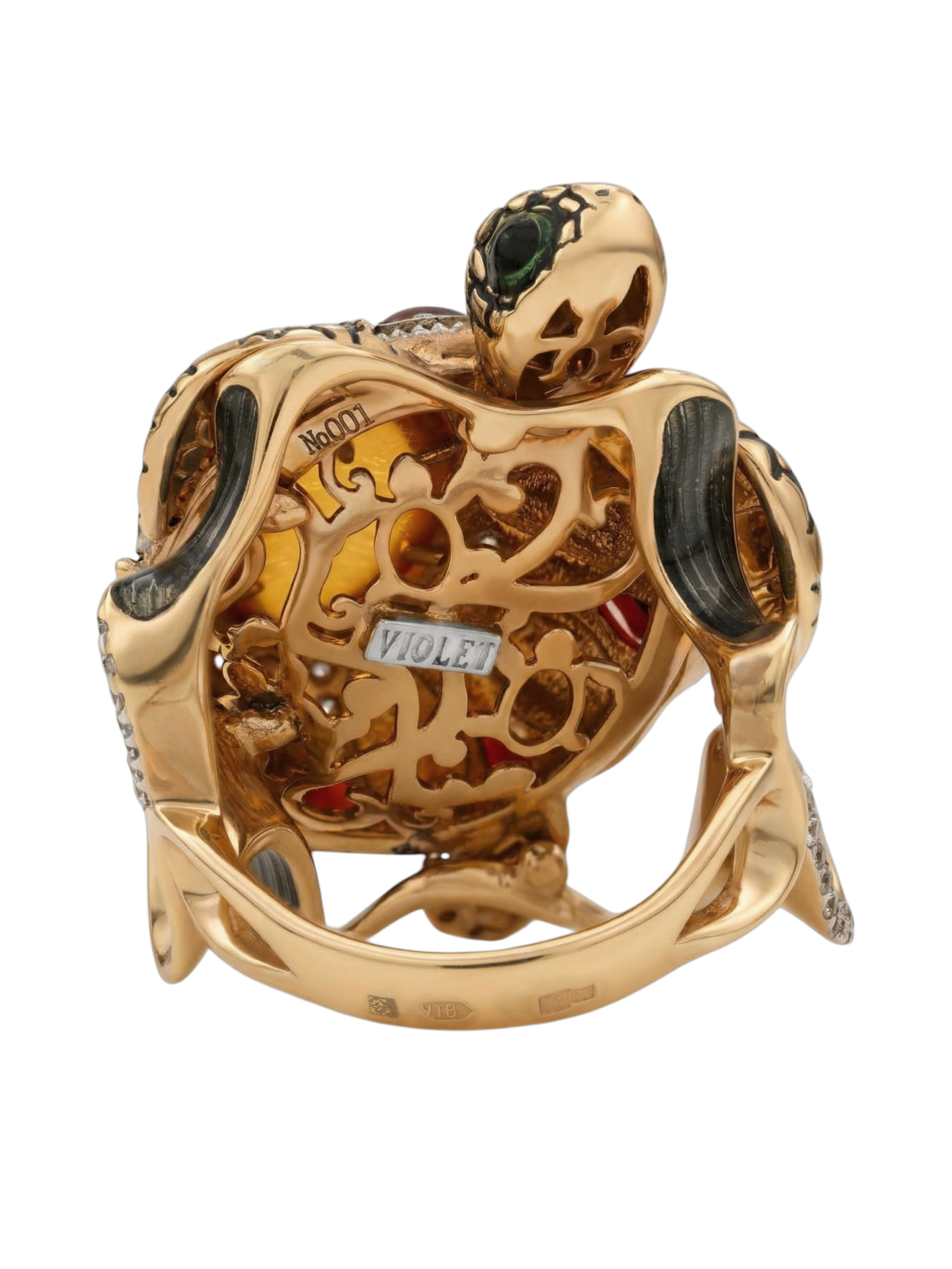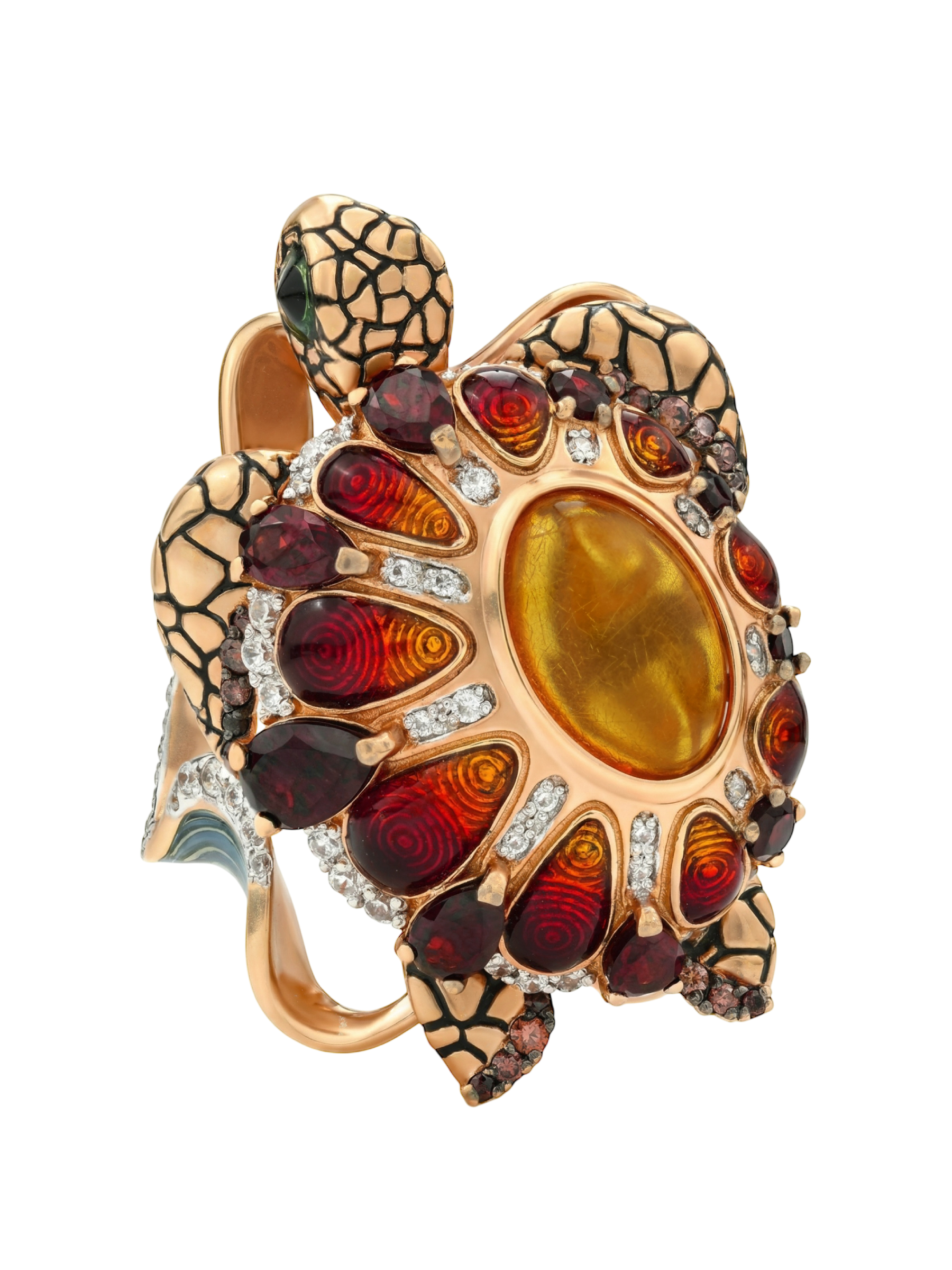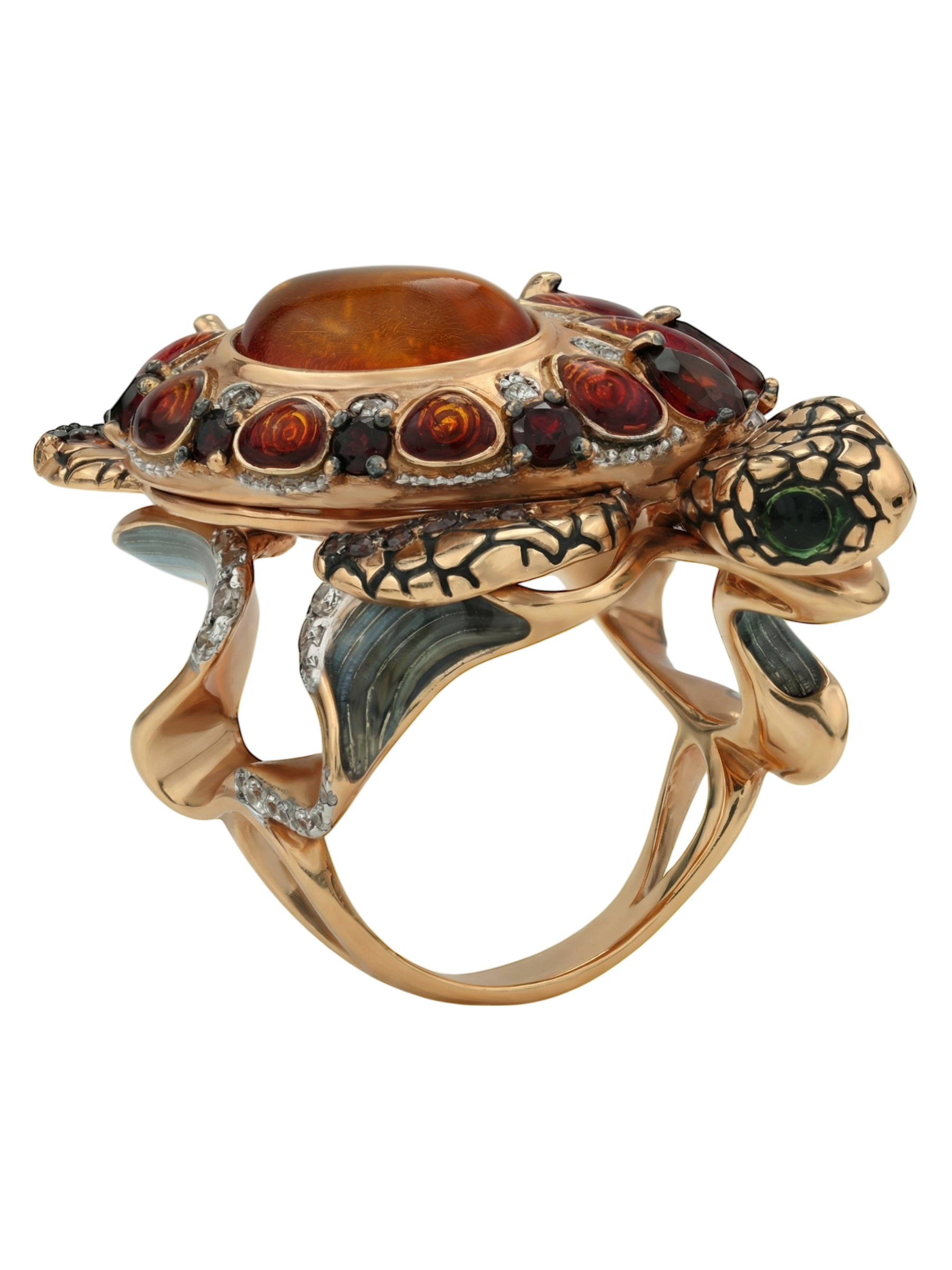 Кольцо из золота c эмалью, фианитом, гранатом и янтарём