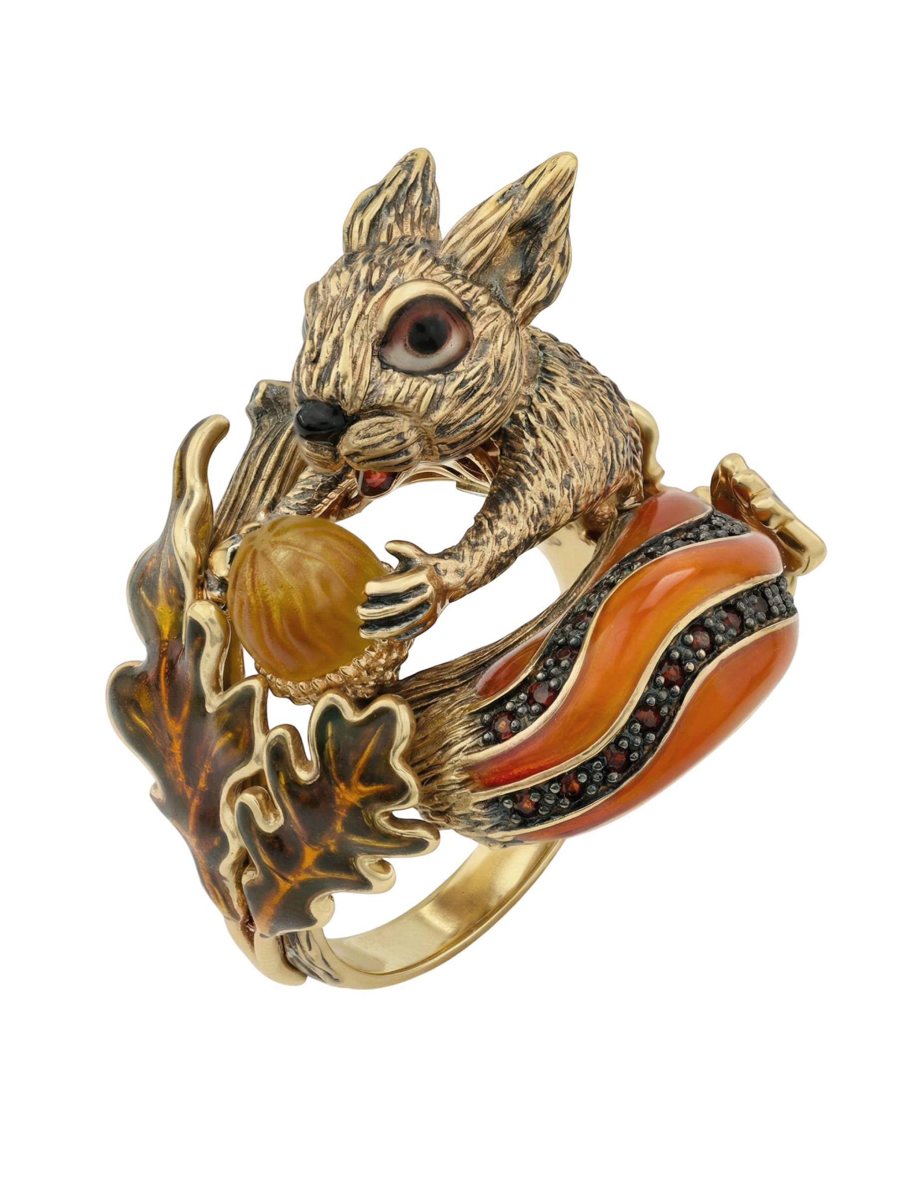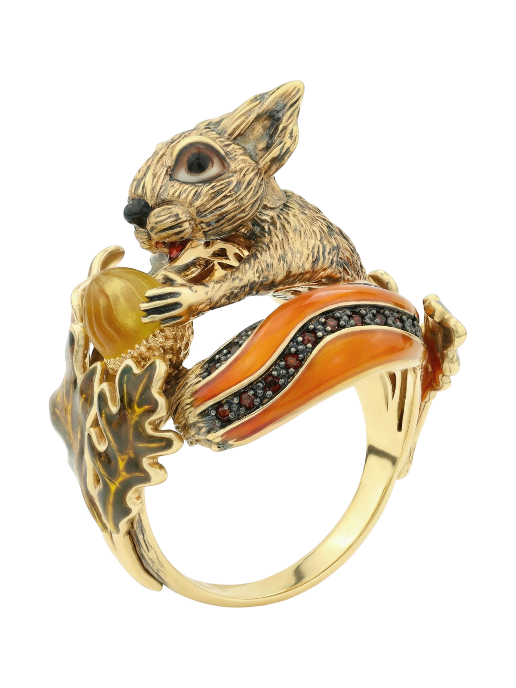 Кольцо из лимонного золота c эмаль, гранатом и янтарём