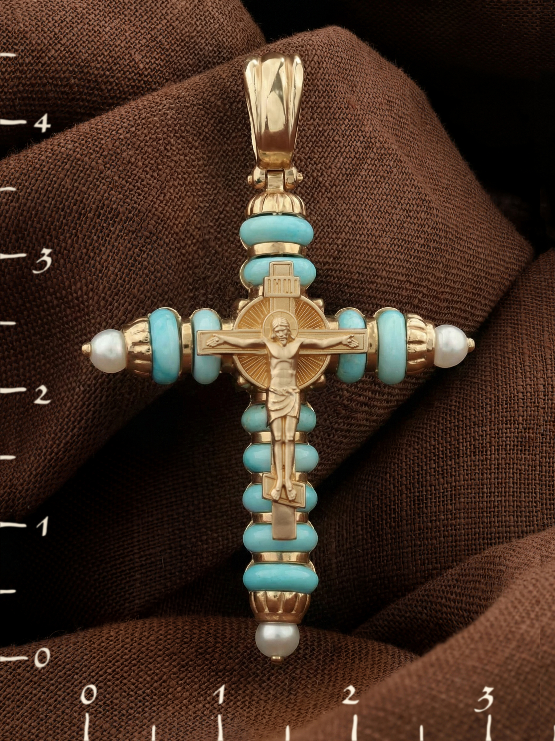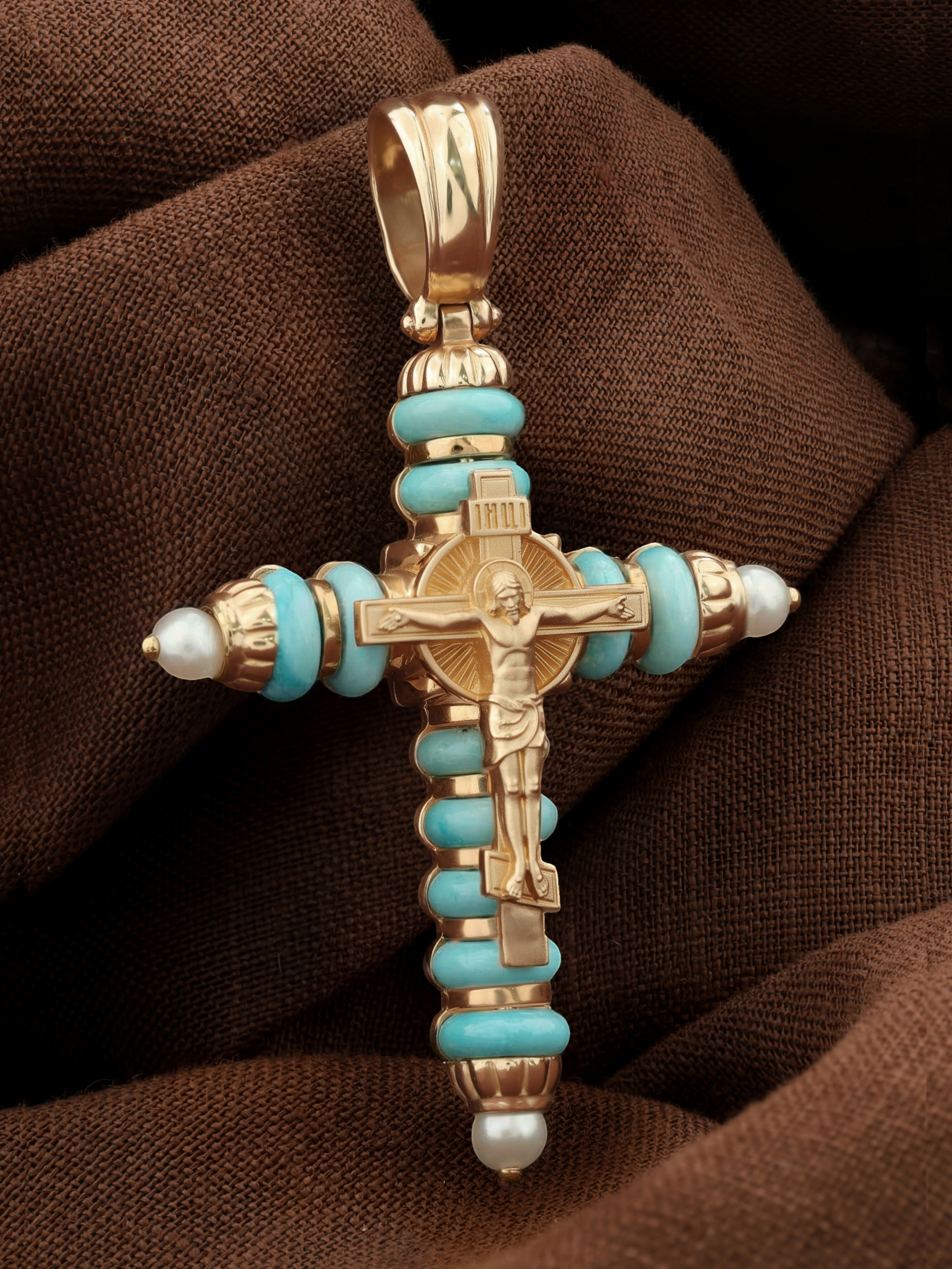 Крест из золота c жемчугом и бирюзой