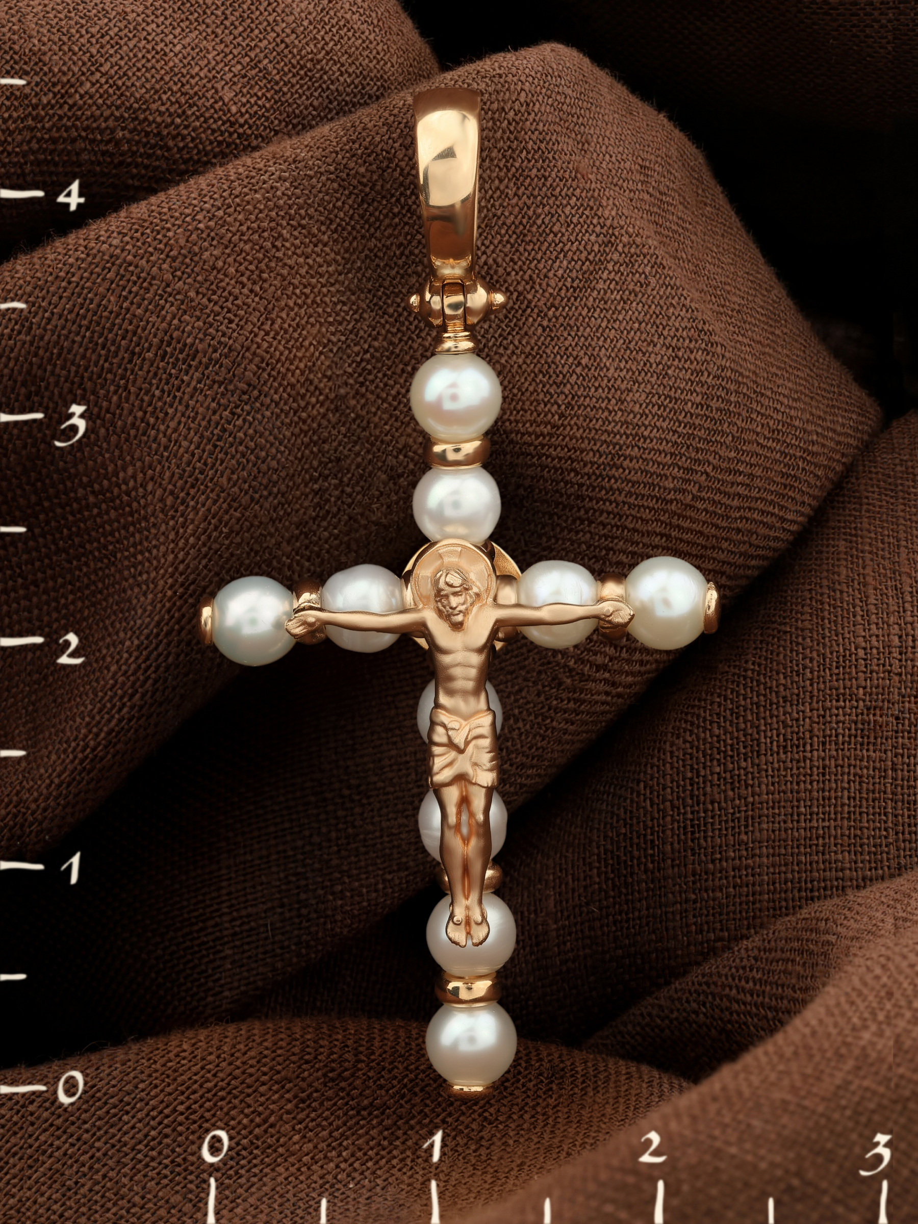 На лицевой стороне креста изображено Распятие Господа и Спасителя нашего Иисуса Христа. Своими крестными страданиями Господь смыл наши грехи, покрыл наш долг перед Богом или, на языке Писания, нас «искупил». В Голгофе сокрыта непостижимая тайна бесконечной правды и любви Бога. Крест стал символом победы добра над злом, жизни над смертью, напоминанием бесконечной Божьей любви, предметом радости. Воплотившийся Сын Божий Своею кровью освятил крест и сделал его проводником Своей благодати, источником освящения верующих. На верхней табличке, выше головы Иисуса, расположена надпись, составленная Понтием Пилатом — «IНЦI». Она означает «Иисус Назорей, Царь Иудейский». Надпись «IC» «ХC», означает Иисус Христос, помещаются на разных сторонах поперечной перекладины креста. Христос в Своей Божественной любви, над которой смерть не властна и которая, страдая, и не страдает в обычном смысле, простирает к людям со Креста Свои объятия, в которые призывается и привлекается весь мир. Поэтому Тело Его не висит, а торжественно покоится на Кресте.