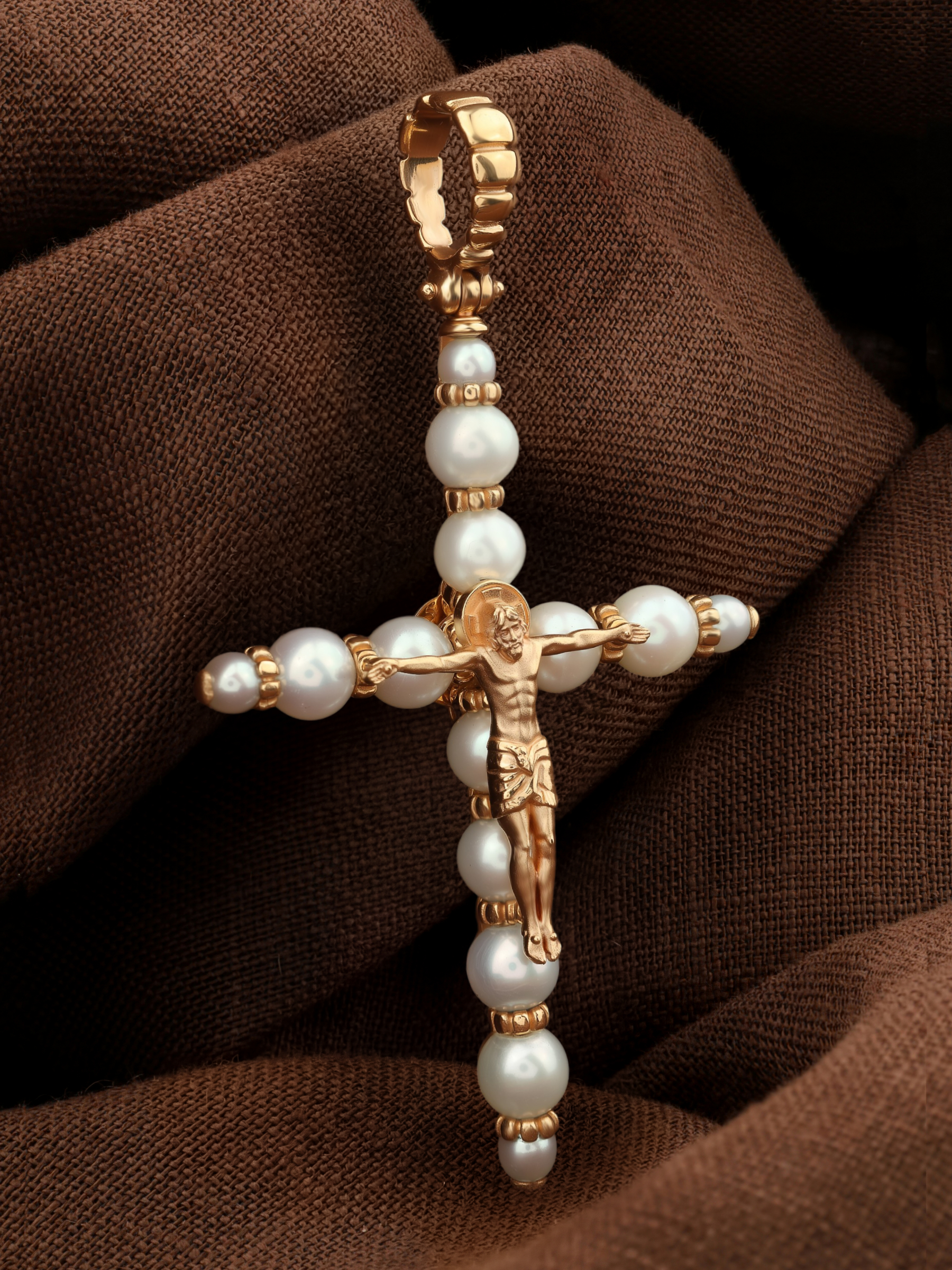 На лицевой стороне креста изображено Распятие Господа и Спасителя нашего Иисуса Христа. Своими крестными страданиями Господь смыл наши грехи, покрыл наш долг перед Богом или, на языке Писания, нас «искупил». В Голгофе сокрыта непостижимая тайна бесконечной правды и любви Бога. Крест стал символом победы добра над злом, жизни над смертью, напоминанием бесконечной Божьей любви, предметом радости. Воплотившийся Сын Божий Своею кровью освятил крест и сделал его проводником Своей благодати, источником освящения верующих. На верхней табличке, выше головы Иисуса, расположена надпись, составленная Понтием Пилатом — «IНЦI». Она означает «Иисус Назорей, Царь Иудейский». Надпись «IC» «ХC», означает Иисус Христос, помещаются на разных сторонах поперечной перекладины креста. Христос в Своей Божественной любви, над которой смерть не властна и которая, страдая, и не страдает в обычном смысле, простирает к людям со Креста Свои объятия, в которые призывается и привлекается весь мир. Поэтому Тело Его не висит, а торжественно покоится на Кресте.