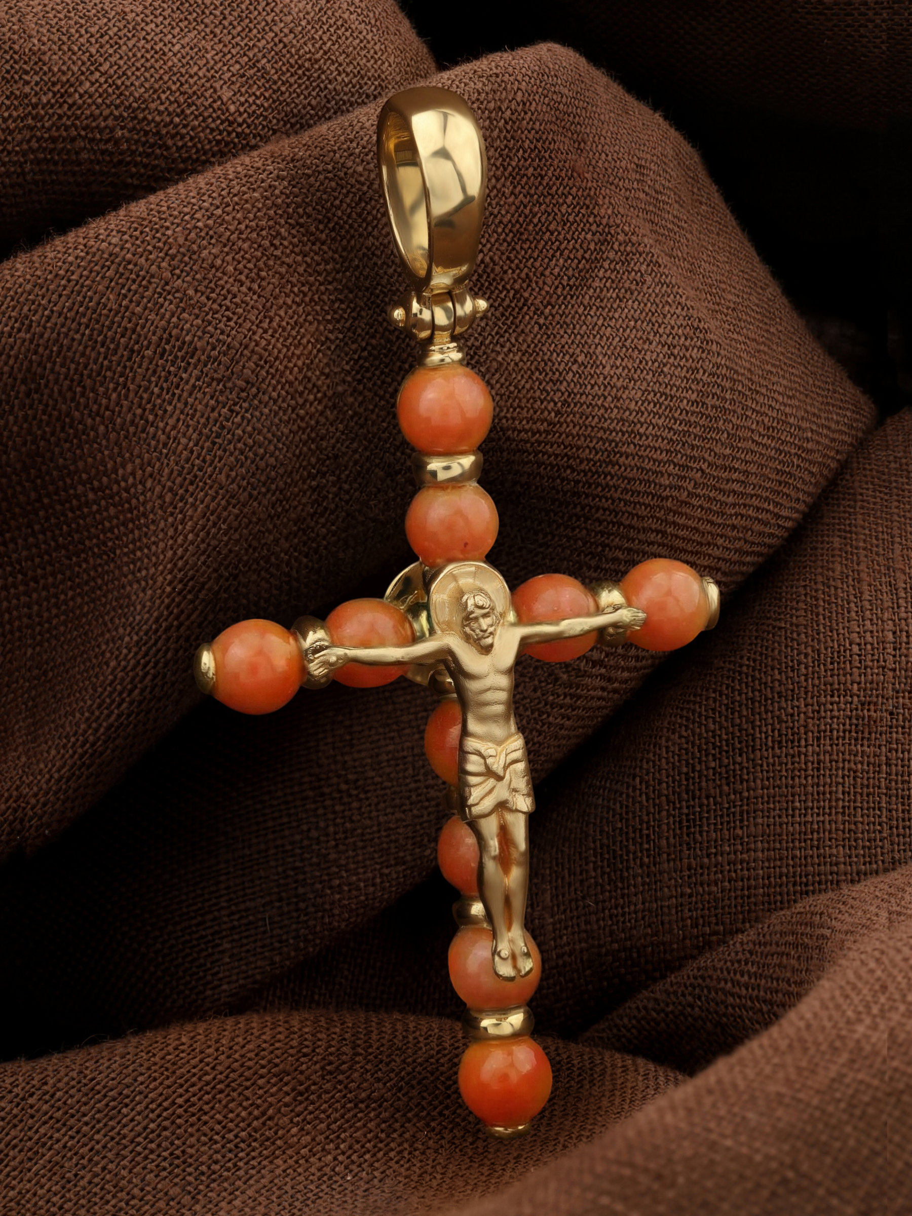 На лицевой стороне креста изображено Распятие Господа и Спасителя нашего Иисуса Христа. Своими крестными страданиями Господь смыл наши грехи, покрыл наш долг перед Богом или, на языке Писания, нас «искупил». В Голгофе сокрыта непостижимая тайна бесконечной правды и любви Бога. Крест стал символом победы добра над злом, жизни над смертью, напоминанием бесконечной Божьей любви, предметом радости. Воплотившийся Сын Божий Своею кровью освятил крест и сделал его проводником Своей благодати, источником освящения верующих. На верхней табличке, выше головы Иисуса, расположена надпись, составленная Понтием Пилатом — «IНЦI». Она означает «Иисус Назорей, Царь Иудейский». Надпись «IC» «ХC», означает Иисус Христос, помещаются на разных сторонах поперечной перекладины креста. Христос в Своей Божественной любви, над которой смерть не властна и которая, страдая, и не страдает в обычном смысле, простирает к людям со Креста Свои объятия, в которые призывается и привлекается весь мир. Поэтому Тело Его не висит, а торжественно покоится на Кресте.