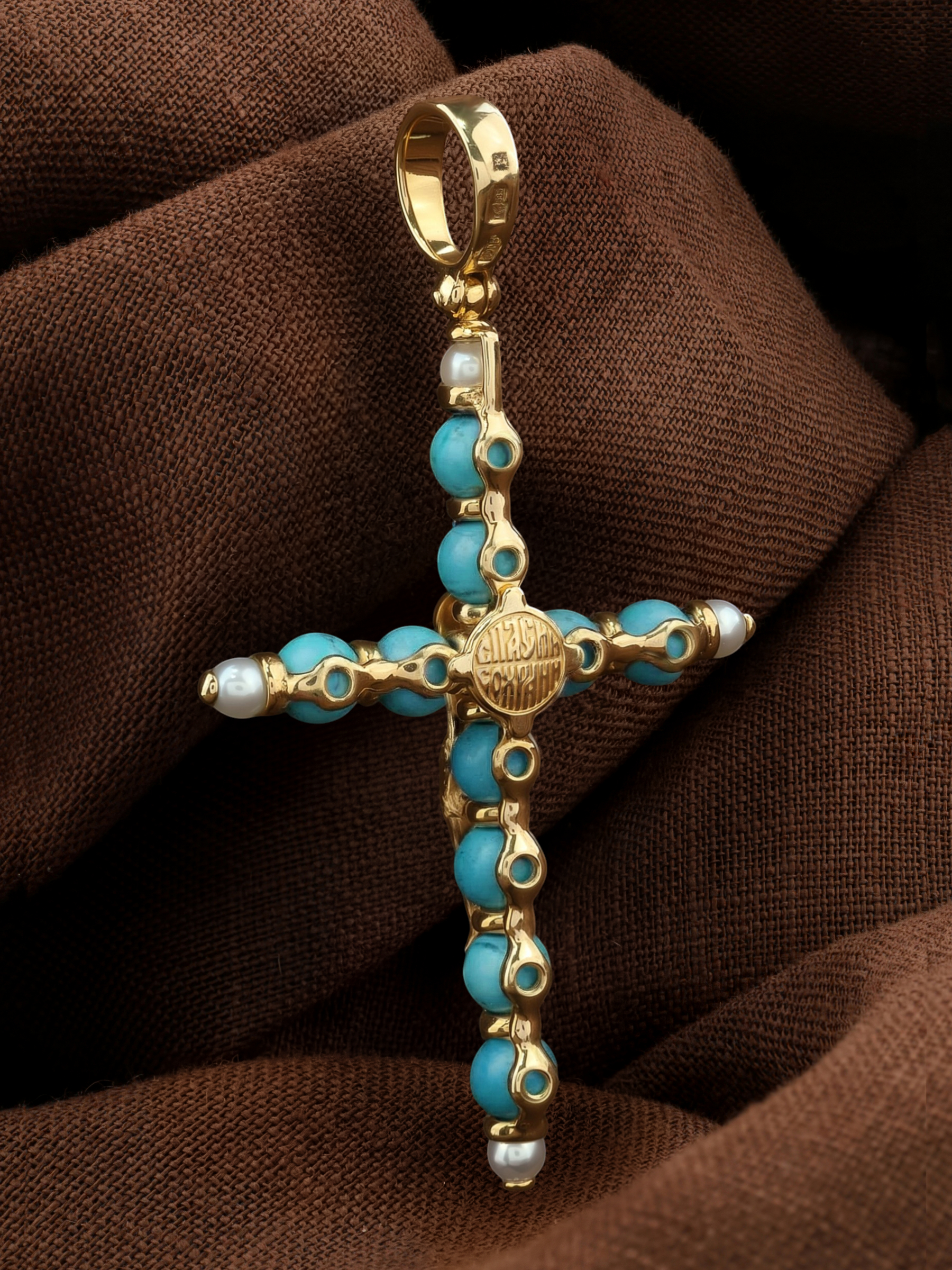 Крест из лимонного золота c жемчугом и бирюзой