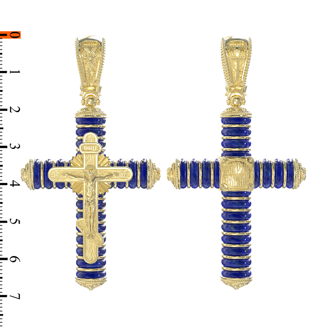 На лицевой стороне креста изображено Распятие Господа и Спасителя нашего Иисуса Христа. Своими крестными страданиями Господь смыл наши грехи, покрыл наш долг перед Богом или, на языке Писания, нас «искупил». В Голгофе сокрыта непостижимая тайна бесконечной правды и любви Бога. Крест стал символом победы добра над злом, жизни над смертью, напоминанием бесконечной Божьей любви, предметом радости. Воплотившийся Сын Божий Своею кровью освятил крест и сделал его проводником Своей благодати, источником освящения верующих. На верхней табличке, выше головы Иисуса, расположена надпись, составленная Понтием Пилатом — «IНЦI». Она означает «Иисус Назорей, Царь Иудейский». Надпись «IC» «ХC», означает Иисус Христос, помещаются на разных сторонах поперечной перекладины креста. Христос в Своей Божественной любви, над которой смерть не властна и которая, страдая, и не страдает в обычном смысле, простирает к людям со Креста Свои объятия, в которые призывается и привлекается весь мир. Поэтому Тело Его не висит, а торжественно покоится на Кресте. На кулонном кольце изображен шестикрылый Серафим. Серафим означает «Пламенный». Горя любовью к Богу, он зажигает огонь этой любви и в сердцах людей.