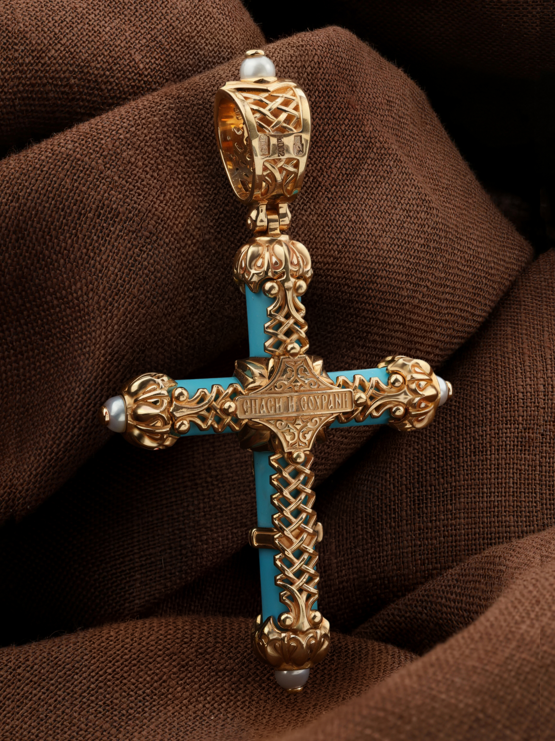 Крест из золота c жемчугом и бирюзой