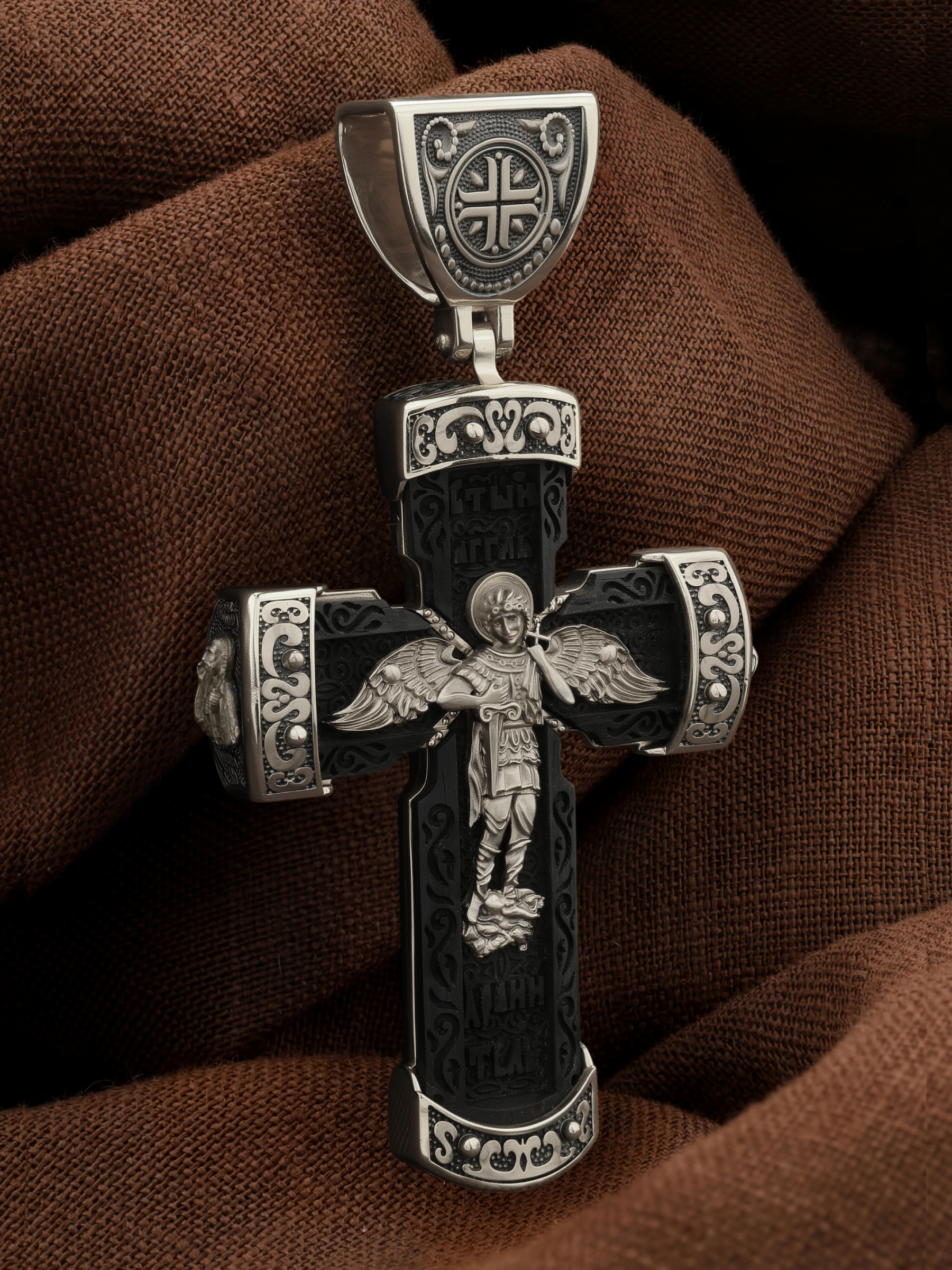 В центре оборота креста изображен Ангела Хранителя с традиционными атрибутами в руках: крестом, которым он осеняет человека, и мечом для прогнания бесов. По Православному учению, каждому, принявшему святое крещение, дается Господом Ангел Хранитель, который сопровождает человека всю его жизнь, помогая в добрых делах и охраняя от нападок злых духов. Святые отцы утверждают, что только верующий человек имеет рядом с собой Ангела Хранителя: «Тем, которые сподобились крещения и возносятся на высоту добродетелей, даны от Бога Ангелы, заботящиеся о них и содействующие им. В этом уверяет нас Господь, когда говорит, что есть Ангелы Хранители у всякого, кто верует в Него» (преп. Анастасий Синаит). Но Ангел Хранитель пребывает с христианином, если только мы не прогоним его греховными делами, поскольку «как дым разгоняет пчел, так и грех прогоняет от нас Ангела Хранителя» (свт. Василий Великий). Но и после завершения земного пути Ангел Хранитель не покидает христианина, а помогает душе преодолеть воздушные мытарства на пути в Царство Небесное.