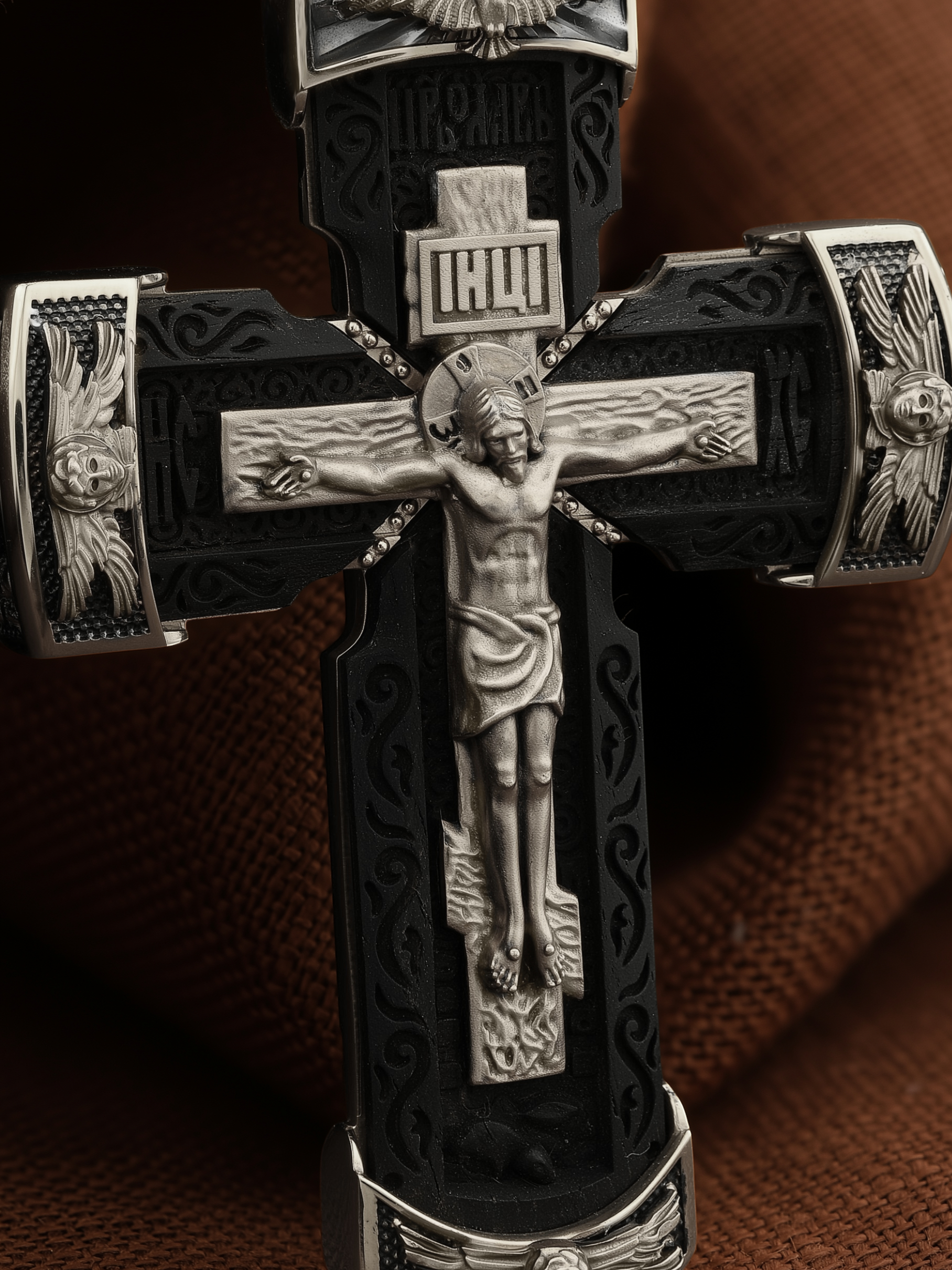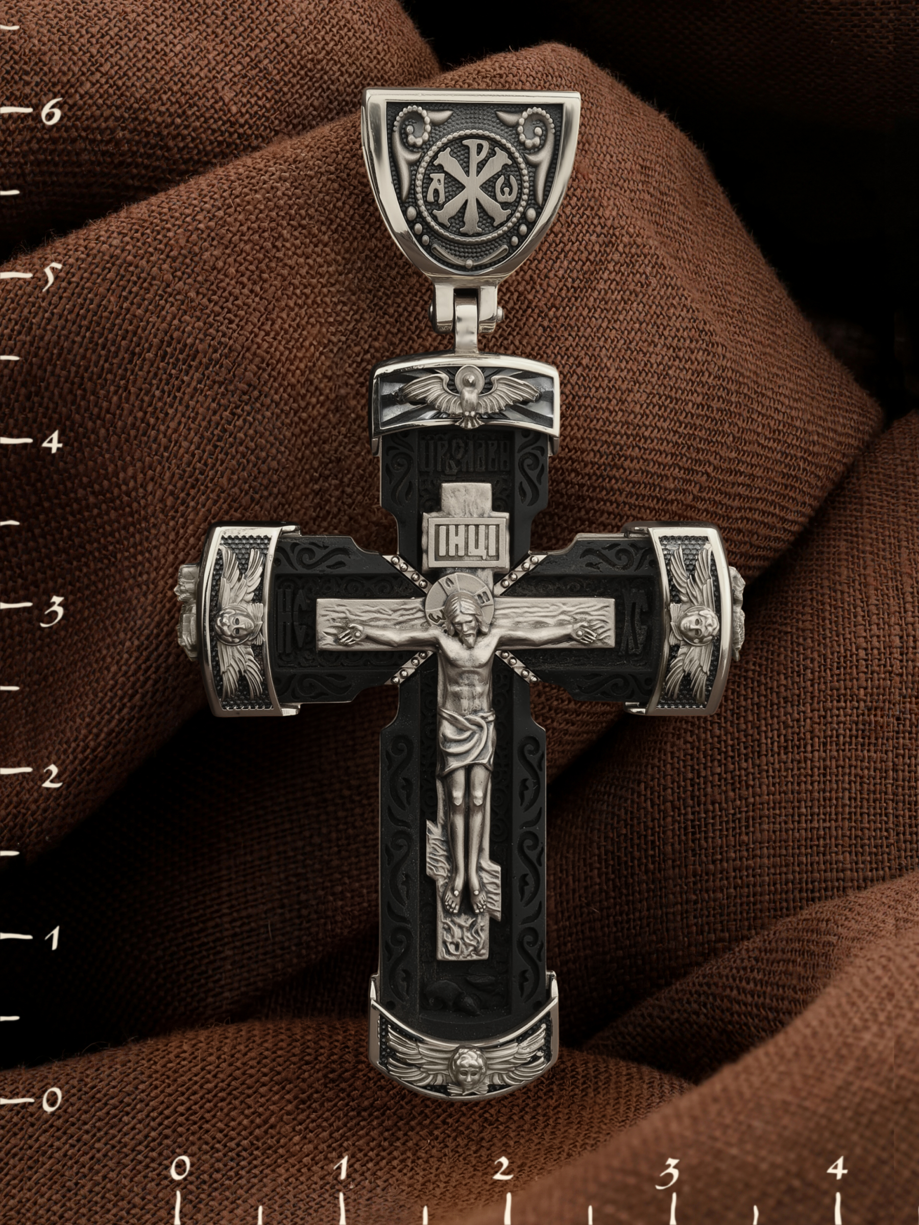 На лицевой стороне креста изображено Распятие, потому что это орудие казни Иисус Христос сделал орудием победы над грехом и смертью. Своими страданиями Он искупил грехи человечества, умерев и сошествовав во ад, победил сатану, освободил души праведников от вечной смерти и открыл им небесные врата рая. Жертва Христа сделала возможным спасение для каждого человека. На православном кресте Христос не умирает, а свободно простирает руки, ладони Иисуса открыты, будто он хочет обнять все человечество, даря им свою любовь и открывая путь к вечной жизни.