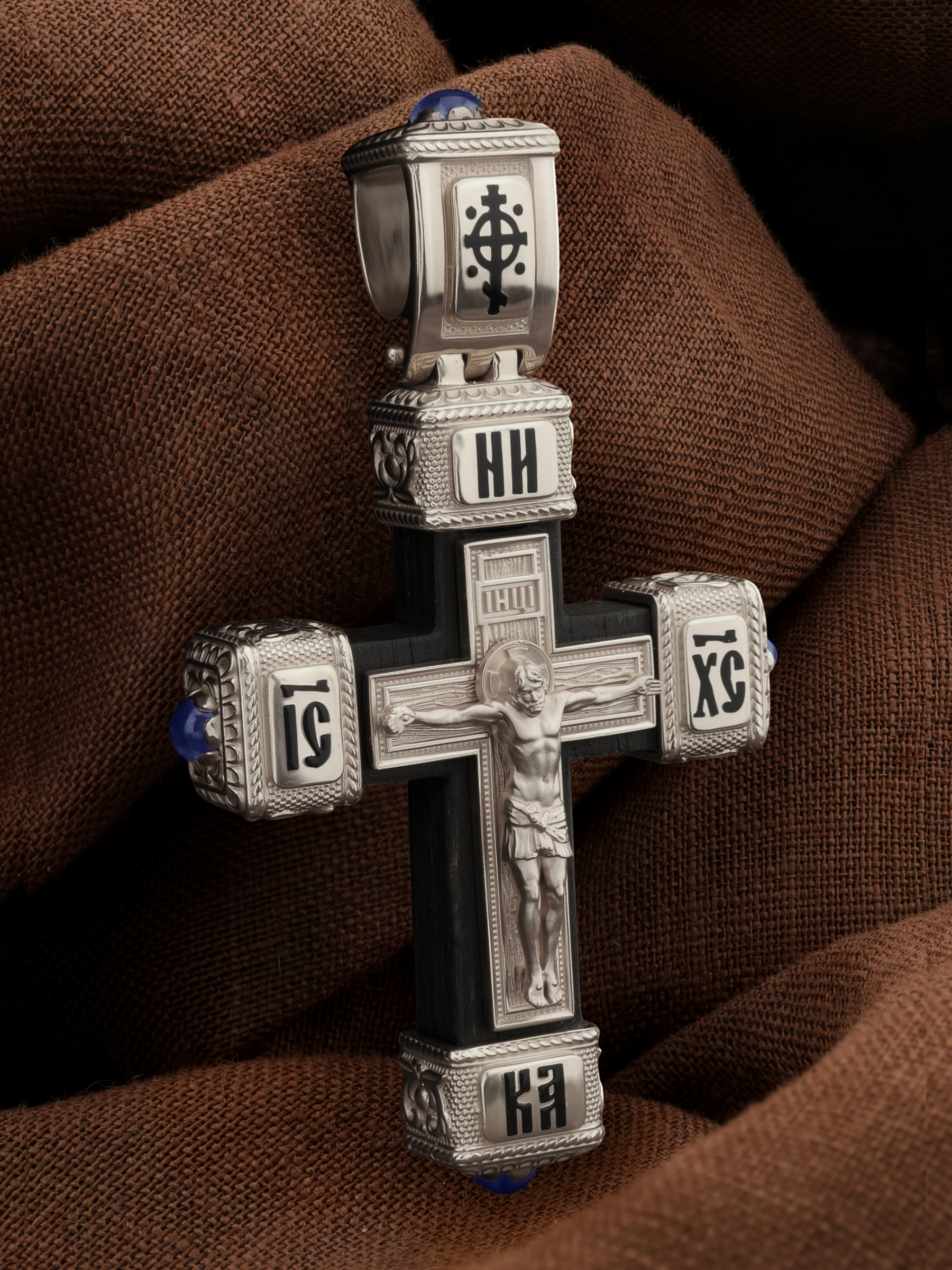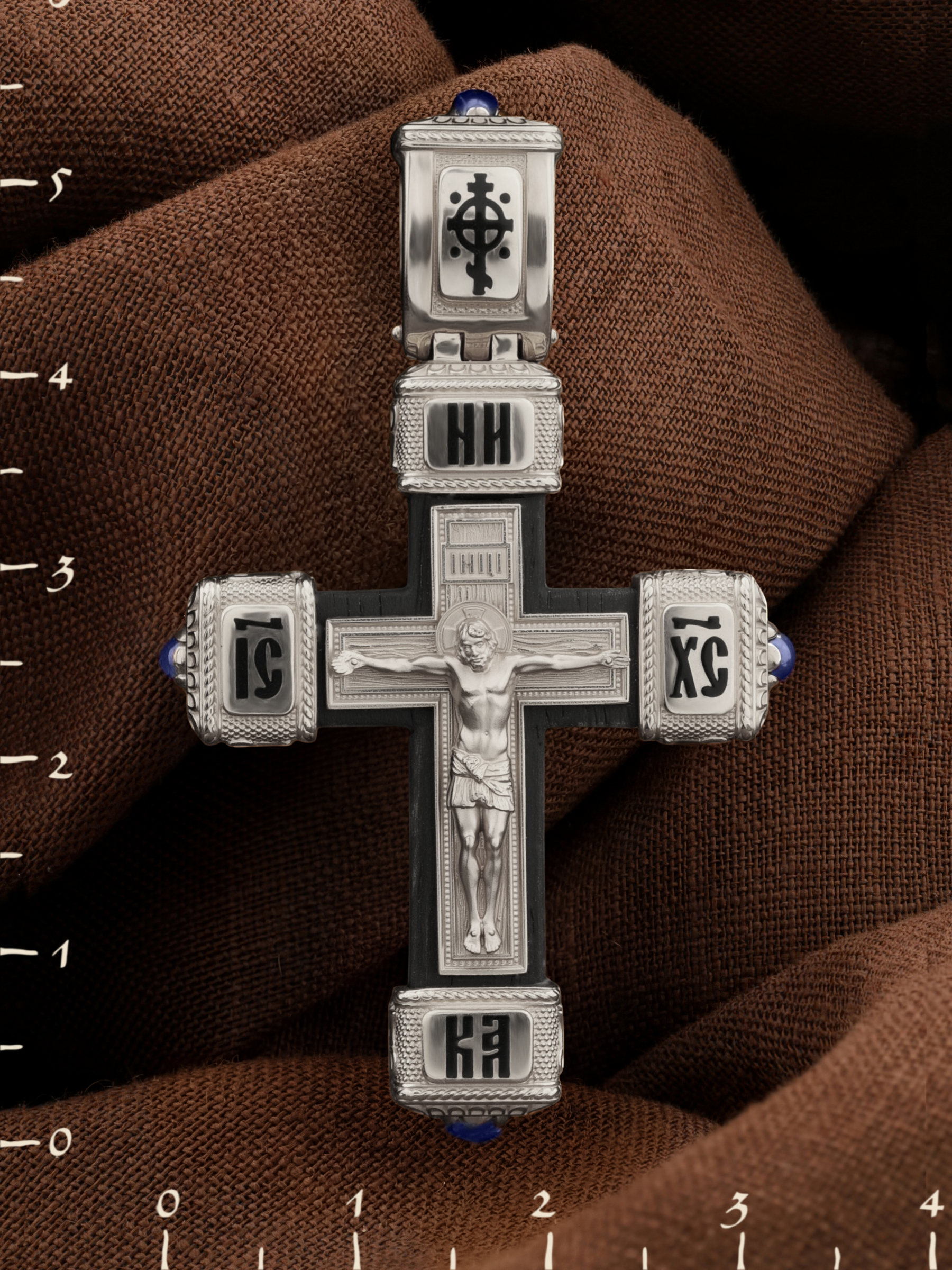 Крест из белого золота c эмалью, сапфиром и эбеновым деревом