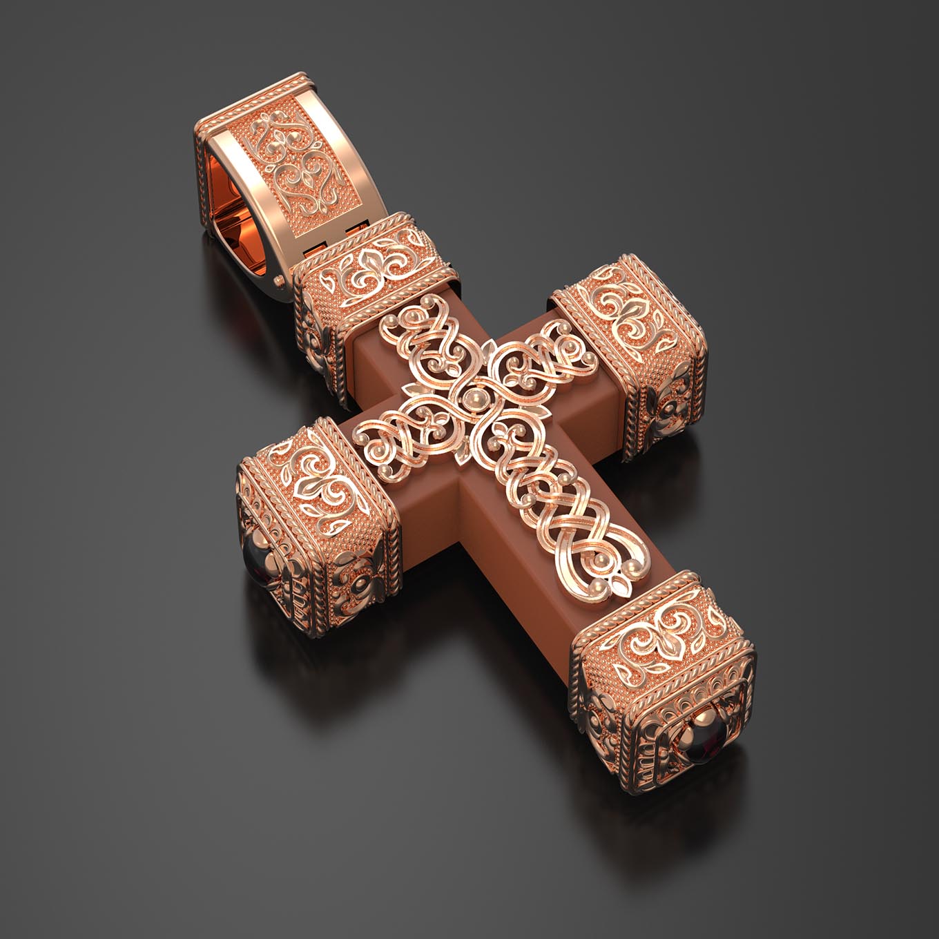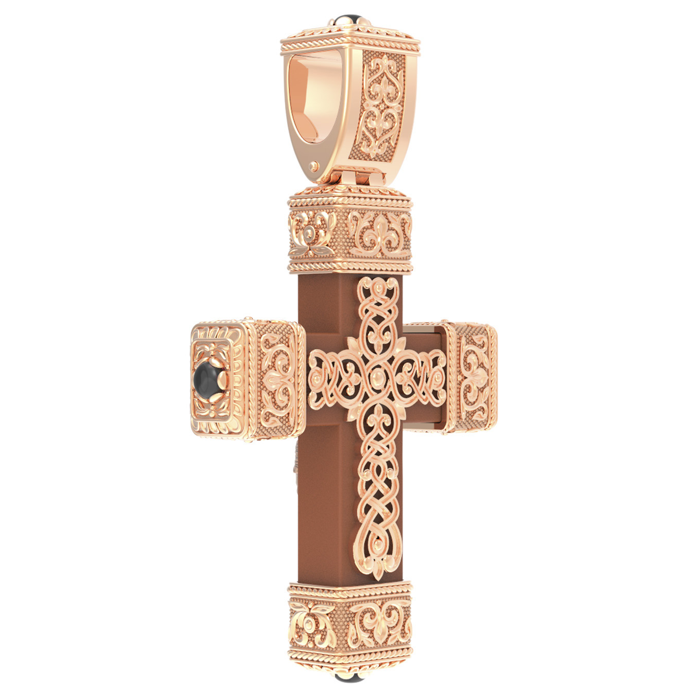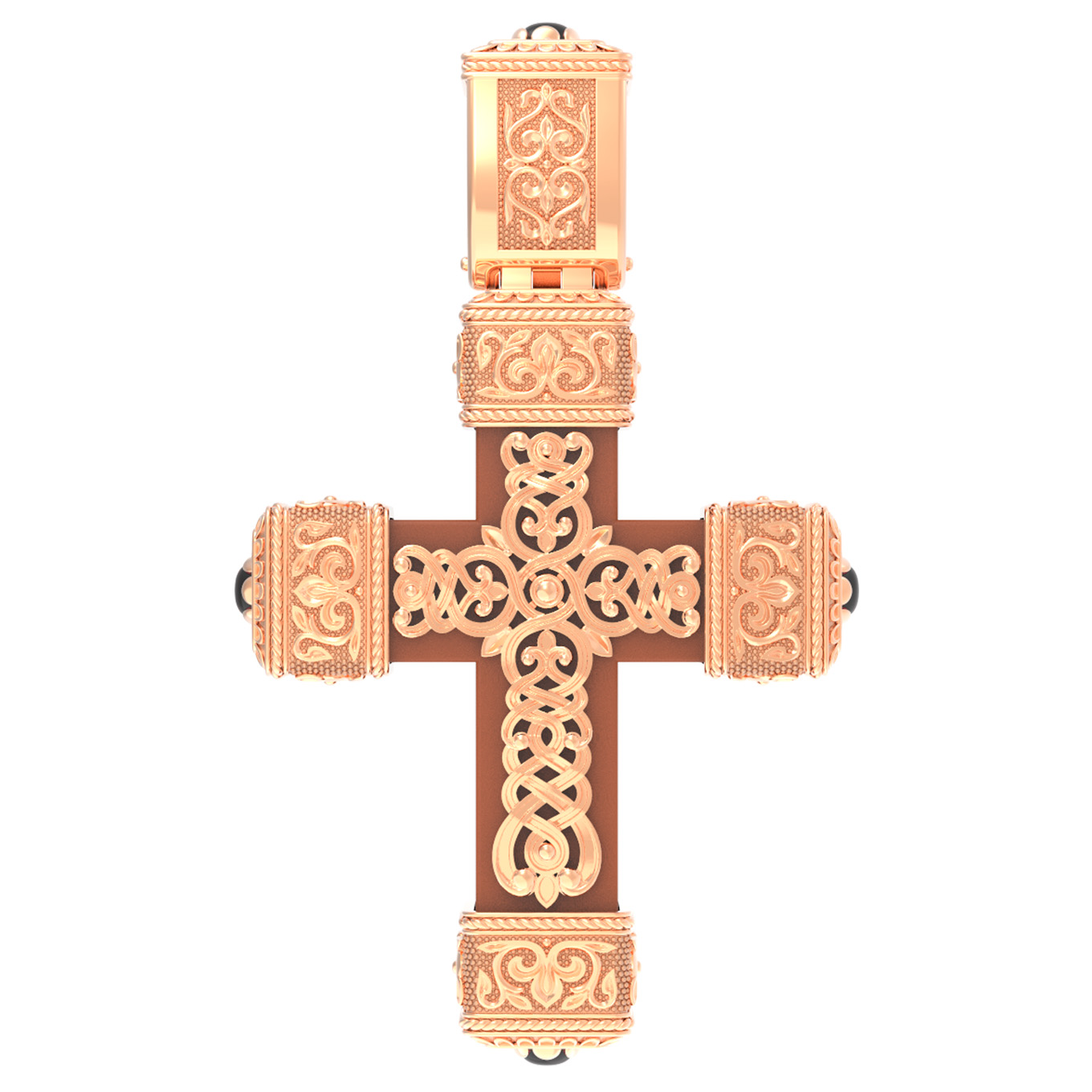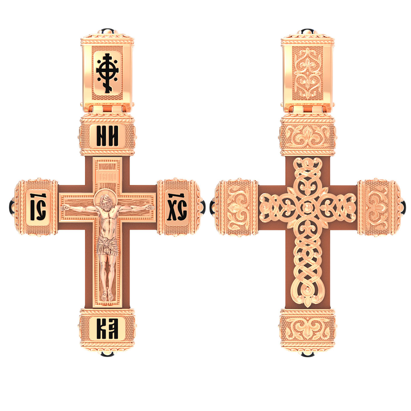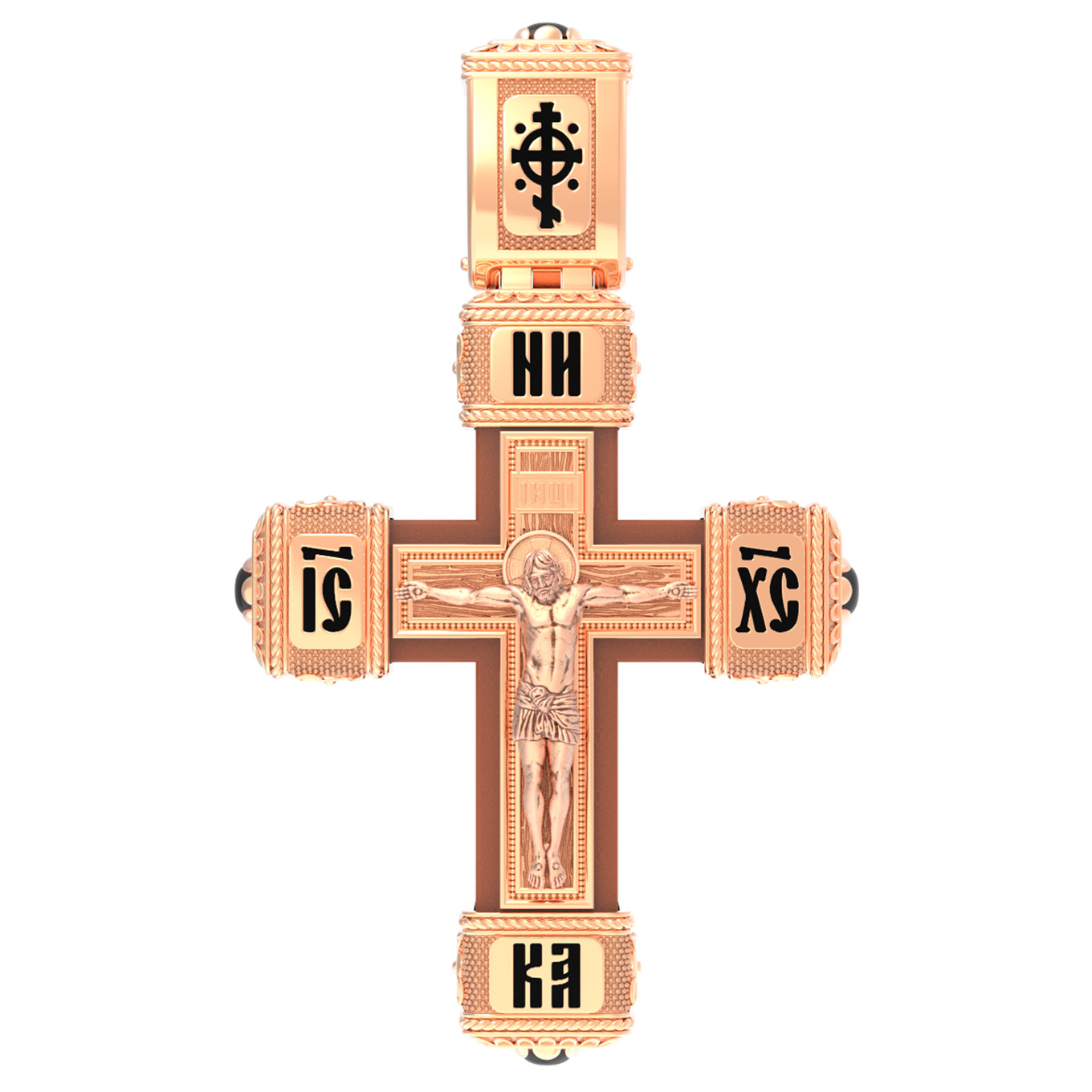 На лицевой стороне креста изображено Распятие Господа и Спасителя нашего Иисуса Христа. Крест- символ спасения и искупления рода человеческого, знамение победы над смертью и адом. Иисус Христос, как искупительная жертва освобождения человечества от власти греха, умер крестной смертью и в третий день воскрес. На верхней табличке, выше головы Иисуса, расположена надпись, составленная Понтием Пилатом — «ИНЦИ». Она означает «Иисус Назорей, Царь Иудейский». Надпись «IС ХС» означает Иисус Христос помещается на разных сторонах поперечной перекладины креста. Надпись –«НИКА» означает победитель. На кулонном кольце помещен крест «терновый венец». Этот крест имеет форму восьмиконечного креста, вторая перекладина которого в центре обведена кругом с остриями по краю, символизирующими терновый венец. «Воины, сплетши венец из терна, возложили ему на голову, — говорится в Евангелии, — и ранами Его мы исцелились» (Ис. 53, 5). Вот почему терновый венок стал для христиан символом победы и награды, «венцом правды» (2 Тим. 4, 8), «венцом славы» (1 Пет. 5, 4), «венцом жизни» (Иак. 1, 12;.Апок. 2, 10).