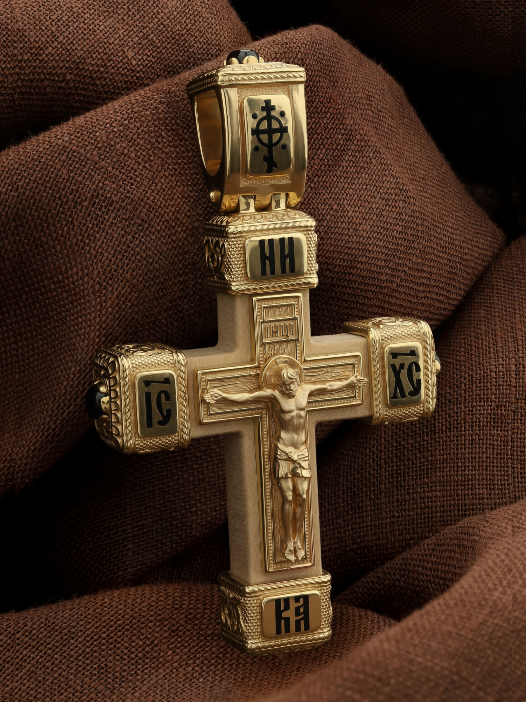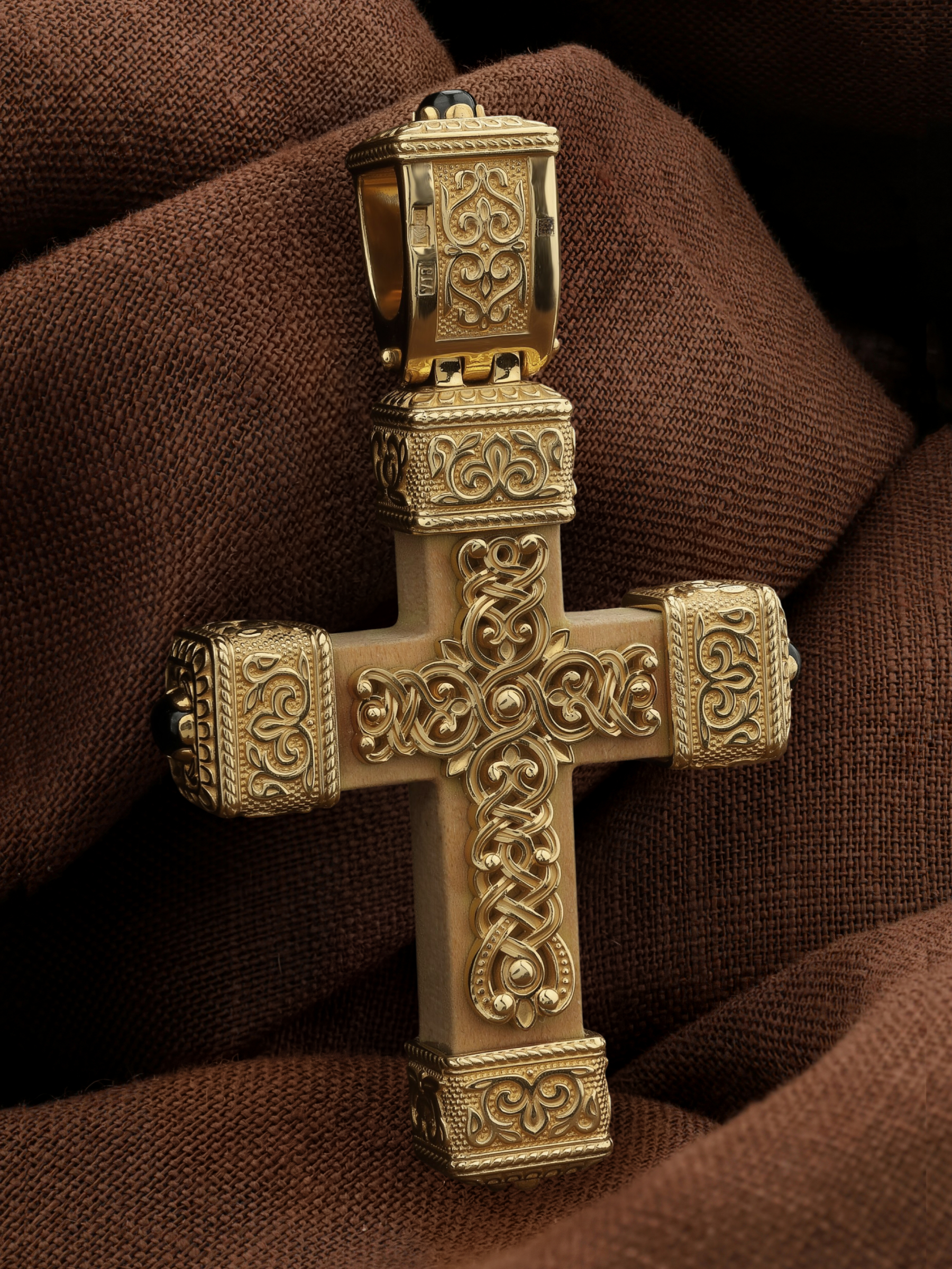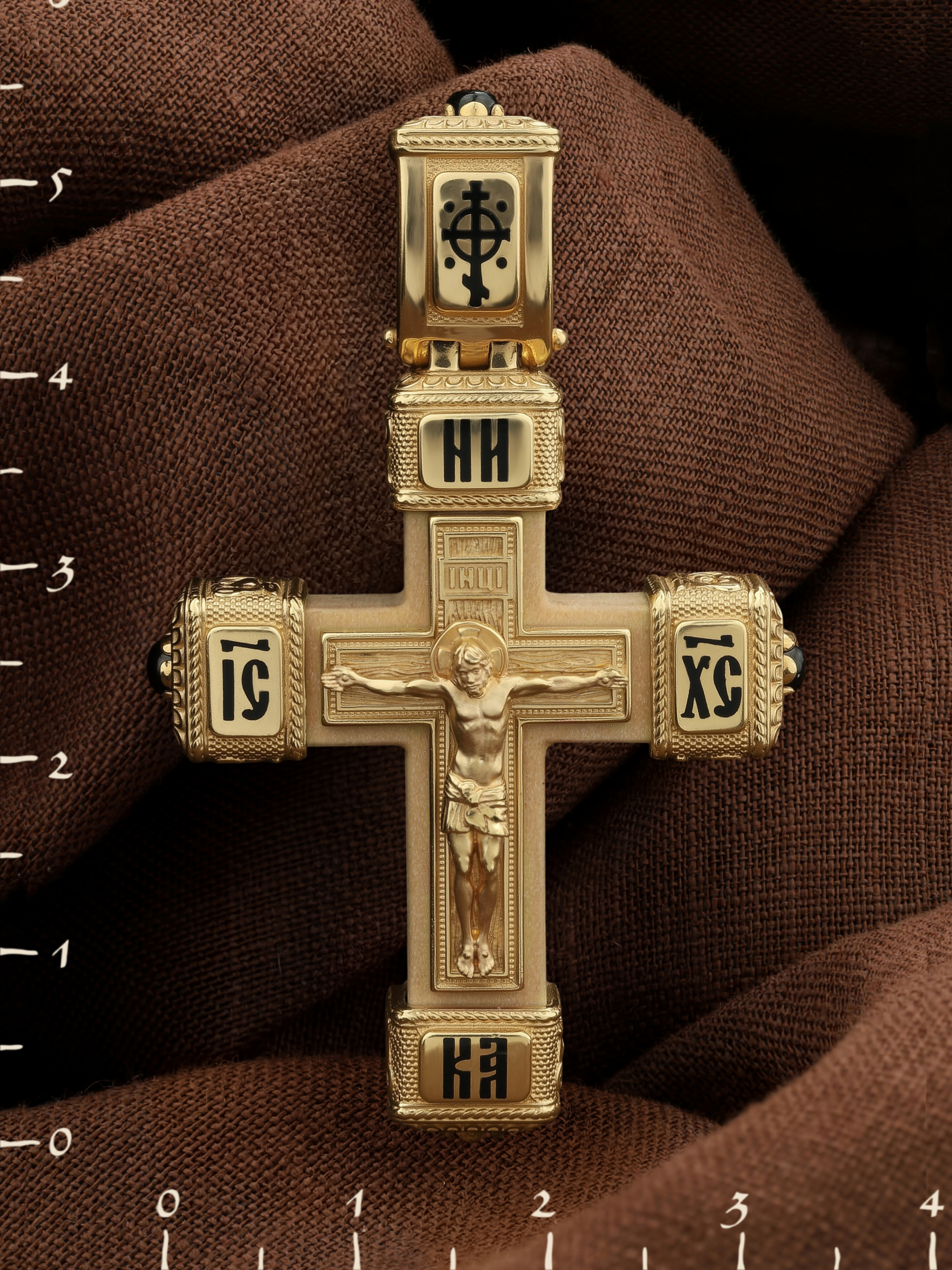 Крест из лимонного золота c эмаль, ониксом и деревом груши