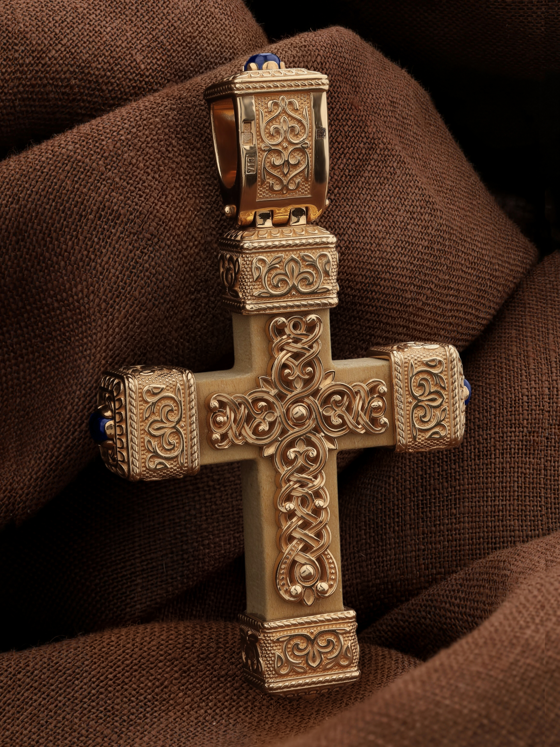 Крест из золота c эмаль , сапфиром и деревом груши