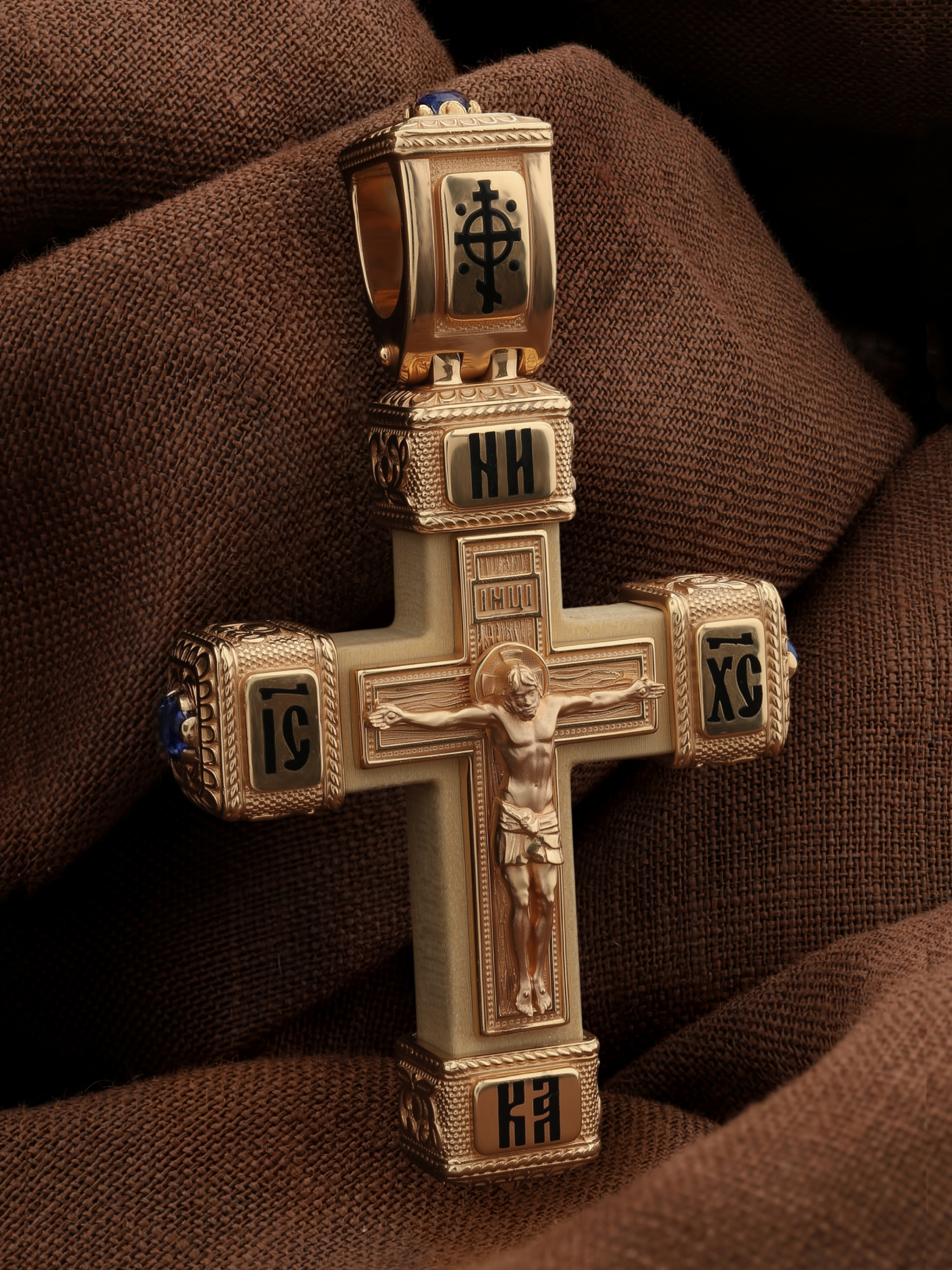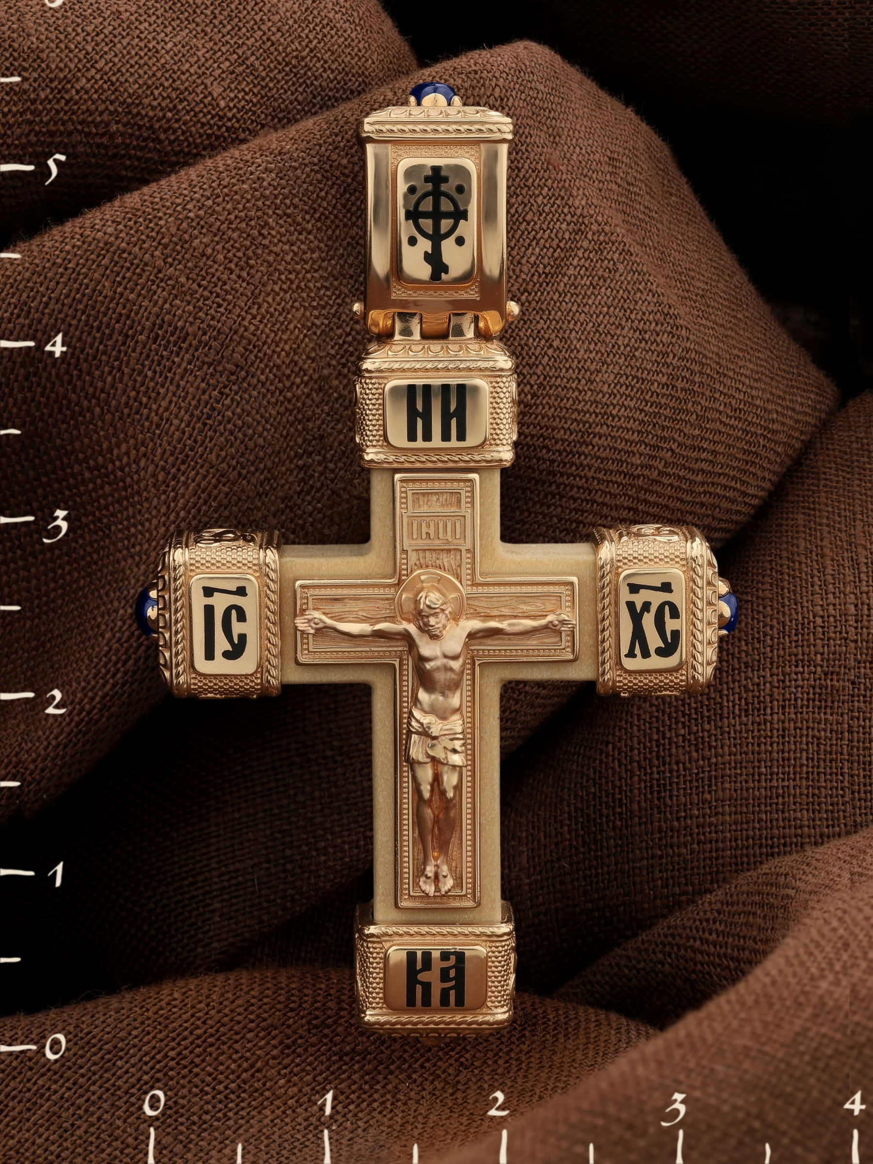 Крест из золота c эмаль, сапфиром и деревом груши