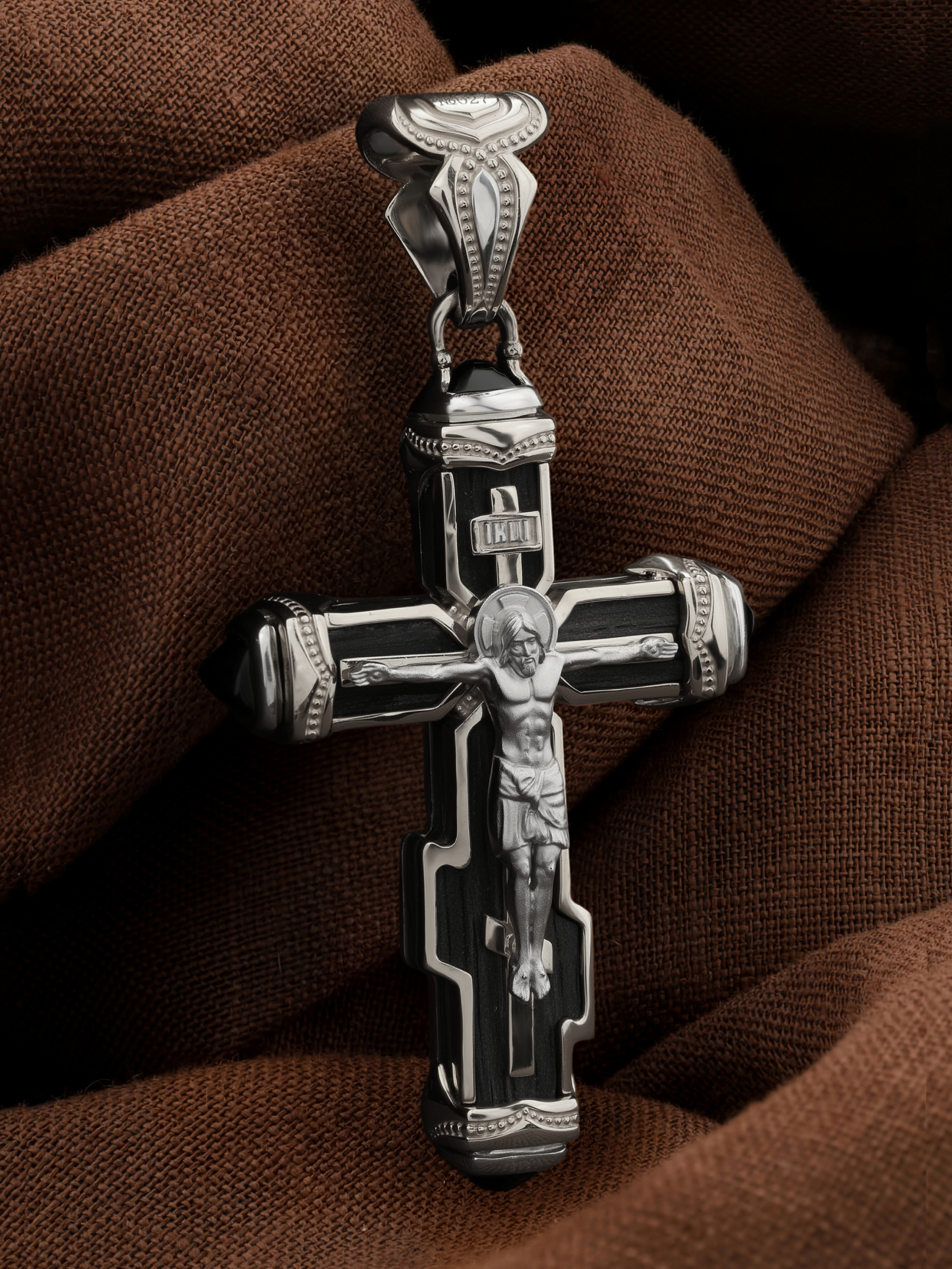 На лицевой стороне креста изображено Распятие Господа и Спасителя нашего Иисуса Христа. Своими крестными страданиями Господь смыл наши грехи, покрыл наш долг перед Богом или, на языке Писания, нас «искупил». В Голгофе сокрыта непостижимая тайна бесконечной правды и любви Бога. Крест стал символом победы добра над злом, жизни над смертью, напоминанием бесконечной Божьей любви, предметом радости. Воплотившийся Сын Божий Своею кровью освятил крест и сделал его проводником Своей благодати, источником освящения верующих. На верхней табличке, выше головы Иисуса, расположена надпись, составленная Понтием Пилатом — «IНЦI». Она означает «Иисус Назорей, Царь Иудейский». Надпись «IC» «ХC», означает Иисус Христос, помещаются на разных сторонах поперечной перекладины креста. Христос в Своей Божественной любви, над которой смерть не властна и которая, страдая, и не страдает в обычном смысле, простирает к людям со Креста Свои объятия, в которые призывается и привлекается весь мир. Поэтому Тело Его не висит, а торжественно покоится на Кресте.