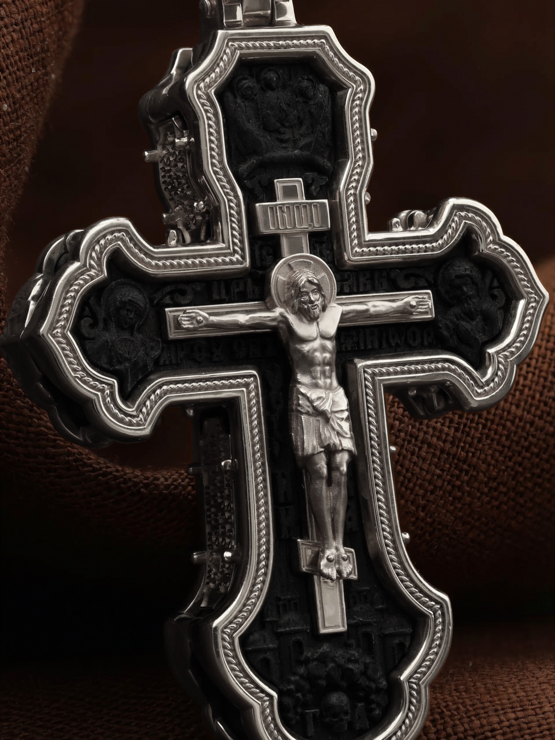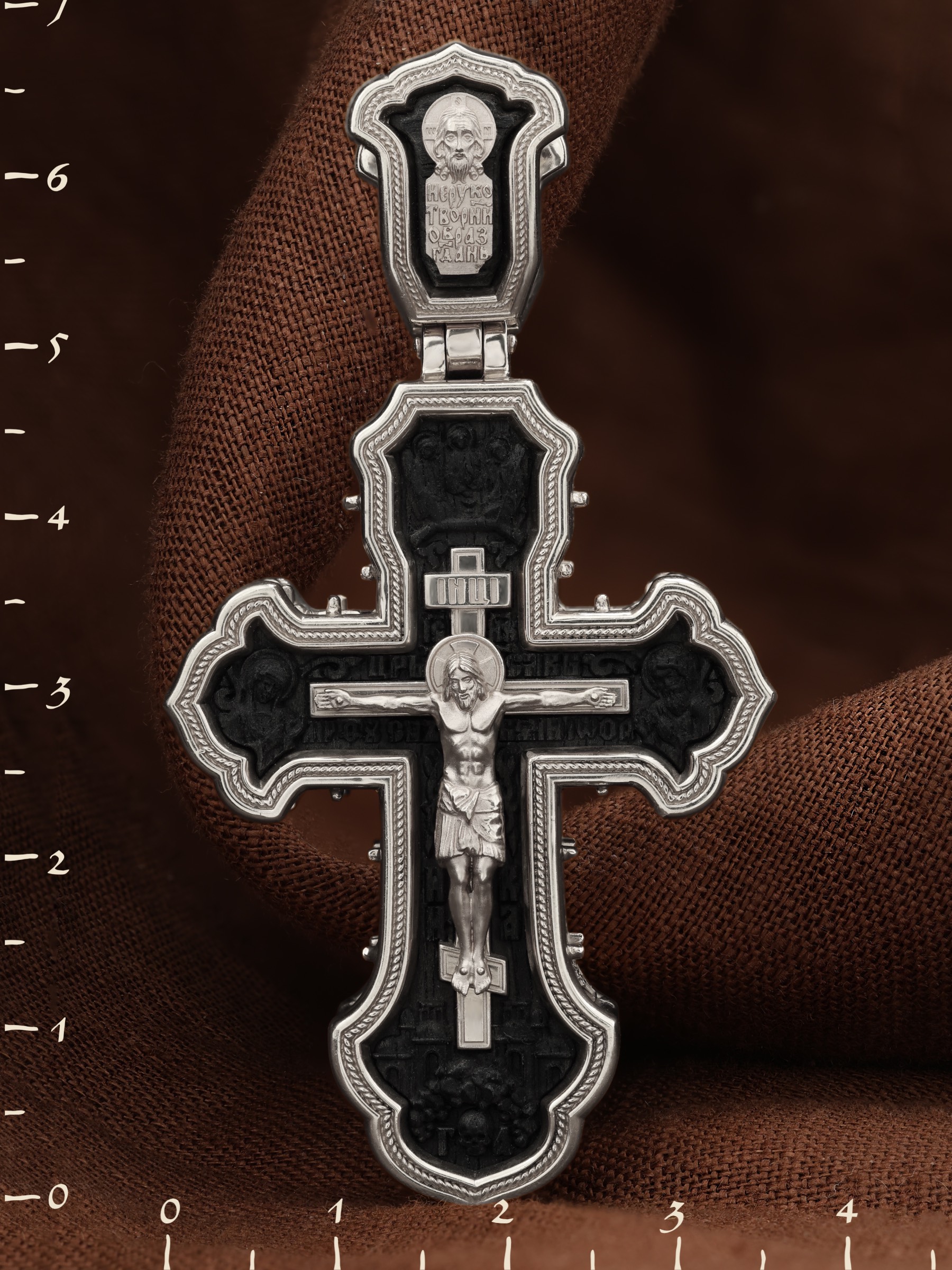 На лицевой стороне креста изображено Распятие Господа и Спасителя нашего Иисуса Христа, отдавшего Себя на смерть, чтобы другие могли жить — жить вечной жизнью, жить с Богом. Через крестную жертву Бог раскрывает нам Свою безмерную любовь и призывает к ответной любви. Своею кровью Господь освятил крест и сделал его проводником Своей благодати, источником освящения верующих. На верхней табличке, выше головы Иисуса, расположена надпись, составленная Понтием Пилатом — «IНЦI». Она означает «Иисус Назорей, Царь Иудейский». Распятие сопровождается каноническими надписями. Надпись «IС» « ХС» означает Иисус Христос и помещается над Распятием. Надпись «Царь Славы» помещается на разных сторонах поперечной (большой) перекладины креста. Ниже расположены надпись «Сын Божий» и слово «НИКА», что означает «победитель». Слева от Распятия изображена Пресвятая Богородица, Справа изображен Пророк Предтеча и Креститель Господень Иоанн. За Распятием высится Иерусалимская стена, в знак того, что Господь был распят вне стен города. Возвышение, на котором стоит Крест, символизирует гору Голгофу, на которой произошло Распятие. Под подножием Креста изображена покоящаяся голова (череп) Адама и надпись «Г.А.». Над распятием помещено изображение иконы Святой Троицы в виде трех ангелов. На кулонном кольце изображен Нерукотворный образ Господа и Спасителя нашего Иисуса Христа, чудесно отпечатавшийся на плате, котором Христос вытер свой лик.