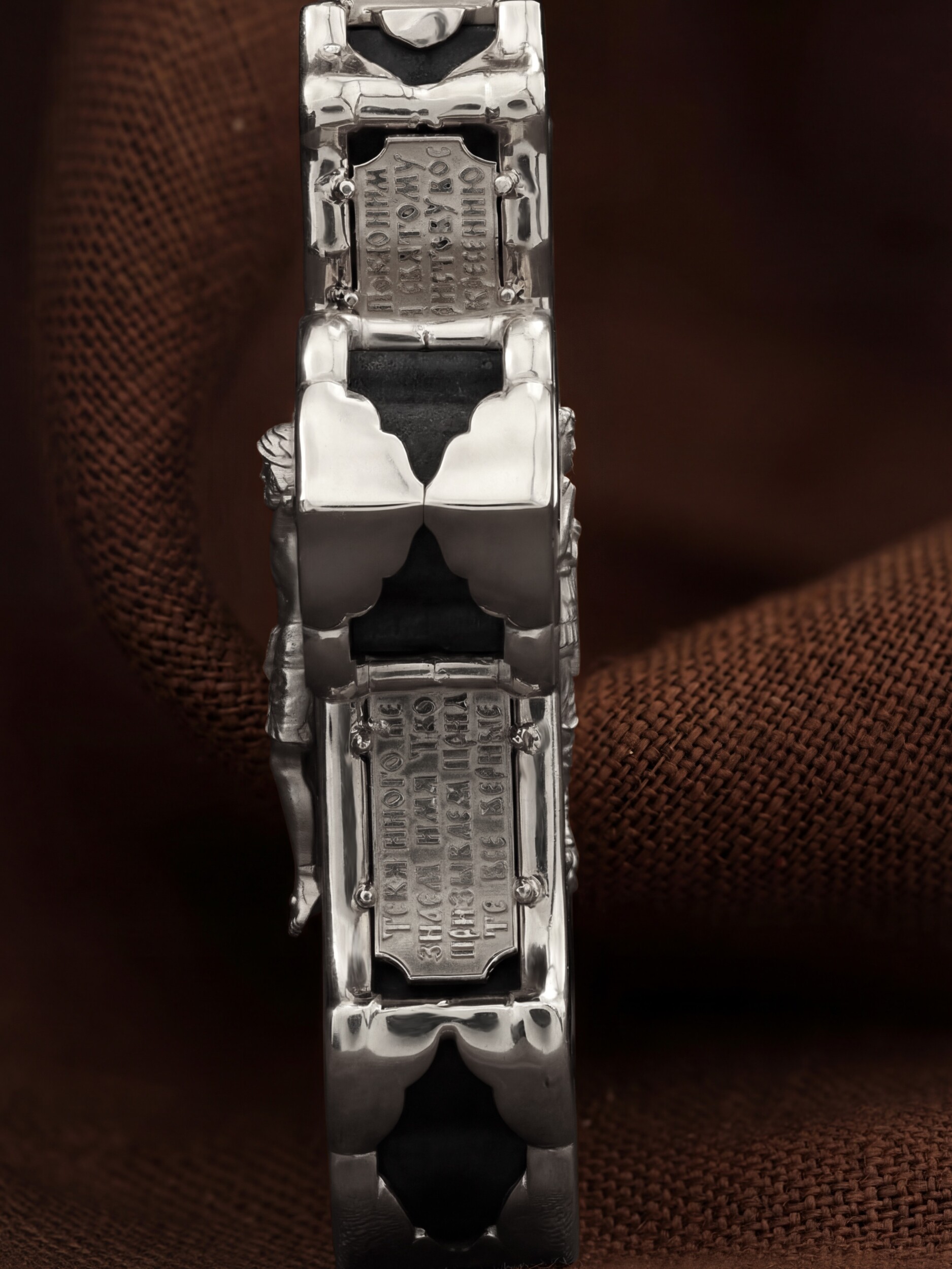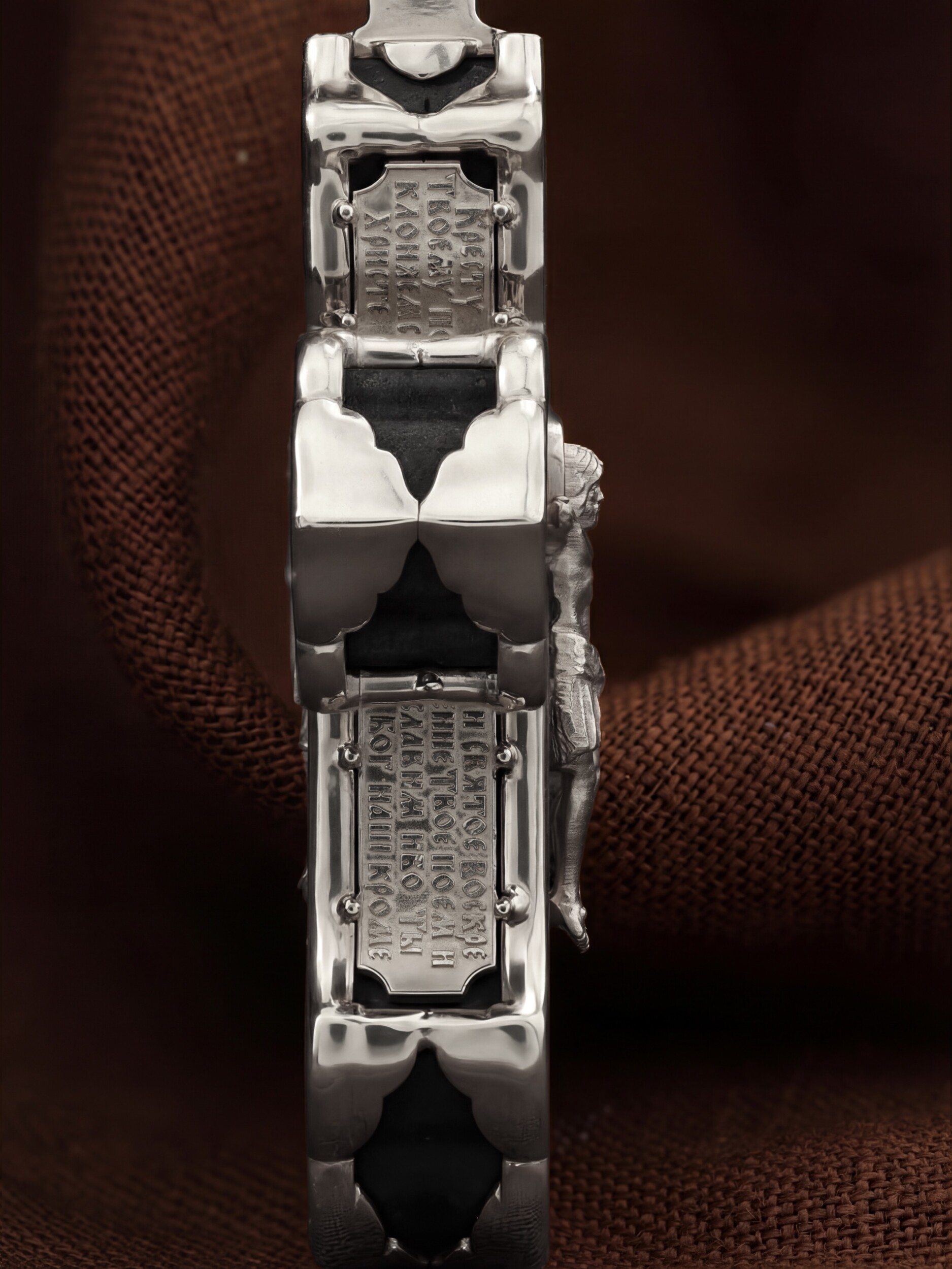 В центре оборотной стороне креста изображен Святой Агнгел-Хранитель в виде юноши держащего в правой руке крест, а в левой — мечь. Агнгел-Хранитель — это Ангел приставляемый Богом к человеку при крещении для охраны и помощи в добрых делах. Он невидимо находится при человеке на протяжении всей его жизни, если человек сохраняет в себе любовь к Богу и истинную веру перед Ним. По сторонам от изображения помещена молитва: «Ангеле Божий, хранителю мой святый, на соблюдение мне от Бога с небесе данный! Прилежно молю тя: ты мя днесь просвети, и от всякаго зла сохрани, ко благому деянию настави…». На кулонном кольце изображена икона Божией Матери «Покров Пресвятой Богородицы».