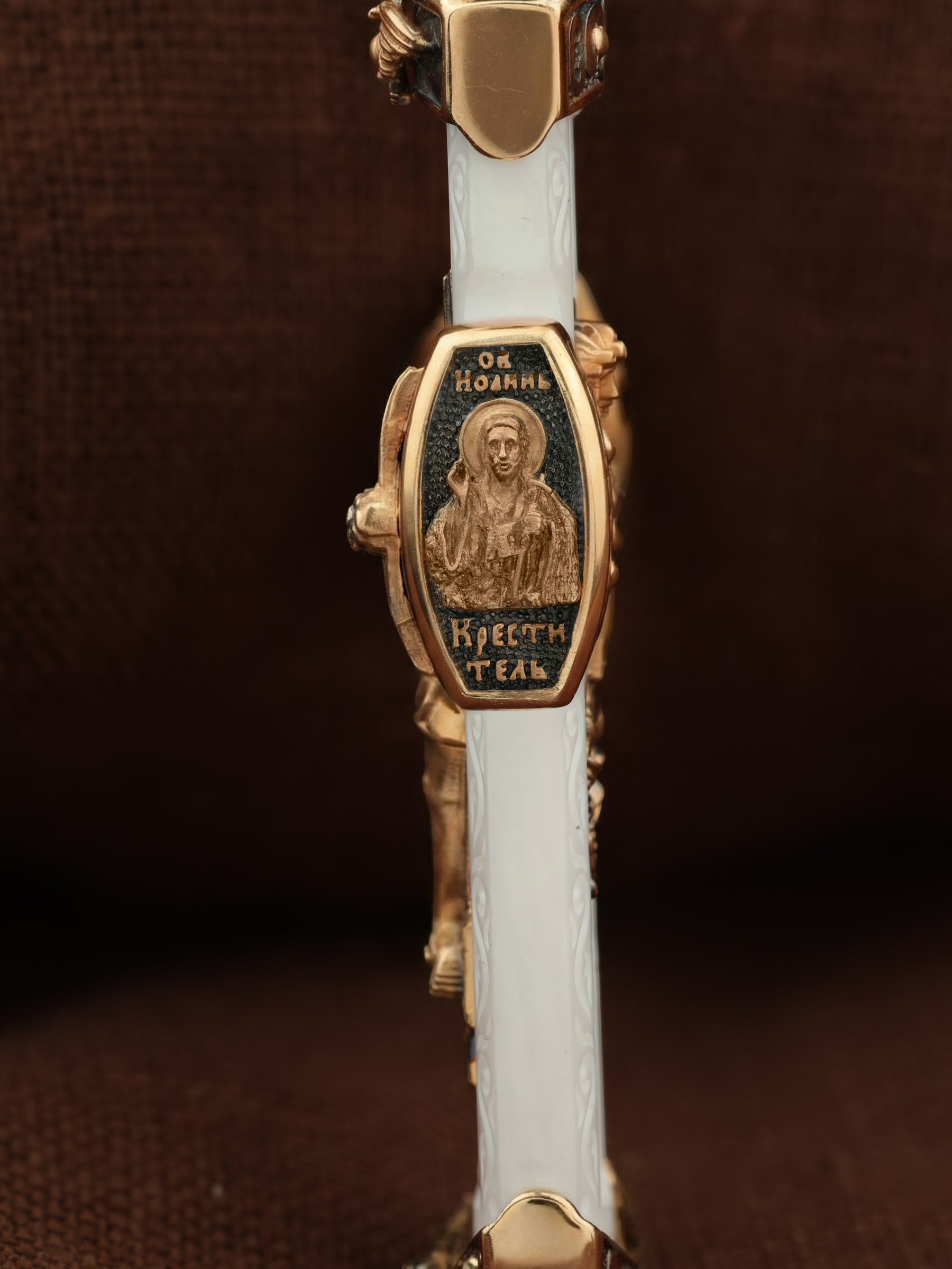 На торце изделия с левой стороны помещена икона Святого Николая Чудотворца — самый почитаемый в Православной Церкви, которого еще называют Николай Угодник за то, что он угодил своей жизнью Богу. Николай Чудотворец, помощник в делах, покровитель учащихся, утешитель обиженных и нуждающихся, целитель самых страшных и тяжелых недугов, предстатель и молитвенник за людей перед Богом. Также Святитель Николай Чудотворец известен своими молитвами за путешественников, когда непрестанный ветер и бушующие волны утихают и корабль заходит в спокойную гавань. На торце изделия с правой стороны — икона Святого Иоанна Крестителя. Святой Иоанн был последним пророком Израиля. Он призывал к покаянию, предвозвещая приближение Царствия Небесного (Мф. 3, 2), и удостоился стать Крестителем Христа. Иисус Христос говорит о нем: «Сей есть о котором написано: «Вот, Я посылаю Ангела Моего пред лицем Твоим, который приготовит путь Твой пред Тобою» (Лк. 7, 27). И еще: «Из рожденных женами нет ни одного пророка больше Иоанна Крестителя» (Лк. 7, 28).