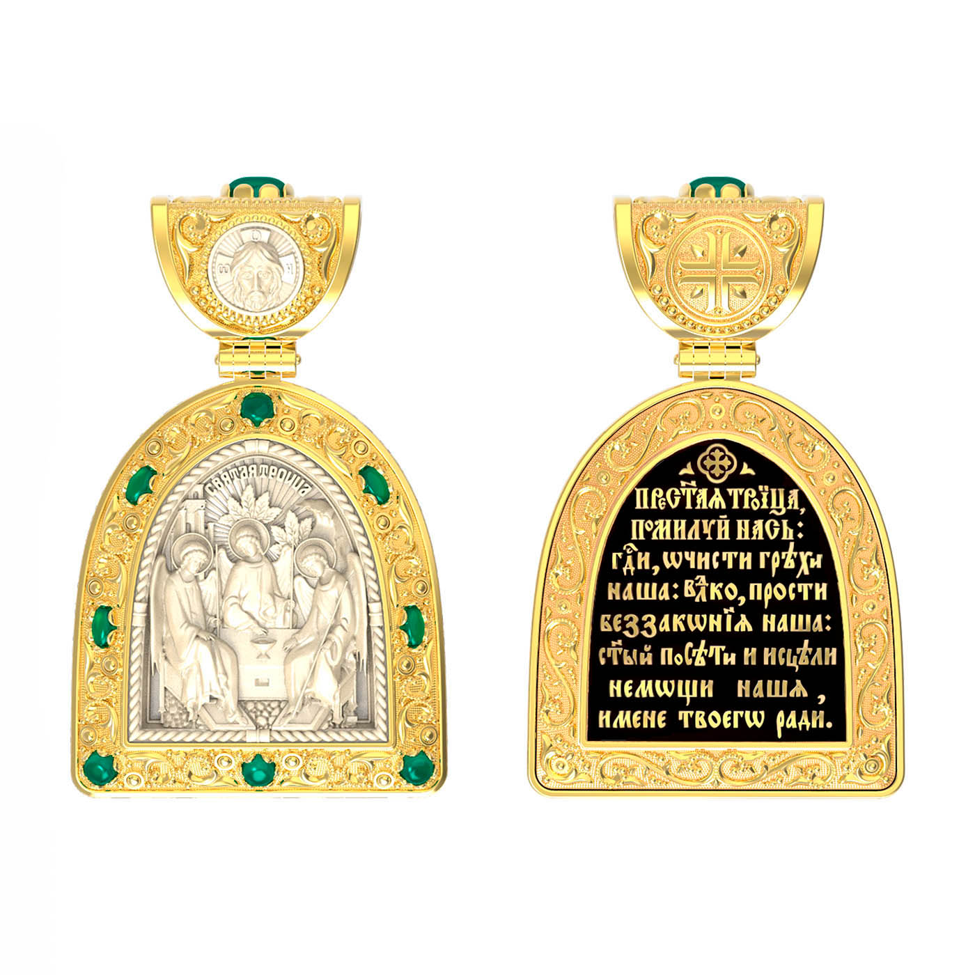 Основой композиции лицевой стороны является икона Святой Троицы.