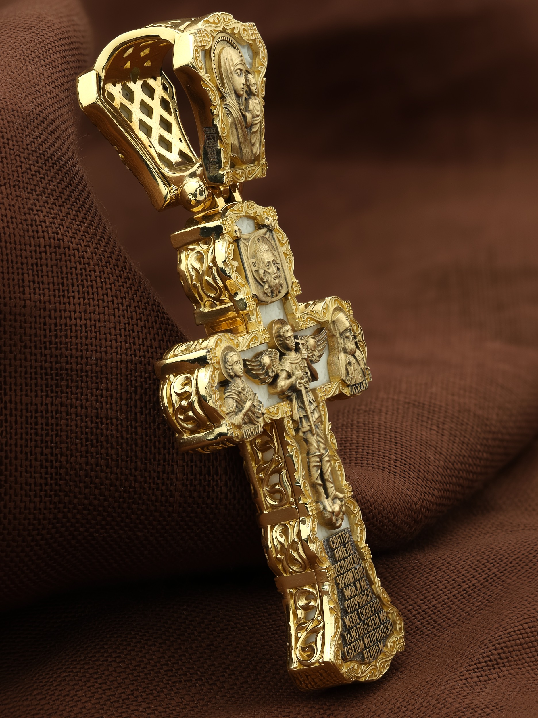 На центральной части оборотной стороны креста изображен Святой Ангел-Хранитель в виде прекрасного юноши держащего в правой руке крест, а в левой — мечь. Ангел-Хранитель — это Ангел приставляемый Богом к человеку при крещении для охраны и помощи в добрых делах. Невидимо пребывая при нас постоянно, он, руководствуя нас ко спасению, не только по нашему желанию таинственно наставляет нас на все доброе и полезное, не только возносит наши молитвы к Богу, но еще и сам от себя охраняют и защищают нас от врагов видимых и невидимых и ходатайствует за нас пред Богом. Ниже образа написана молитва: «Святый Ангеле Господень, Хранитель мой, не отлучайся мене скверного, но просвети мя светом неприкосновенным.» Выше образа изображен Спас Нерукотворный — образ Господа и Спасителя нашего Иисуса Христа, чудесно отпечатавшийся на плате, котором Христос вытер свой лик. Слева — Свя¬той ве¬ли¬ко¬му¬че¬ник и це¬ли¬тель Пан¬те-ле¬и¬мон. Господь даровал удивительную силу его молитве. Ею он исцелял любые болезни, воскрешал мертвых. Справа — Святитель Лука (Войно-Ясенецкий). На кулонном кольце изображена Казанская икона Божией Матери — одна из самых любимых на Руси.