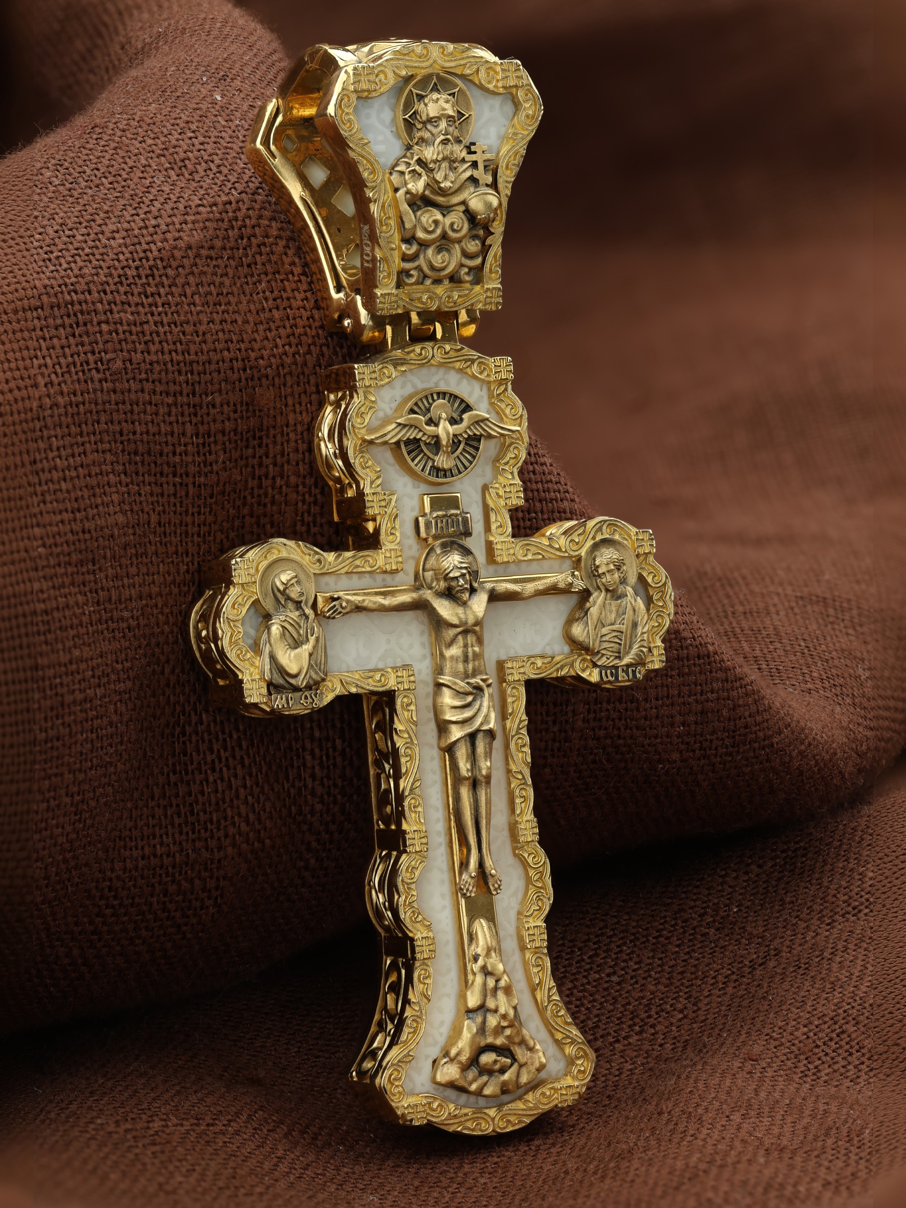 На лицевой стороне креста изображено Распятие Господа и Спасителя нашего Иисуса Христа. Христос, подвергнутый на кресте мучительной казни, своими страданиями искупил нас от древнего греха и даровал нам жизнь вечную. Без Распятия не было бы Воскресения Христова, и поэтому Крест из орудия казни обратился в святыню, в которой действует Благодать Божия. Через крестную жертву Бог раскрывает нам Свою безмерную любовь и призывает к ответной любви. На верхней табличке, выше головы Иисуса, расположена надпись, составленная Понтием Пилатом на трех языках — «IНЦI». Она означает «Иисус Назорей, Царь Иудейский». Надпись «IС ХС» означает Иисус Христос и помещается на разных сторонах поперечной (большой) перекладины креста. Крест стоит на горе камней, символизирующих Голгофу. В ее основании различается череп– это голова Адама. У Креста стоят оплакивающие Господа Божия Матерь и апостол Иоанн Богослов. Из всех апостолов об одном лишь Иоанне Богослове говорится, что он стоял на Голгофе у креста Спасителя, не заботясь о собственной безопасности. Он услышал обращенные к Ней с высоты Креста слова Распятого Господа: «Жено, се сын Твой» и к нему: «Се Мати твоя». С этого времени Иоанн взял Матерь Божию к себе, и Она жила в его доме до самой смерти. Над Распятием — изображение Духа Святого в виде голубя, сходящего с Небес. На кулонном кольце изображен Бог Отец.
