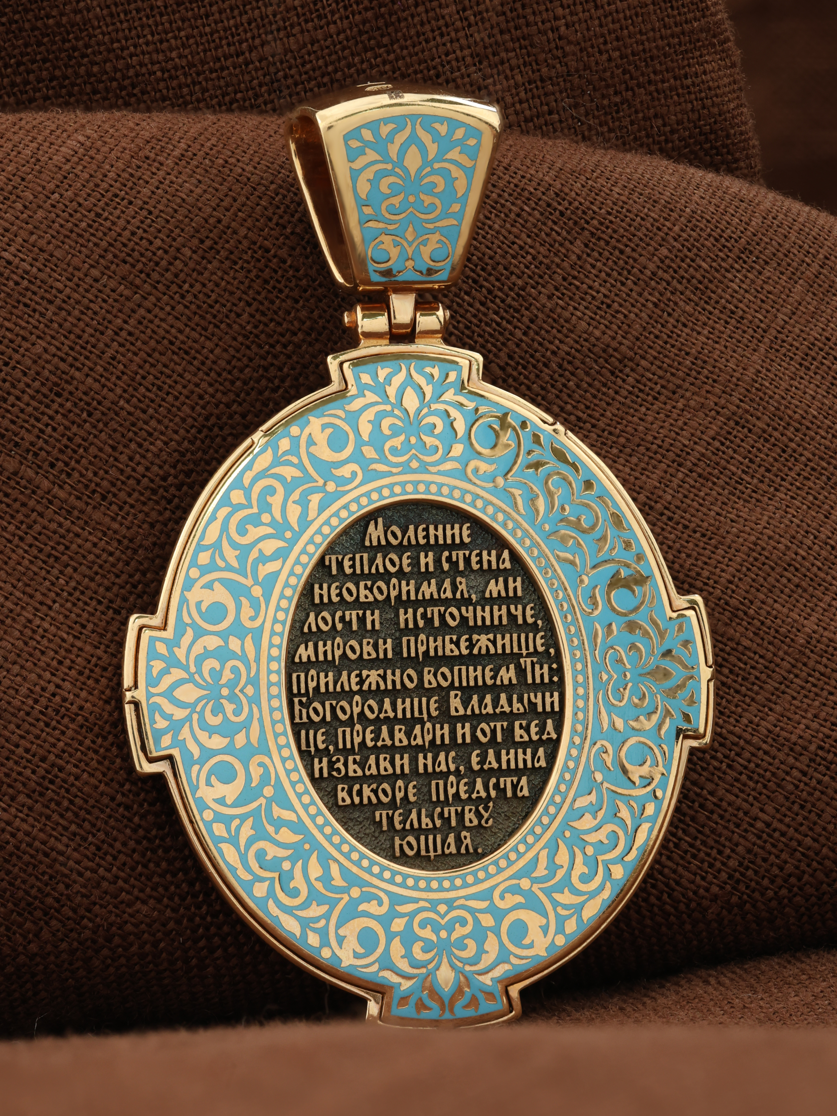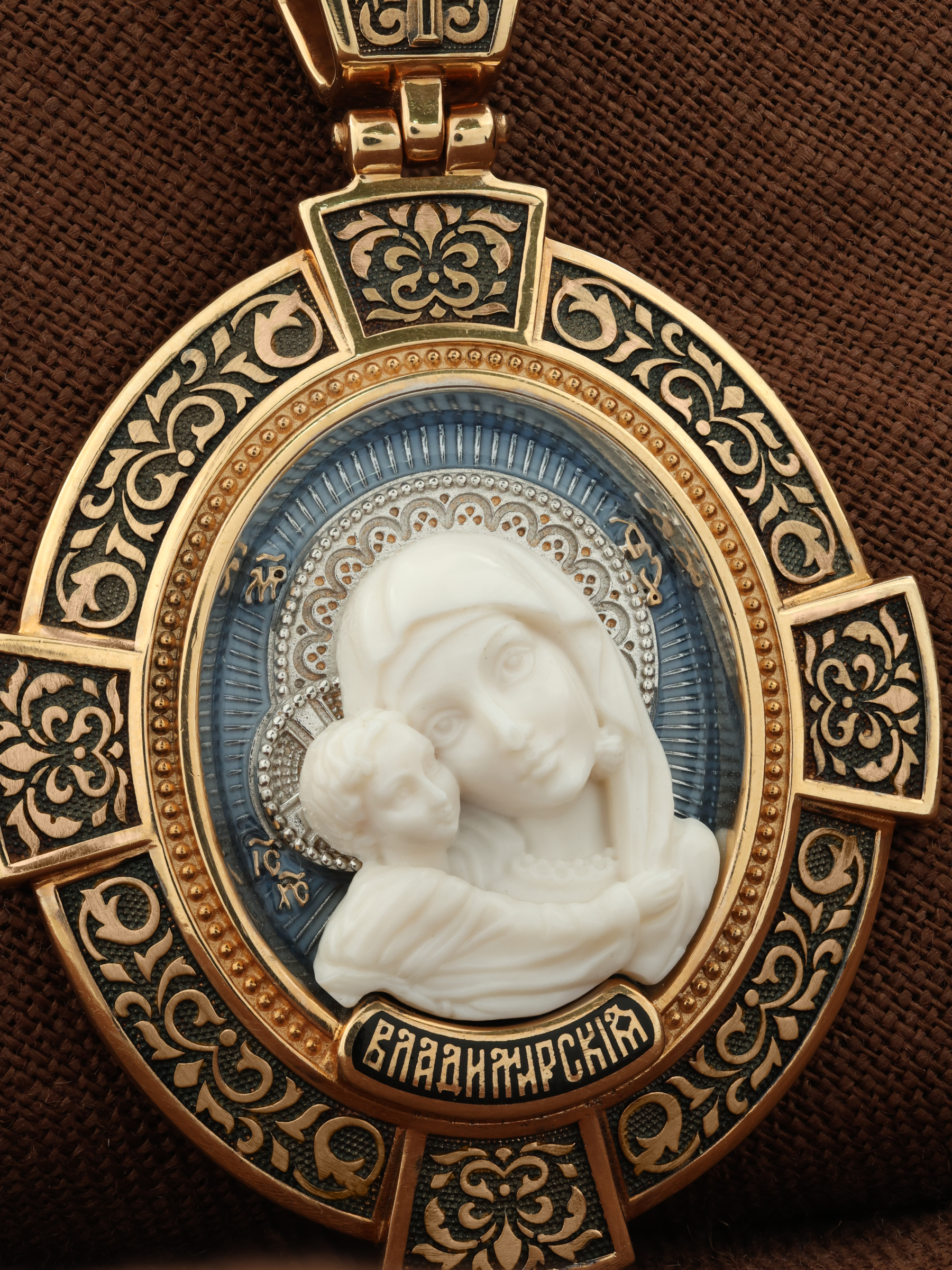 На лицевой стороне образка изображена Владимирская икона Божией Матери — одна из самых чтимых святынь Русской православной церкви. По преданию, икона была написана Святым апостолом и евангелистом Лукой во время земной жизни Богородицы. Дева Мария, увидев Свое изображение, молвила: «Отныне ублажат Мя вси роди. Благодать Рождшегося от Меня и Моя с сим образом да будет». Образ написан в лирическом иконографическом типе «Умиление». Младенец припал щекой к щеке Матери и тянется к ней правой рукой, другой нежно обнимая за шею. Икона вплоть до V века находилась в Иерусалиме, затем была перевезена в Византию. На Русь икона была привезена в 1131 г. За прошедшие столетия святыня неоднократно переезжала из Владимира в Москву и обратно, не раз спасая страну от захватчиков. Русская Православная Церковь установила троекратное празднование Владимирской иконе Божьей Матери. Каждый из дней празднования связан с избавлением русского народа от порабощения иноплеменниками по молитвам ко Пресвятой Богородице. В последующие века у иконы происходили многие важные исторические события: подписание актов, принятие присяги значимых государственных деятелей и возведение на престол. На кулонном кольце изображен Спас Нерукотворный — образ Господа и Спасителя нашего Иисуса Христа, чудесно отпечатавшийся на плате, котором Христос вытер свой лик.
