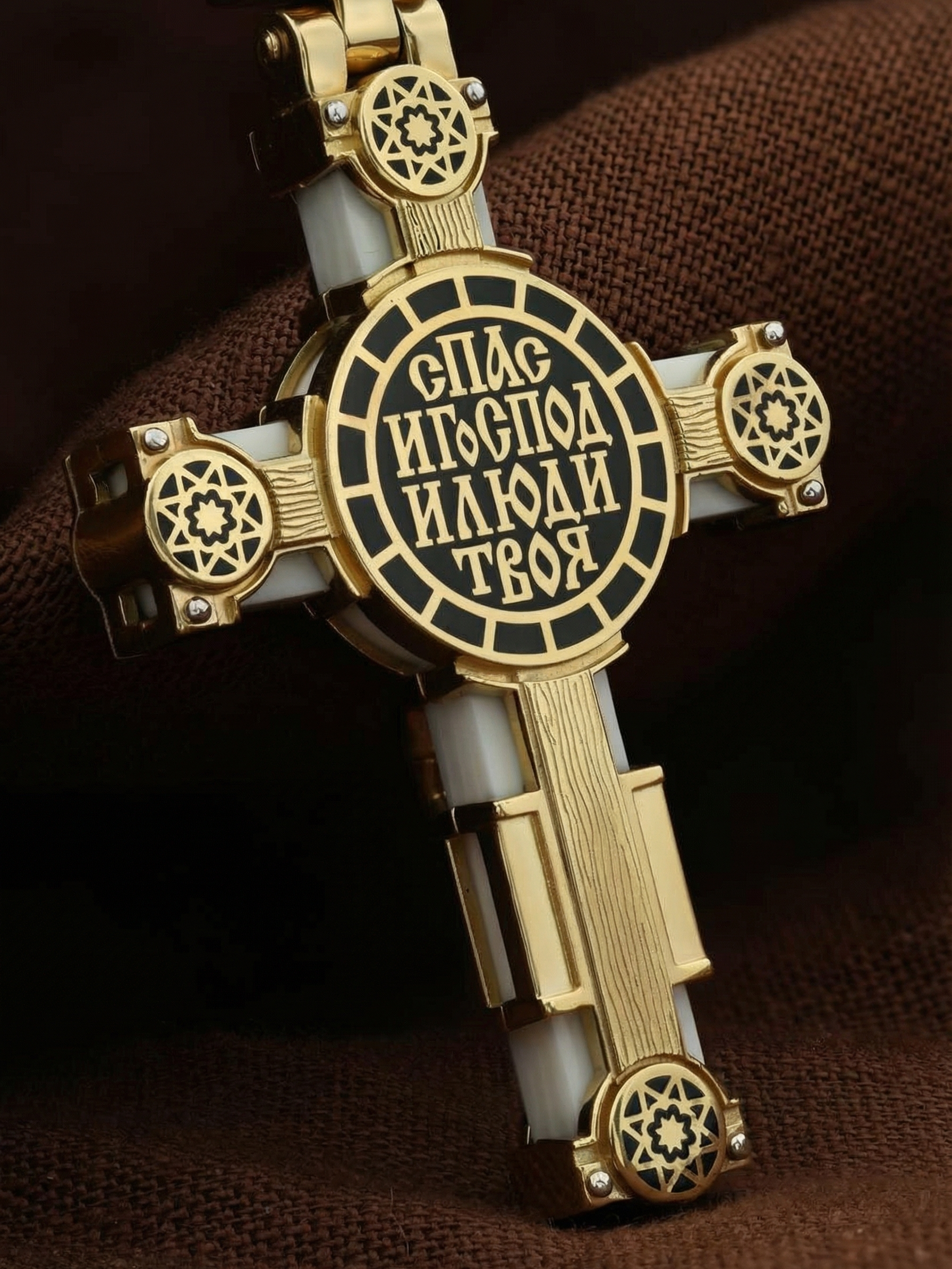 На лицевой стороне креста изображено Распятие Господа и Спасителя нашего Иисуса Христа. Христос, подвергнутый на кресте мучительной казни, своими страданиями искупил нас от древнего греха и даровал нам жизнь вечную. Без Распятия не было бы Воскресения Христова, и поэтому Крест из орудия казни обратился в святыню, в которой действует Благодать Божия. В Голгофе сокрыта непостижимая тайна бесконечной правды и любви Бога. Крест стал символом победы добра над злом, жизни над смертью, напоминанием бесконечной Божьей любви, предметом радости. Воплотившийся Сын Божий Своею кровью освятил крест и сделал его проводником Своей благодати, источником освящения верующих. Через крестную жертву Бог раскрывает нам Свою безмерную любовь и призывает к ответной любви. Над вершиной Распятия помещена надпись «Царь Славы». На верхней табличке, выше головы Иисуса, расположена надпись, составленная Понтием Пилатом — «IНЦI». Она означает «Иисус Назорей, Царь Иудейский». Надпись «IС ХС» означает Иисус Христос помещается на разных сторонах поперечной перекладины креста. Рядом помещены словосочетание «СЫН БОЖИЙ», что означает божественную природу Иисуса Христа и надпись –«НИКА», что означает победитель. Надпись «Г.А.» — голова Адама, грехи которого Христос омыл Своею Кровью, размещена под подножием креста. На православном кресте Христос не умирает, а свободно простирает руки, ладони Иисуса открыты, будто он хочет обнять все человечество, даря им свою любовь и открывая путь к вечной жизни. На кулонном кольце помещен крест Константина — монограмма, известная как «Хи-Ро» («хи» и «ро» — первые две буквы имени Христа по-гречески). Монограмма стала первым общепринятым символом христианства — как знак победы и спасения.