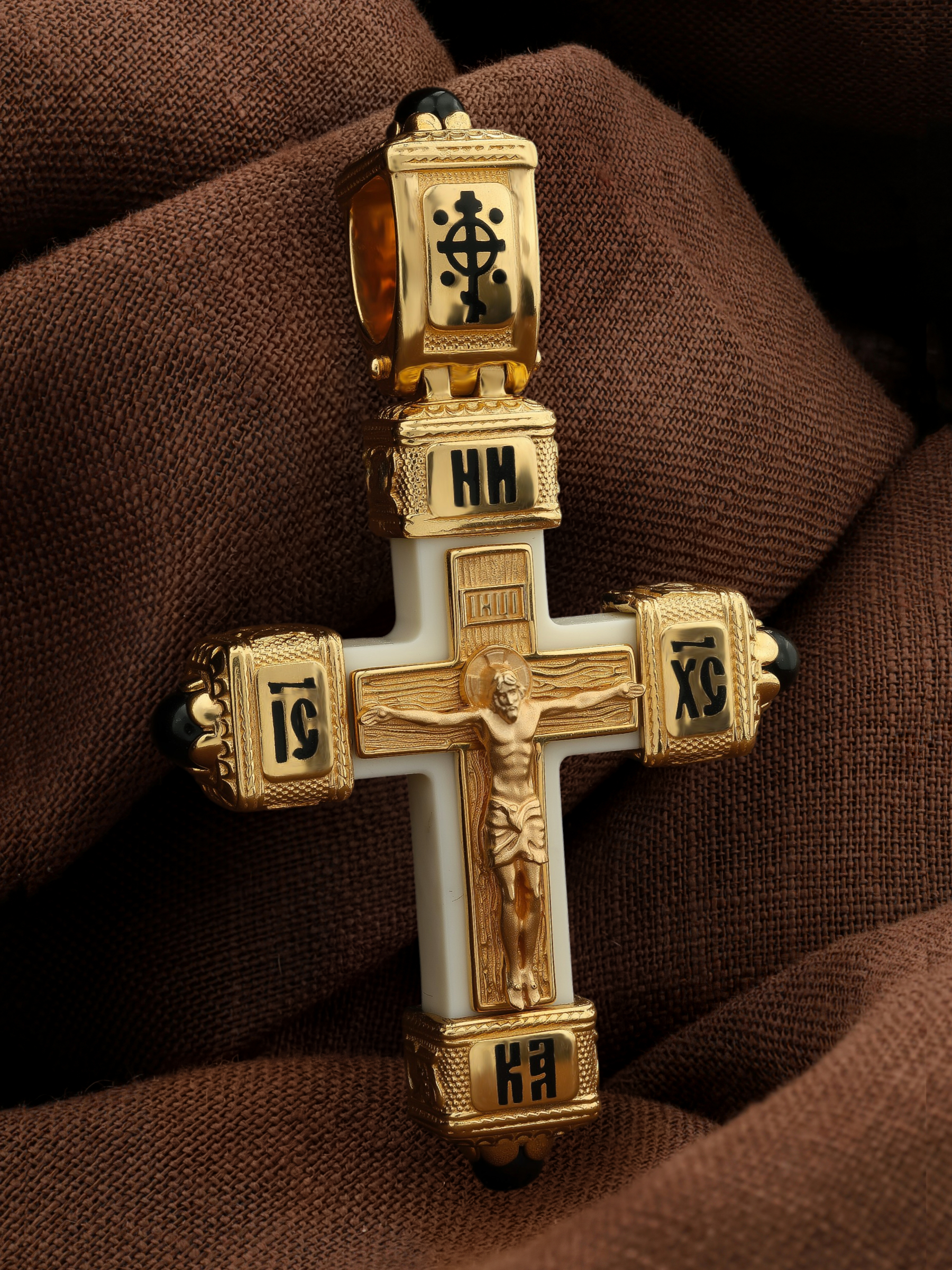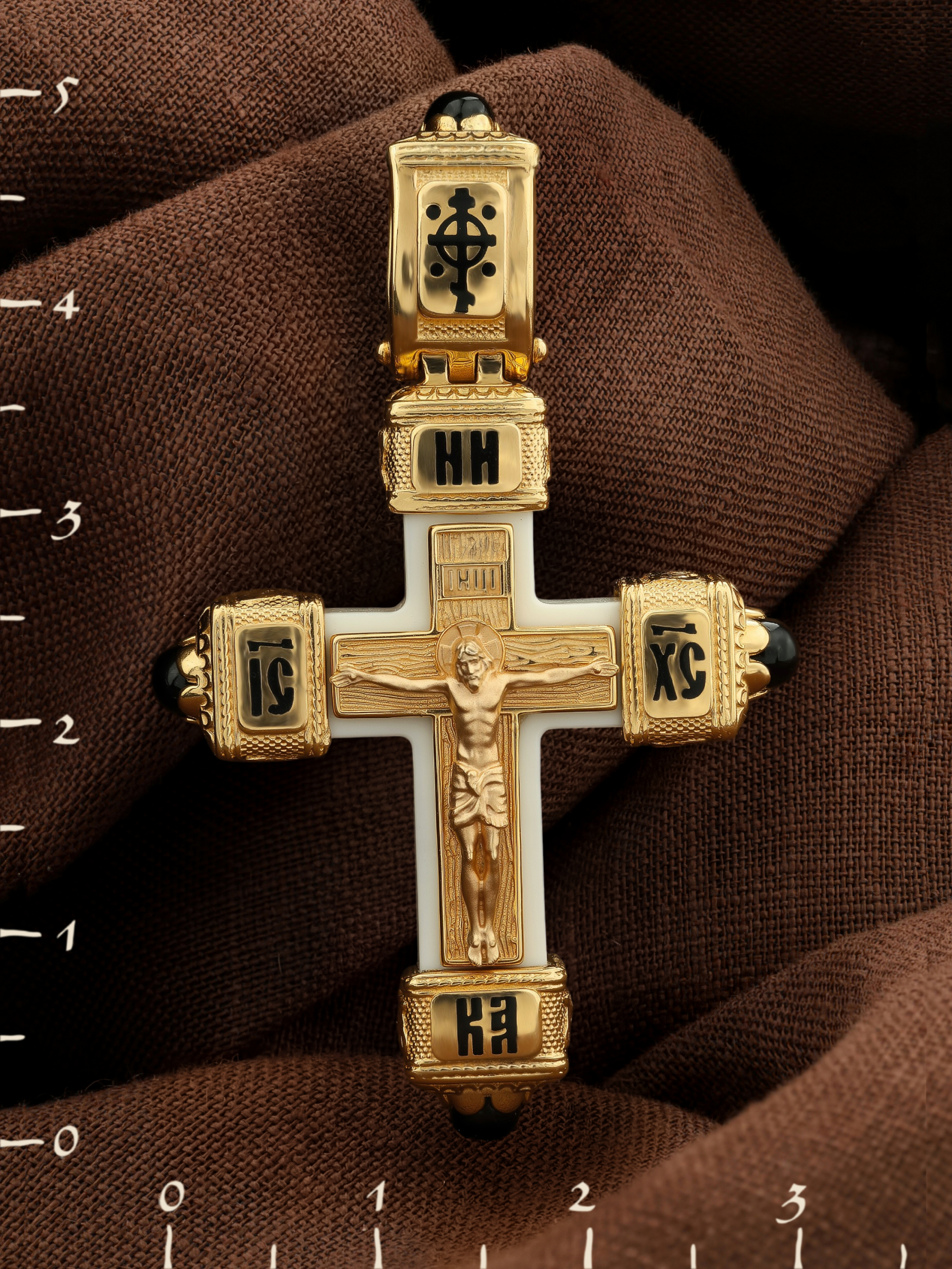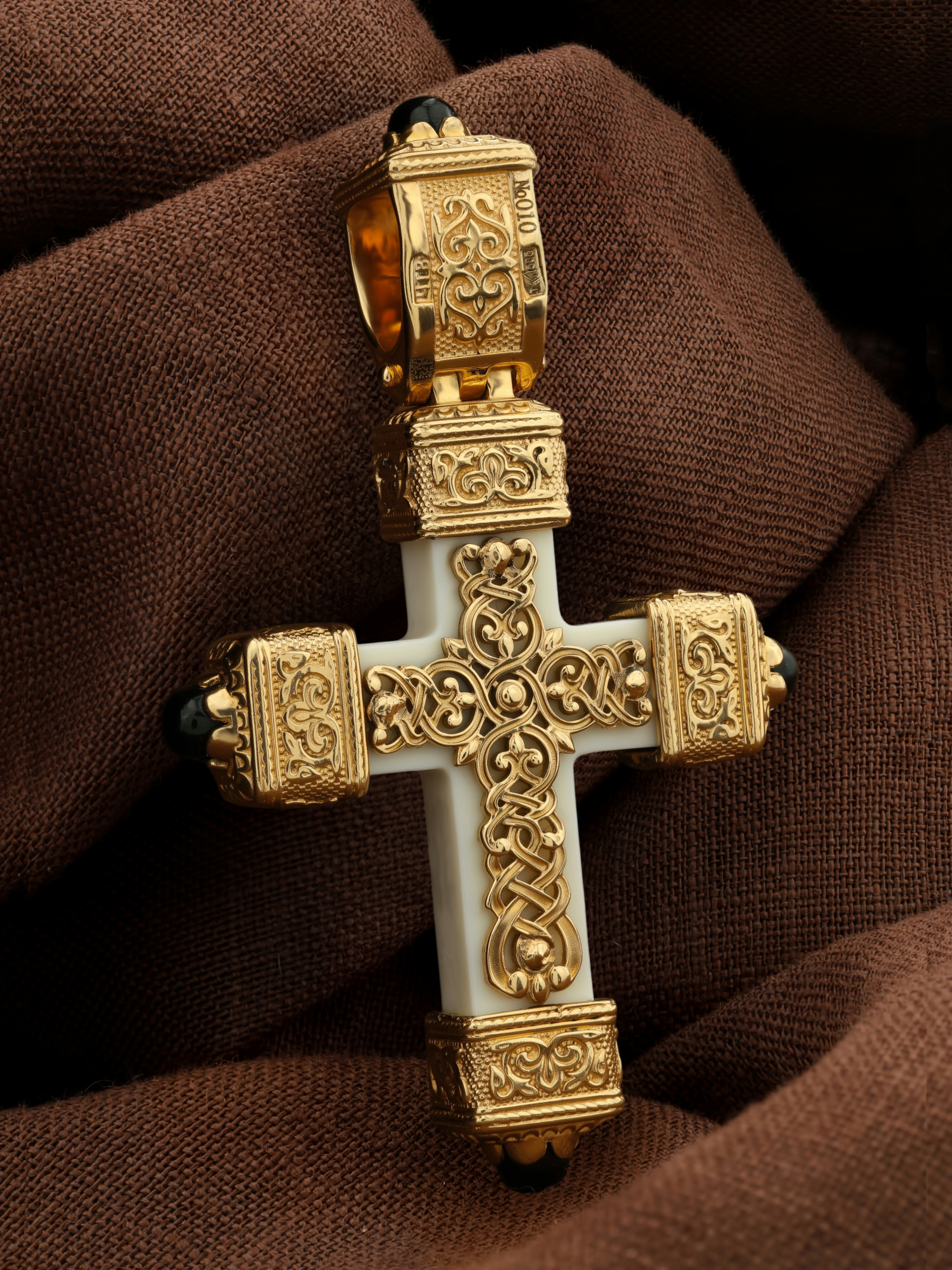Крест из лимонного золота c эмаль, ониксом и бивнем мамонта